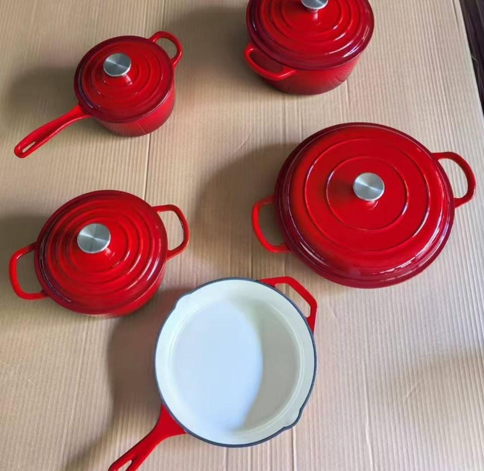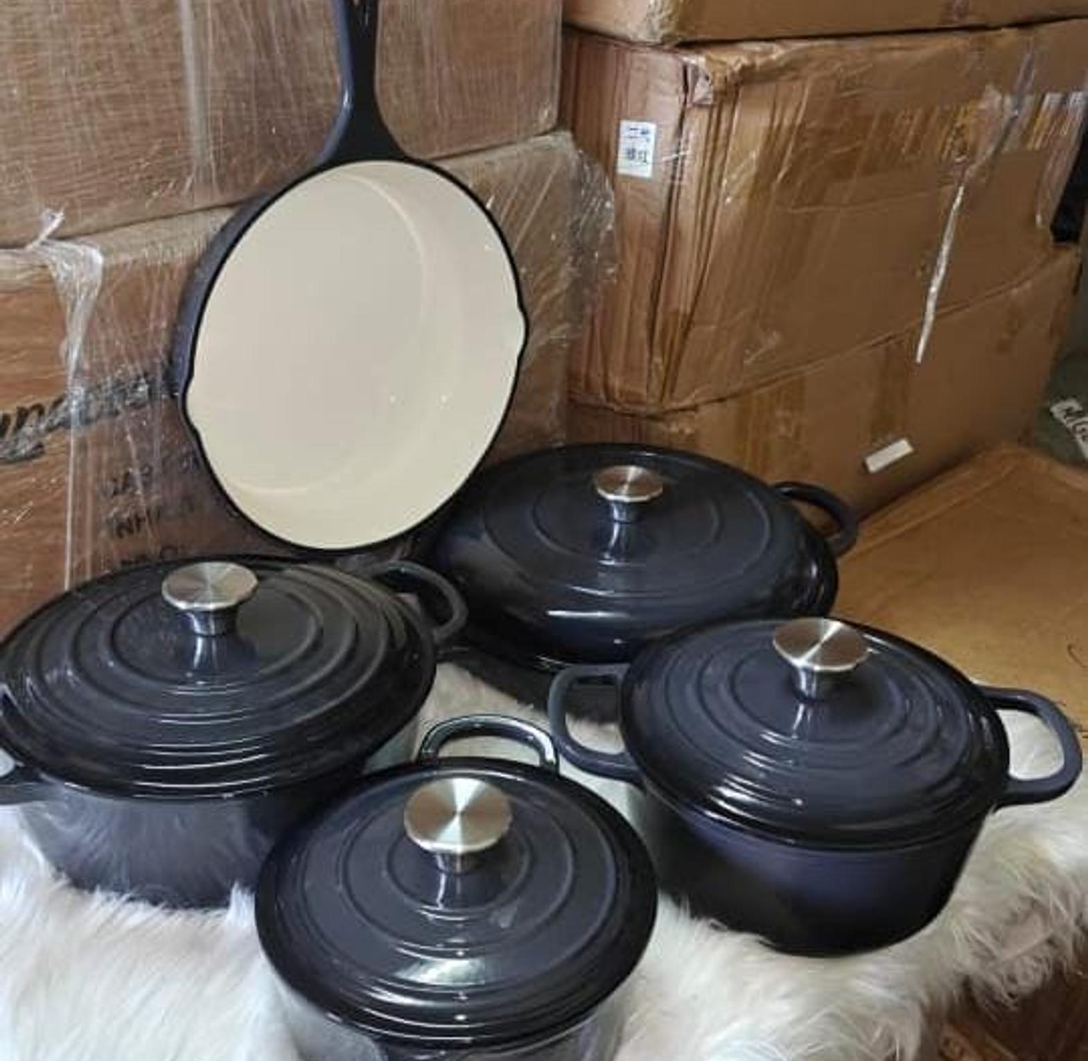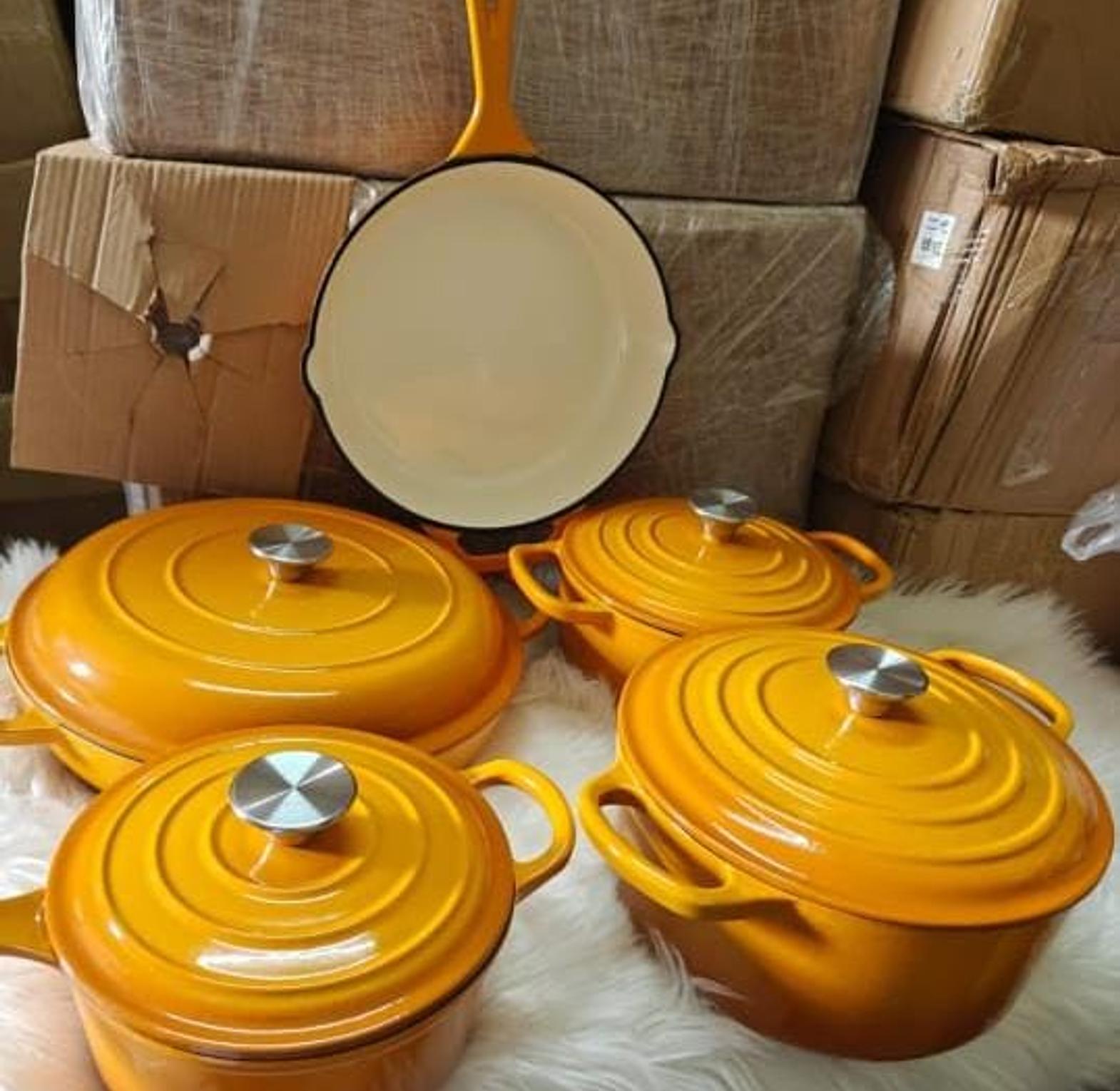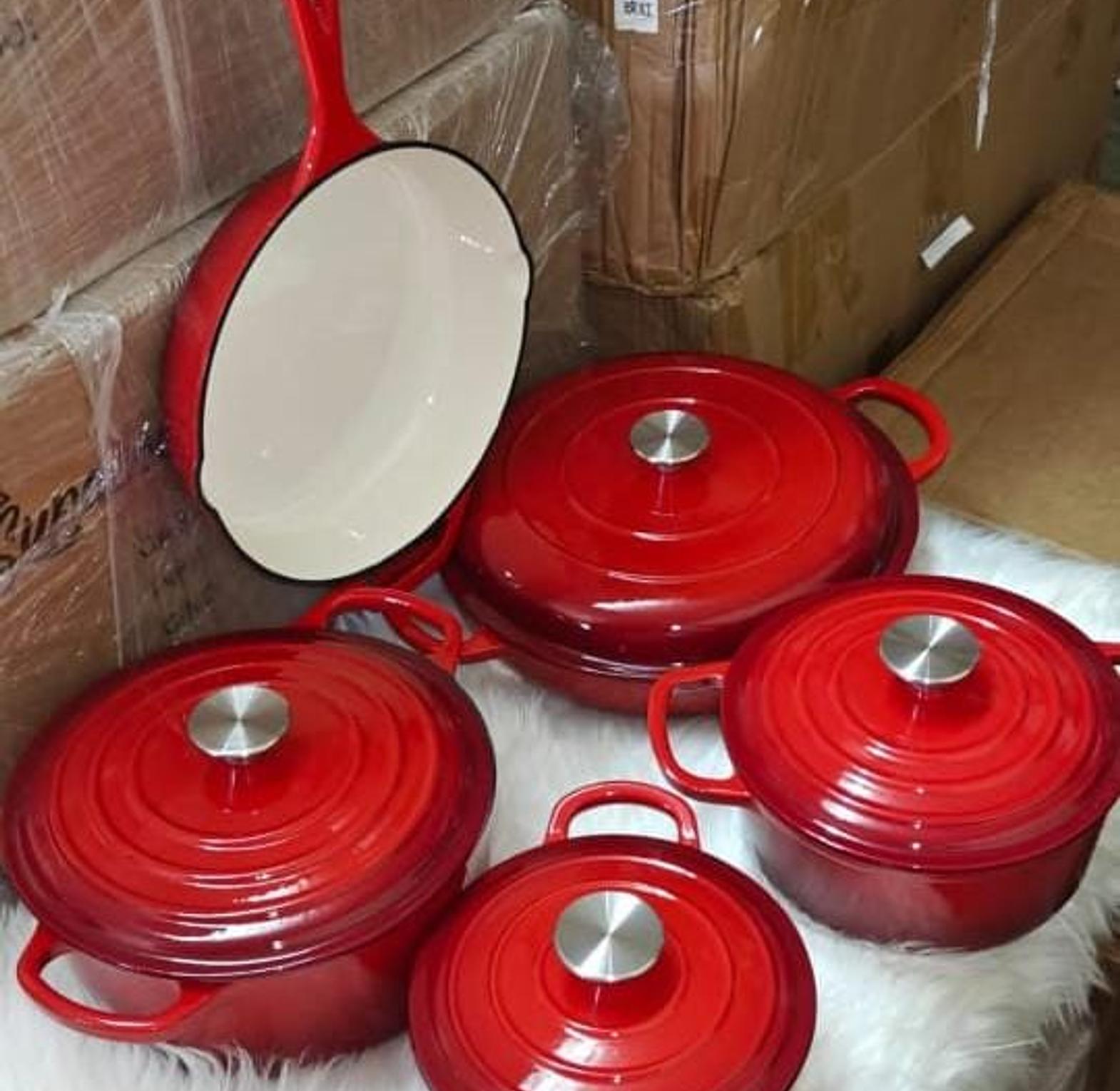 9pcs Enamel Cast iron cooking pots 🔼Heavy ,high quality and durable 🔼Can cook, bake and serve with Cast iron material 🔼 Colours available;Red ,yellow & dark grey CAPACITY; 🔼Casserole 19cm,24cm,26cm and 30cm 🔼Frying pan -- 25cm