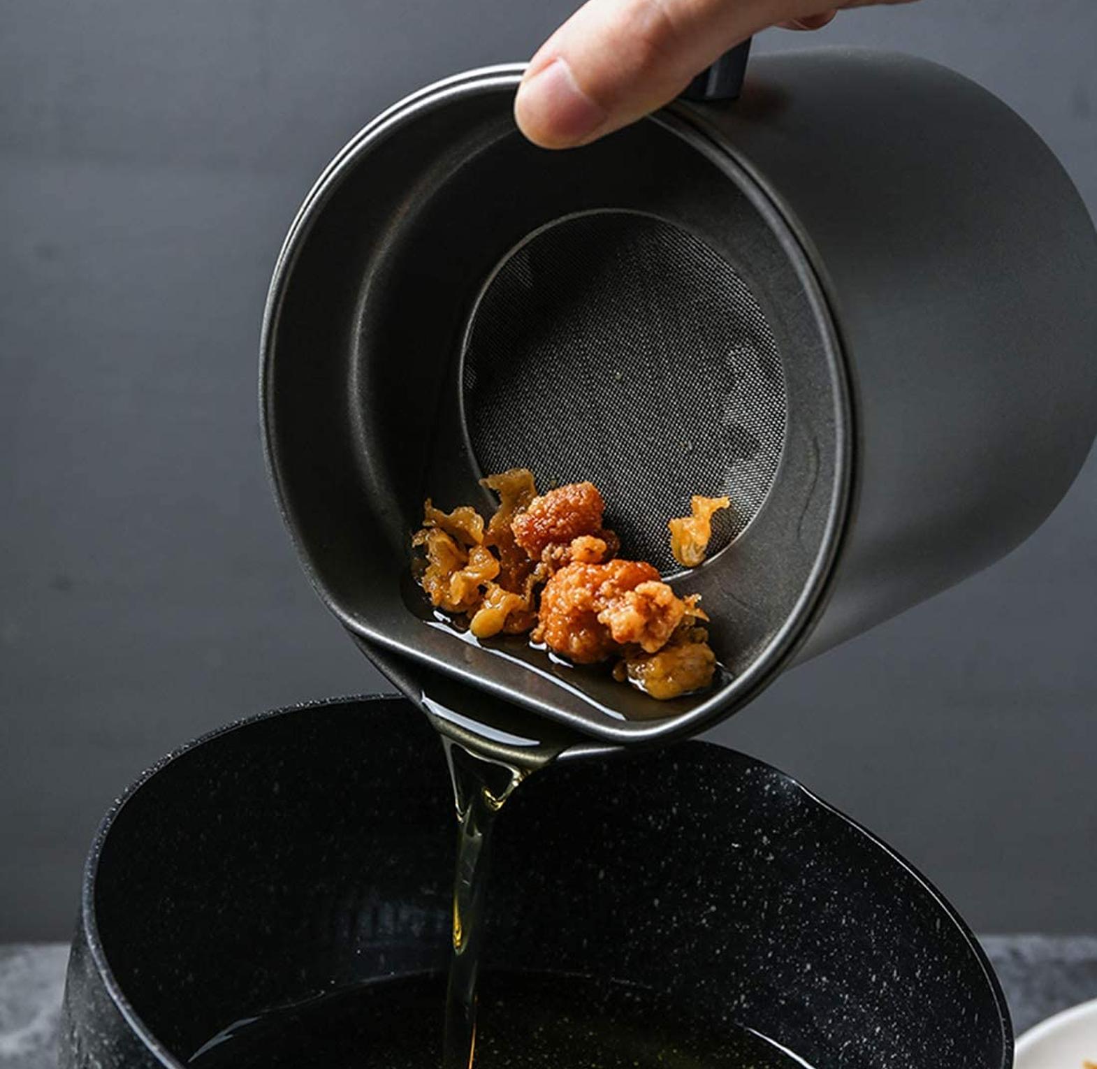 It effectively removes debris, food particles, and impurities from the oil, resulting in cleaner and healthier cooking oil.Innovative features that enhance the straining process.Stamping stainless steel panel obtains strainer,extremely fine filter screen helps us separate food from fat and reduce fat intake.