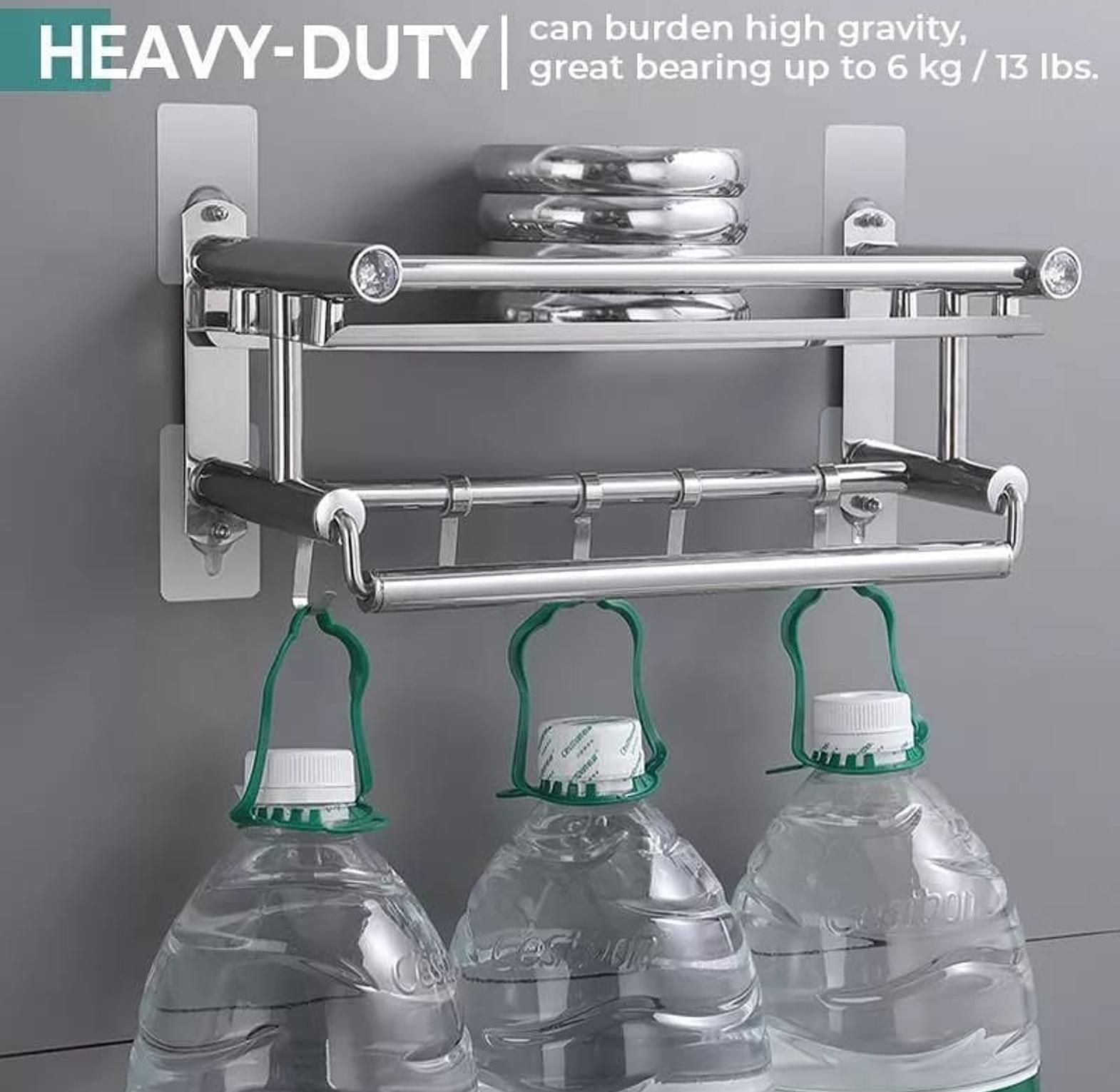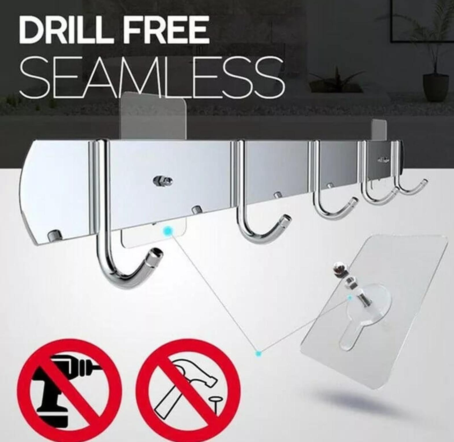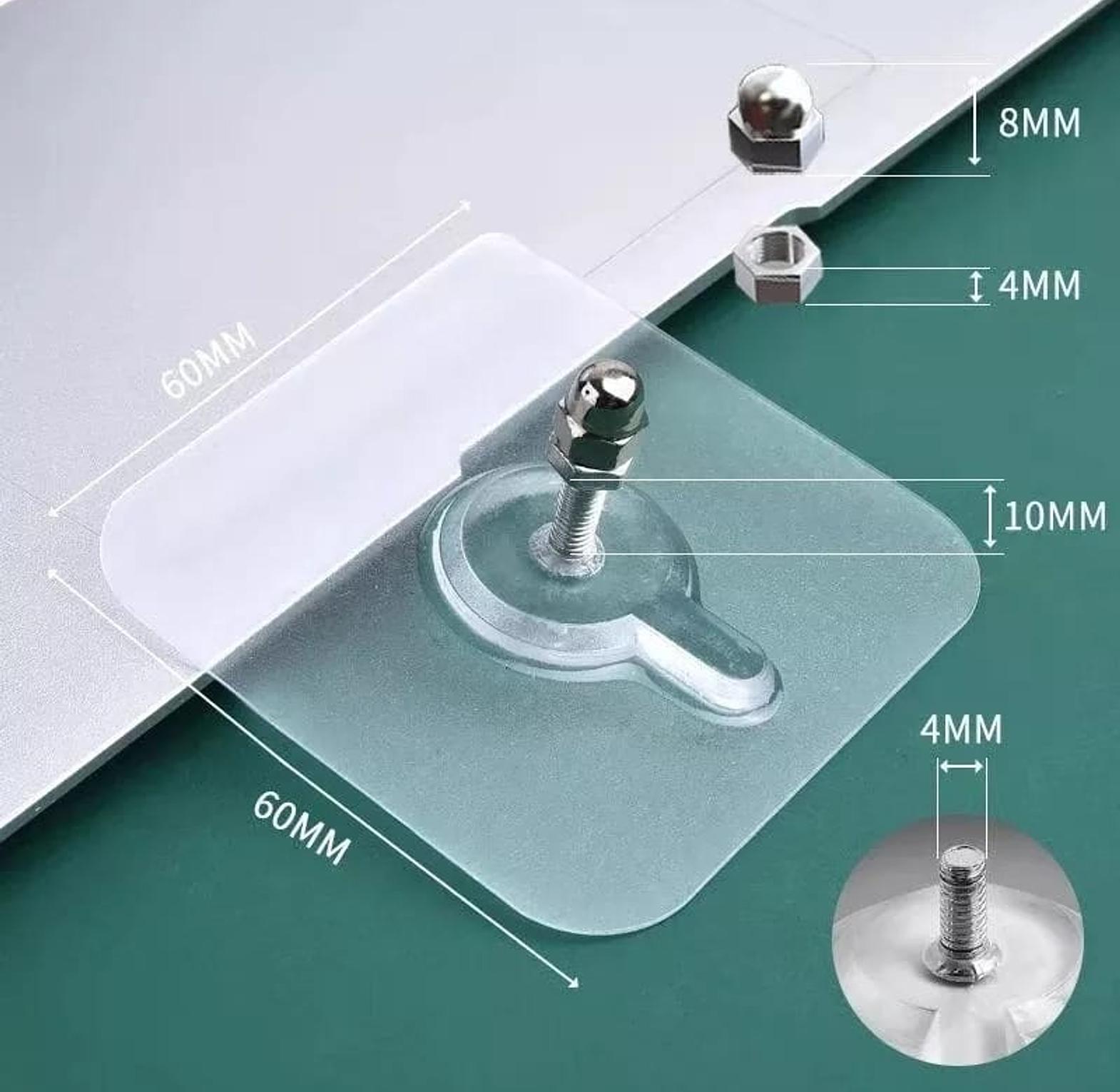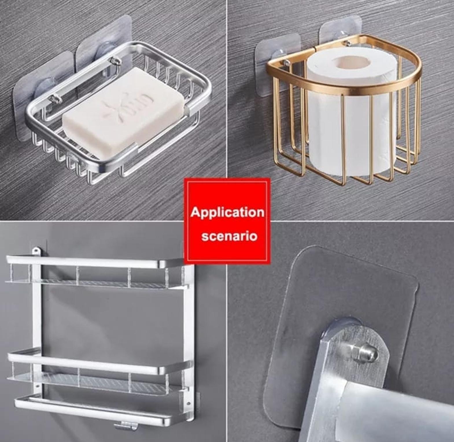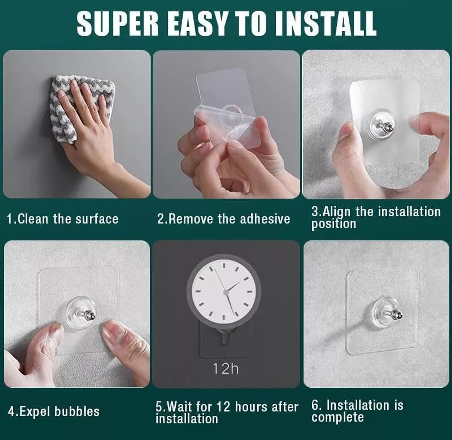 MATERIAL: Stainless Steel, PVC, transparent design makes your home beautiful and clean. 2. NO DRILLING: No drilling needed. Our self-adhesive nails will firmly stick on wall. They're great for mounting shelves, wall organizers, and kitchen racks. 3. EASY TO INSTALL: Wipe up and drywall, and peel off the cover starting from the bulge, then press the hook on a smooth surface for minutes. Easy to clean and reposition without surface damage. 4. SUITABLE FOR WALLS: Works on a variety of surfaces, like wood, tile, ceramic, metal surface, and more, BUT DON'T USE ON PAINTED & PAPER WALL. 5. HEAVY-DUTY: Solid, reliable, waterproof, and oilproof, heavy-duty can burdens high gravity, great bearing up to 5kg, It can support heavy items regardless of their material.