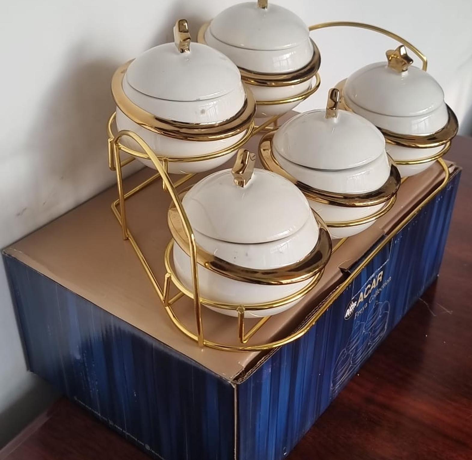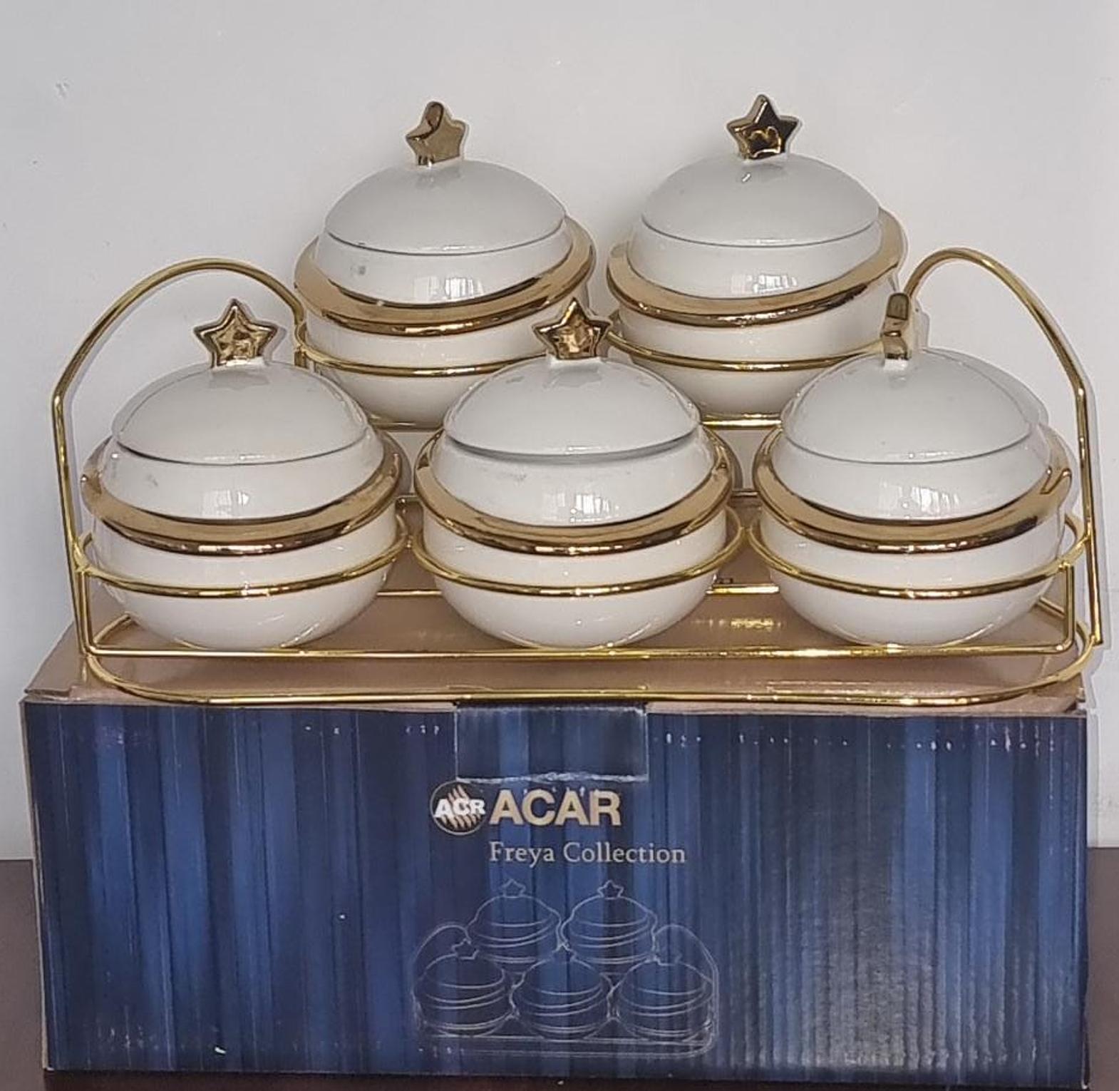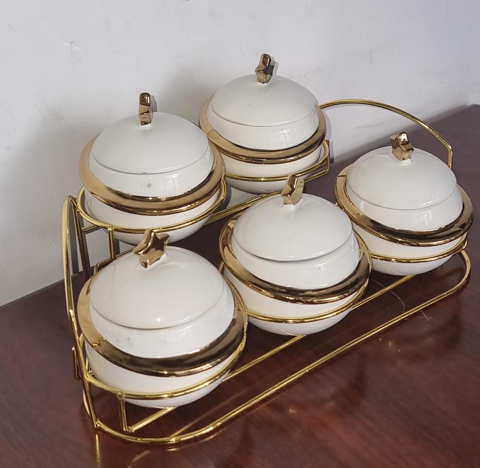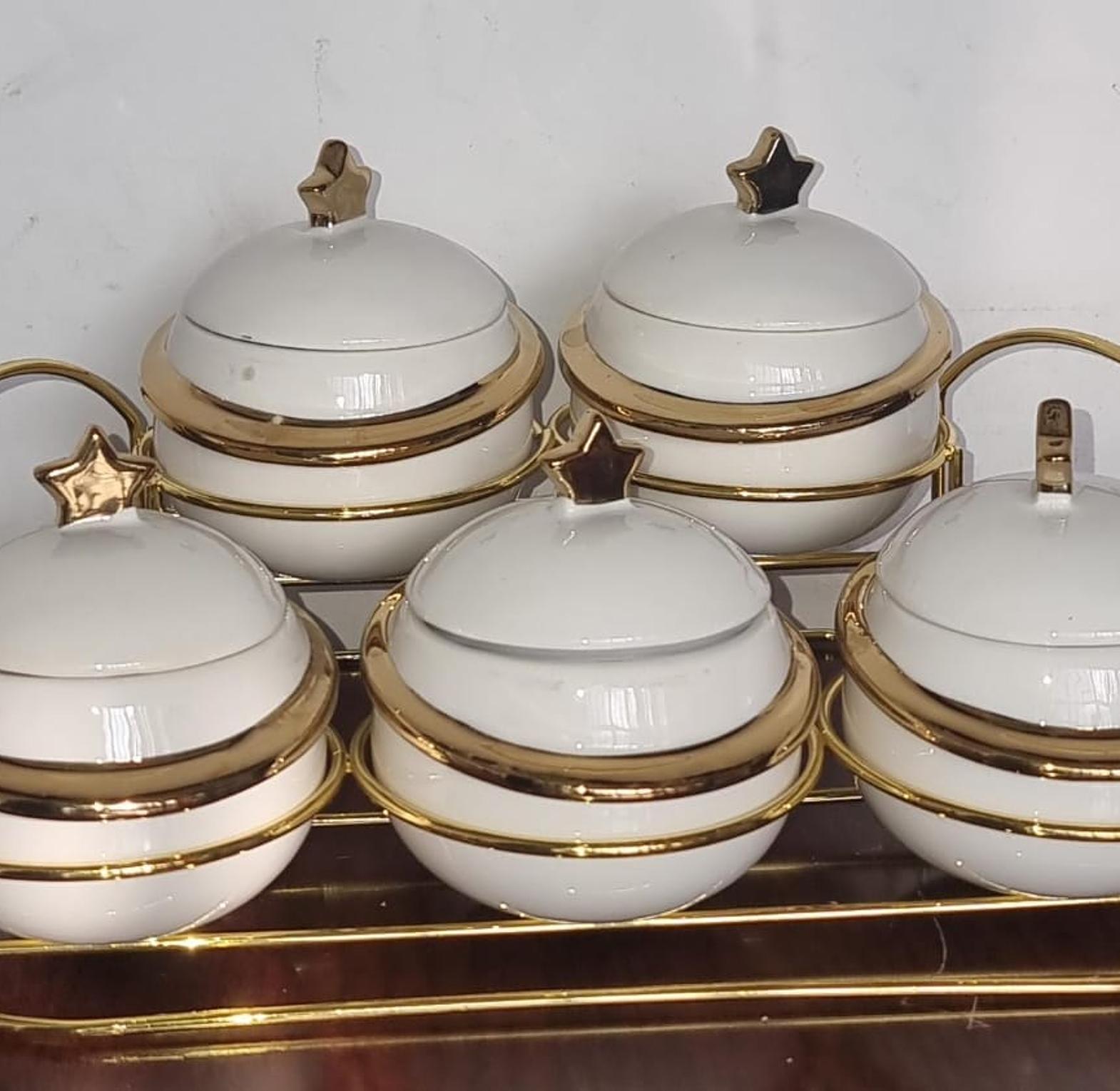 Exquisite Design and elegant Condiment Bowl Jar❤:Made of high quality ceramic,eye-catching shape,cute pot with lid, set of 5 pottery canisters suit for your different needs,without making a mess in kitchen,the glamorous color porcelain will complement any home decor ❤Multifunctional Spice Ceramic Containers❤:You can store salt,pepper,chili,dried herbs,sauces,ketchup, mustard,mayonnaise,ice cream toppings,fruit,coffee,sugar,pickles or veggies in our multipurpose jars,especially perfect for sauces and dry spices ❤Convenience for Kitchen and Restaurant❤:The thoughtful design adds each storage container a spoon and removable lids to prevent from moisture and dust. Along with same color base tray to organize your spice jars in place.easy to clean and their holding tray is a practical perk,packing including 6pcs label stickers that can be attached to the bottle for easy use and personalize your condiments jar