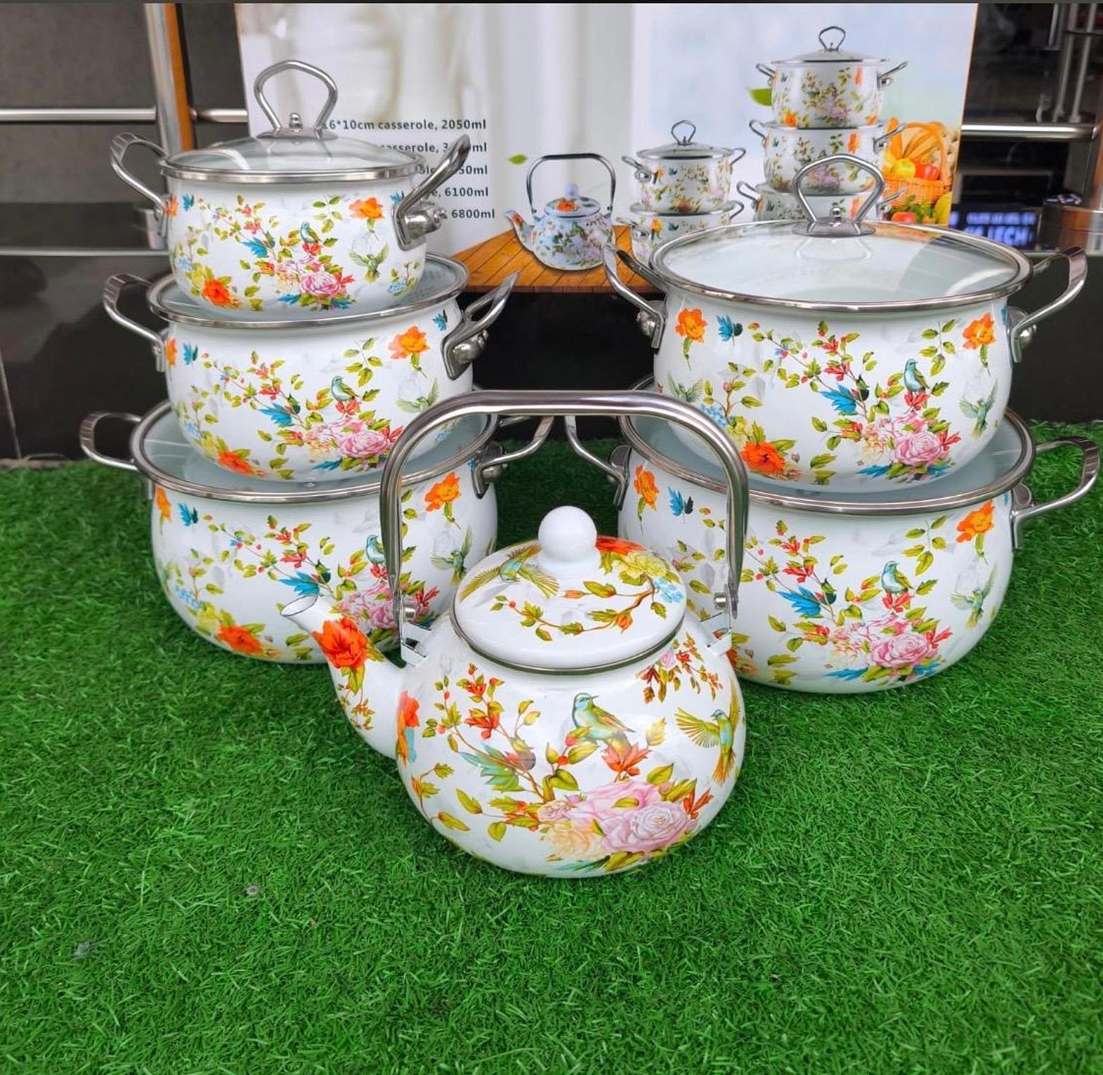 12 pc original ENAMEl cooker ware set With kettle 16#10cmc casserole 2050ml 20@12cm casserole 3800ml 22@13cm casserole 4850 ml 24@14cm casserole 6100ml 26@15cm casserole 6800ml 2500 ml kettle