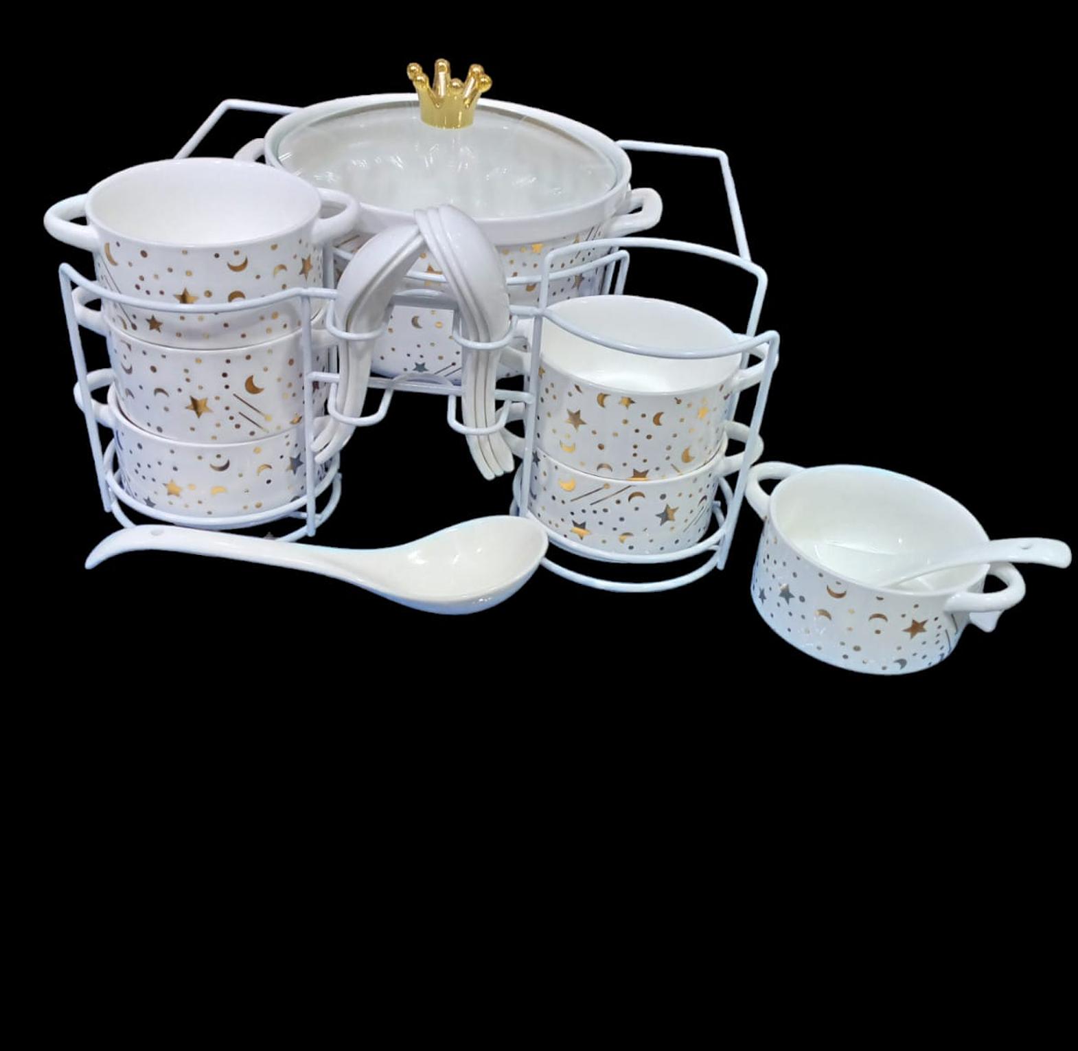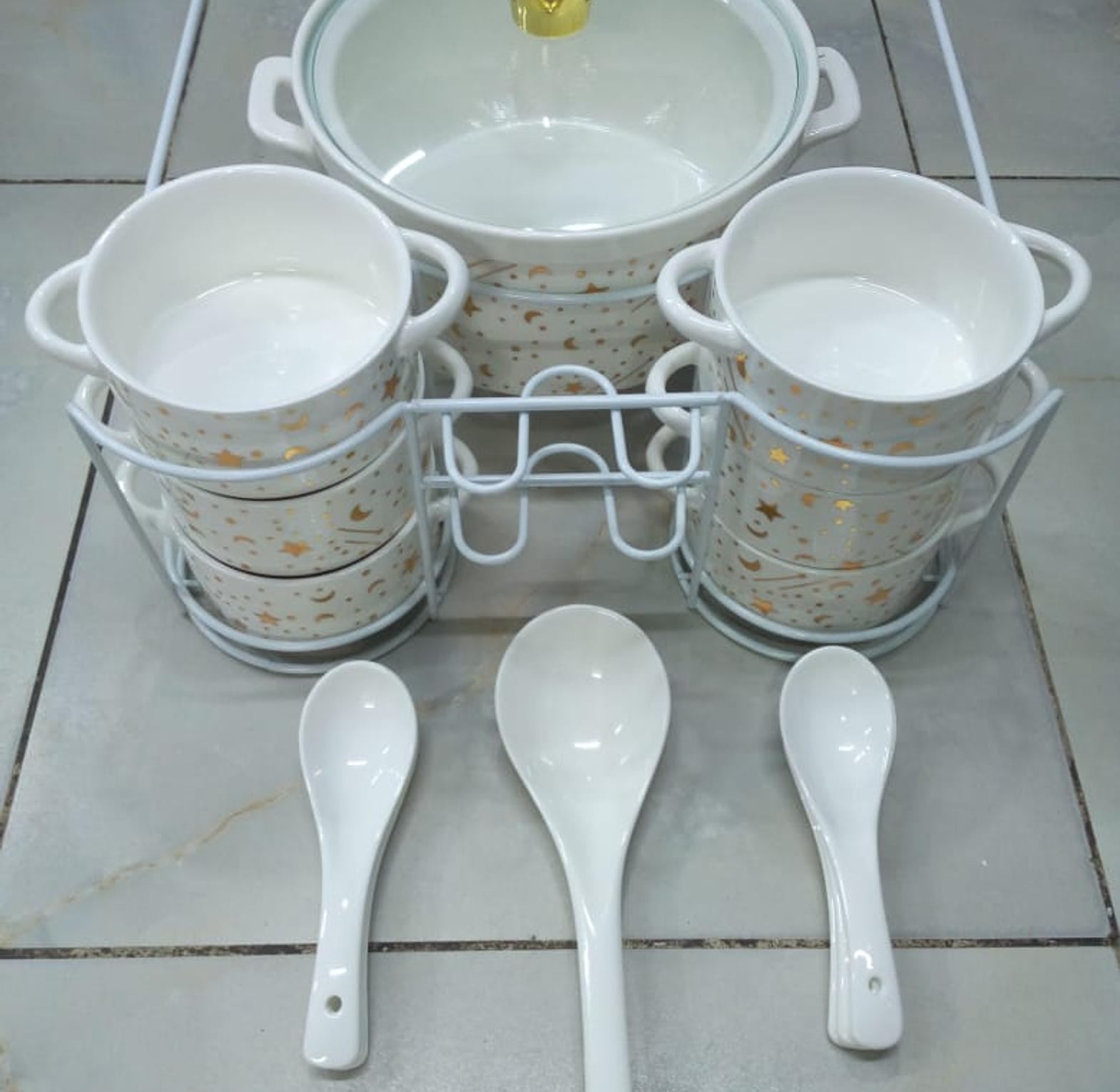 contains 6 soup bowls 6 spoon 1 big bowl 1 serving spoon stand