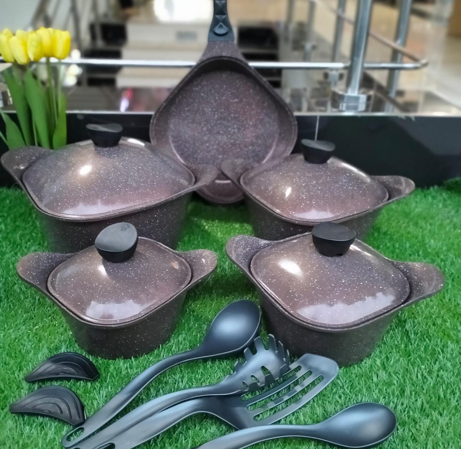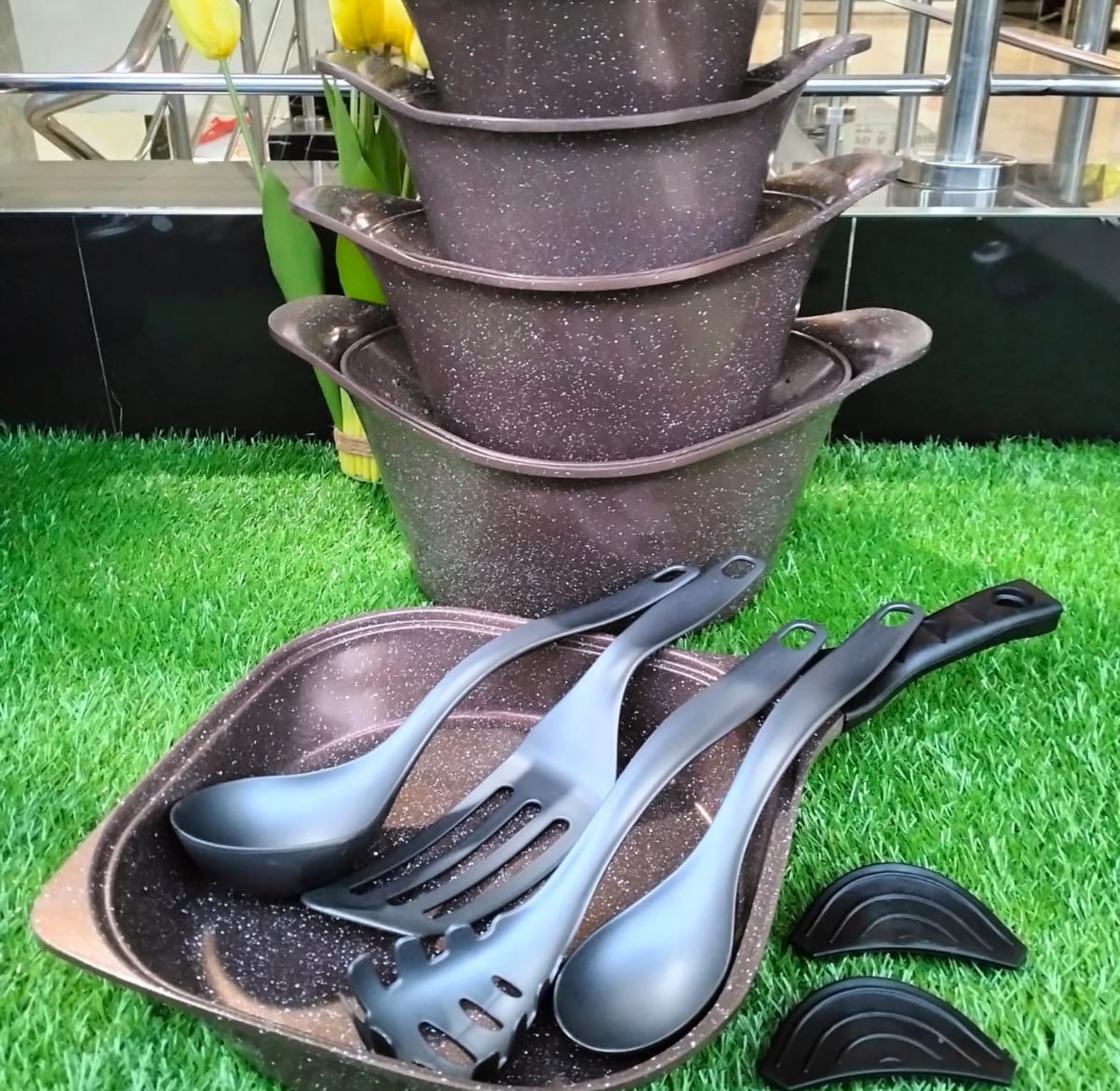 15pcs Die cast Cookware Set ▶️Extra heavy,High quality and Durable ▶️Cook and Serve CAPACITY; ▶️Casserole 20cm,24cm,28cm and 30cm with there lids ▶️Frying pan -- 24cm ▶️Comes with 4pcs of servin spoons and 2pcs of silicons