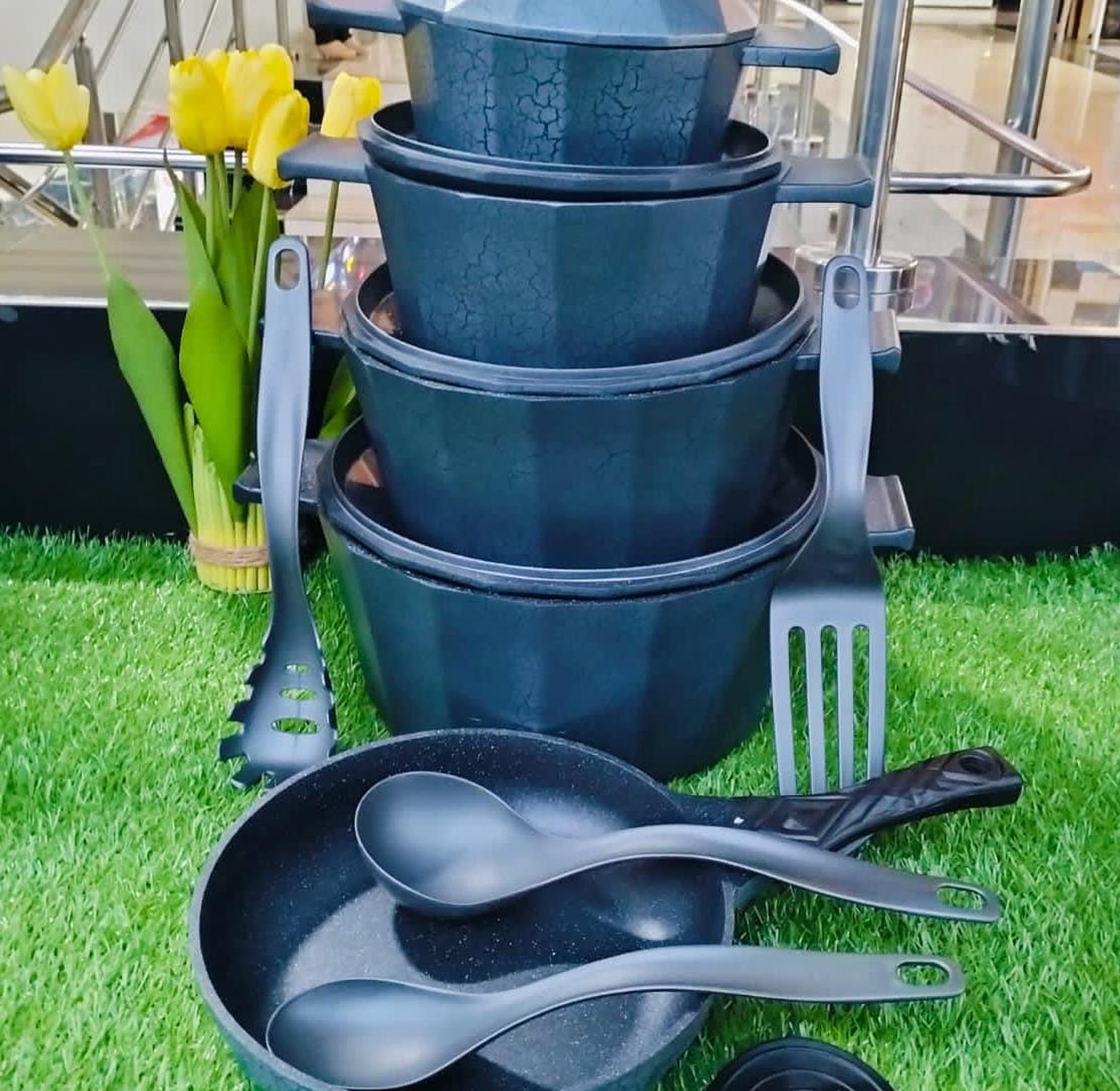 15pcs Die cast Cookware Set ▶️Extra heavy,High quality and Durable ▶️Cook and Serve CAPACITY; ▶️Casserole 20cm,24cm,28cm and 30cm with there lids ▶️Frying pan -- 24cm ▶️Comes with 4pcs of serving spoons and 2pcs of silicons