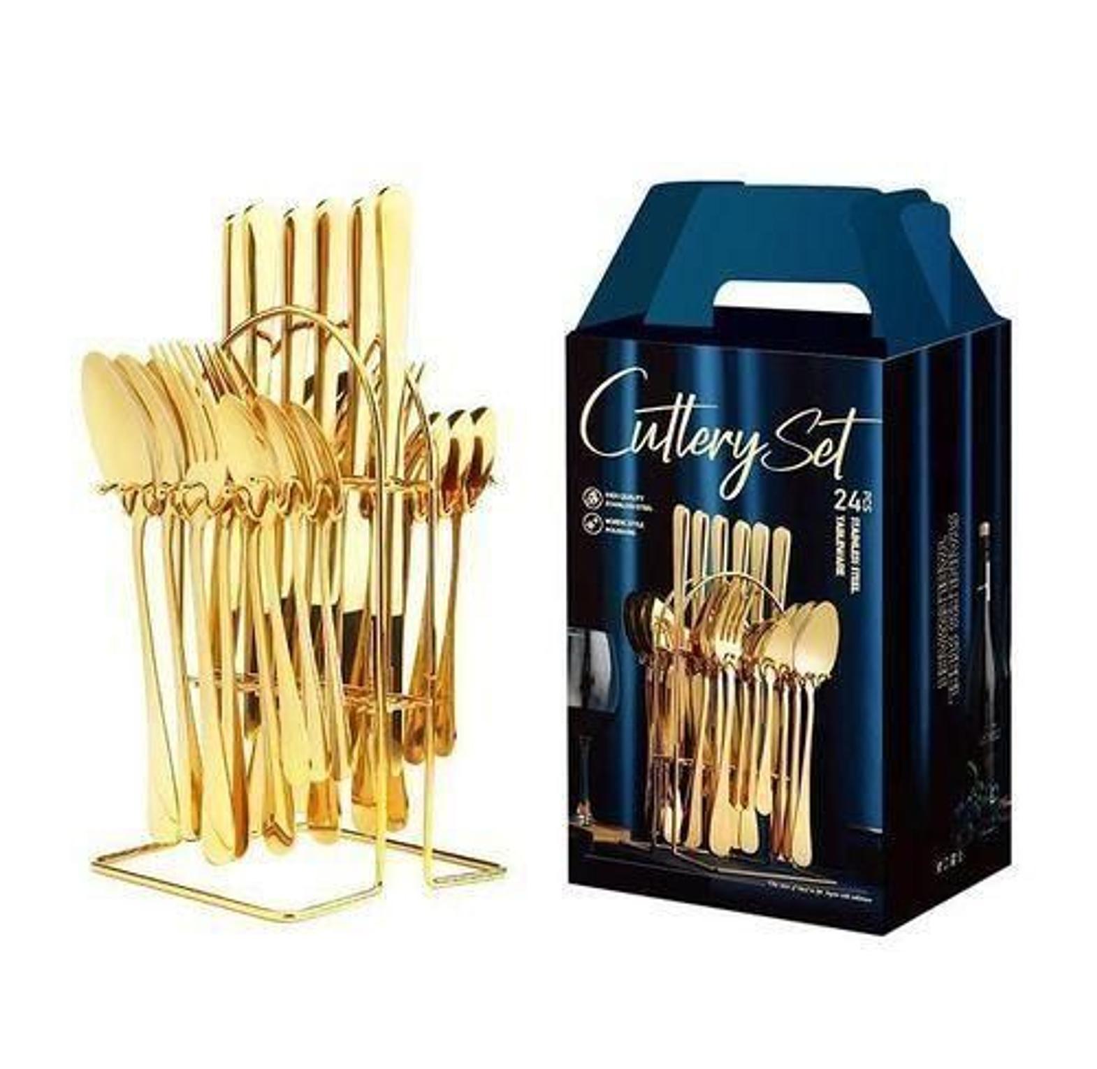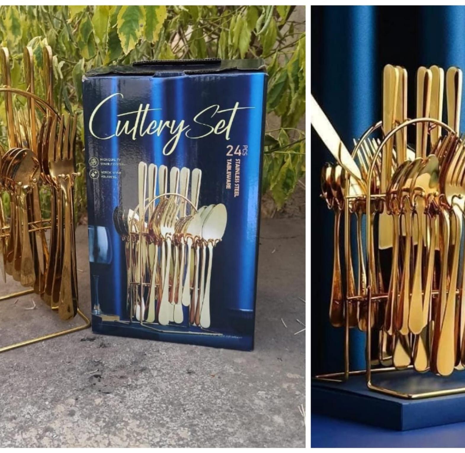 Material: Stainless Steel Pattern: Solid & Patterned Number of Pieces: 24 (6-table spoons, 6-tea spoons, 6-forks, 6-butter knives) Dish washer safe: Yes Ideal for home, office, restaurants, hotels and other eateries