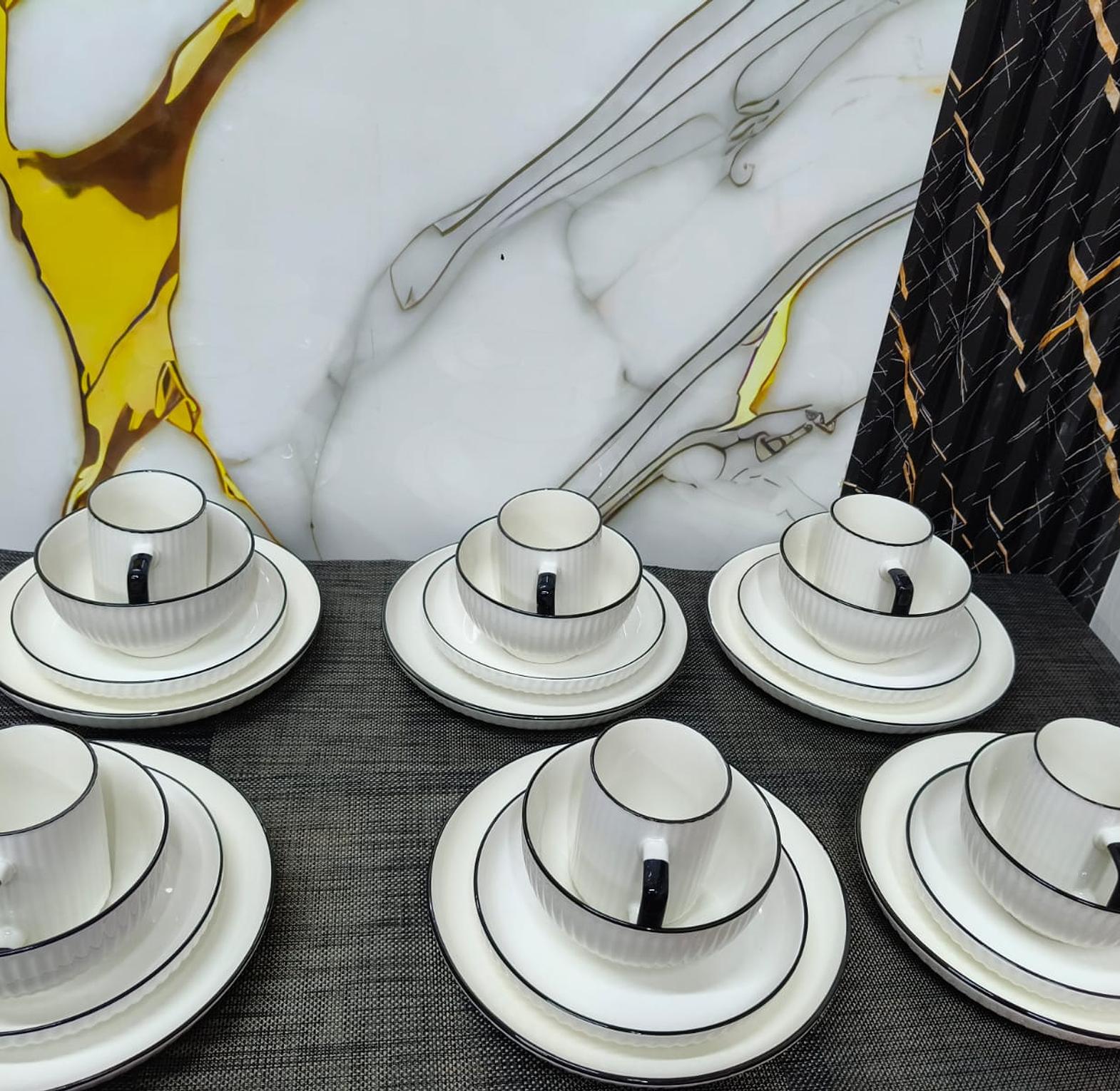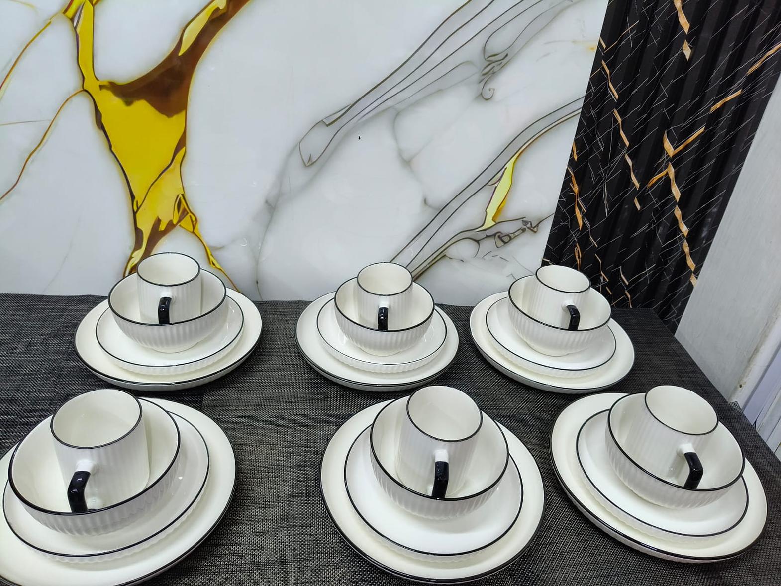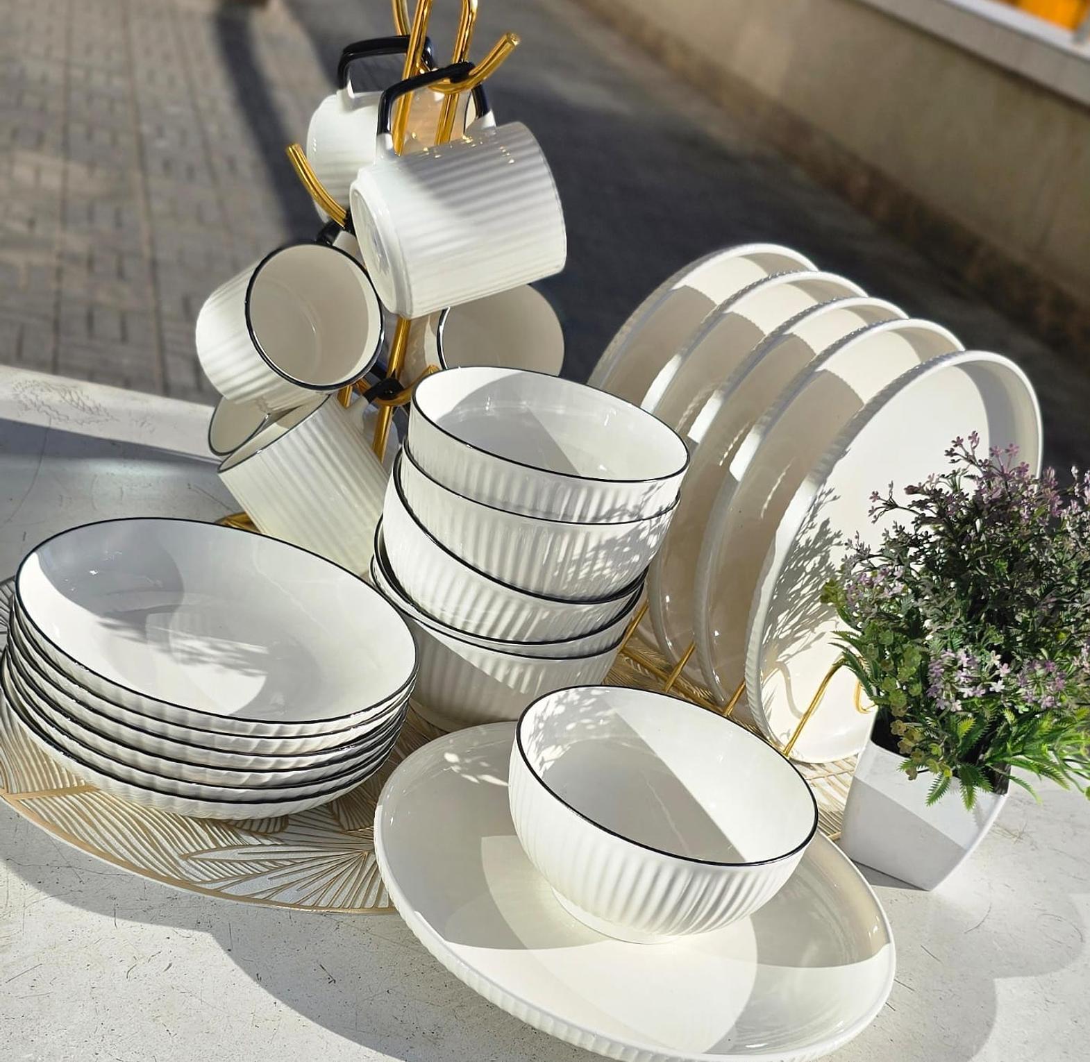 Bring timeless charm and sophistication to your dining table with this stunning 24-piece ribbed ceramic dinnerware set. Designed with a sleek ivory finish and accented by a bold black rim, this set effortlessly combines modern minimalism with classic elegance. Perfect for daily use or special occasions, it's a stylish addition to any kitchen.