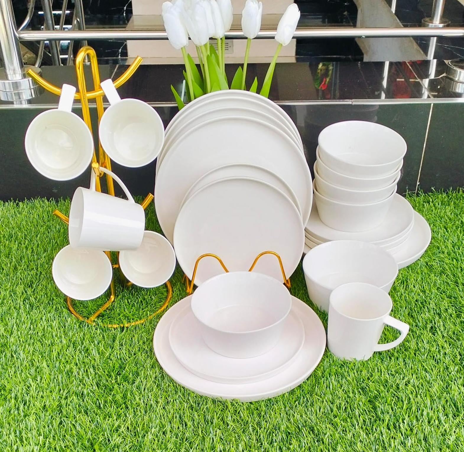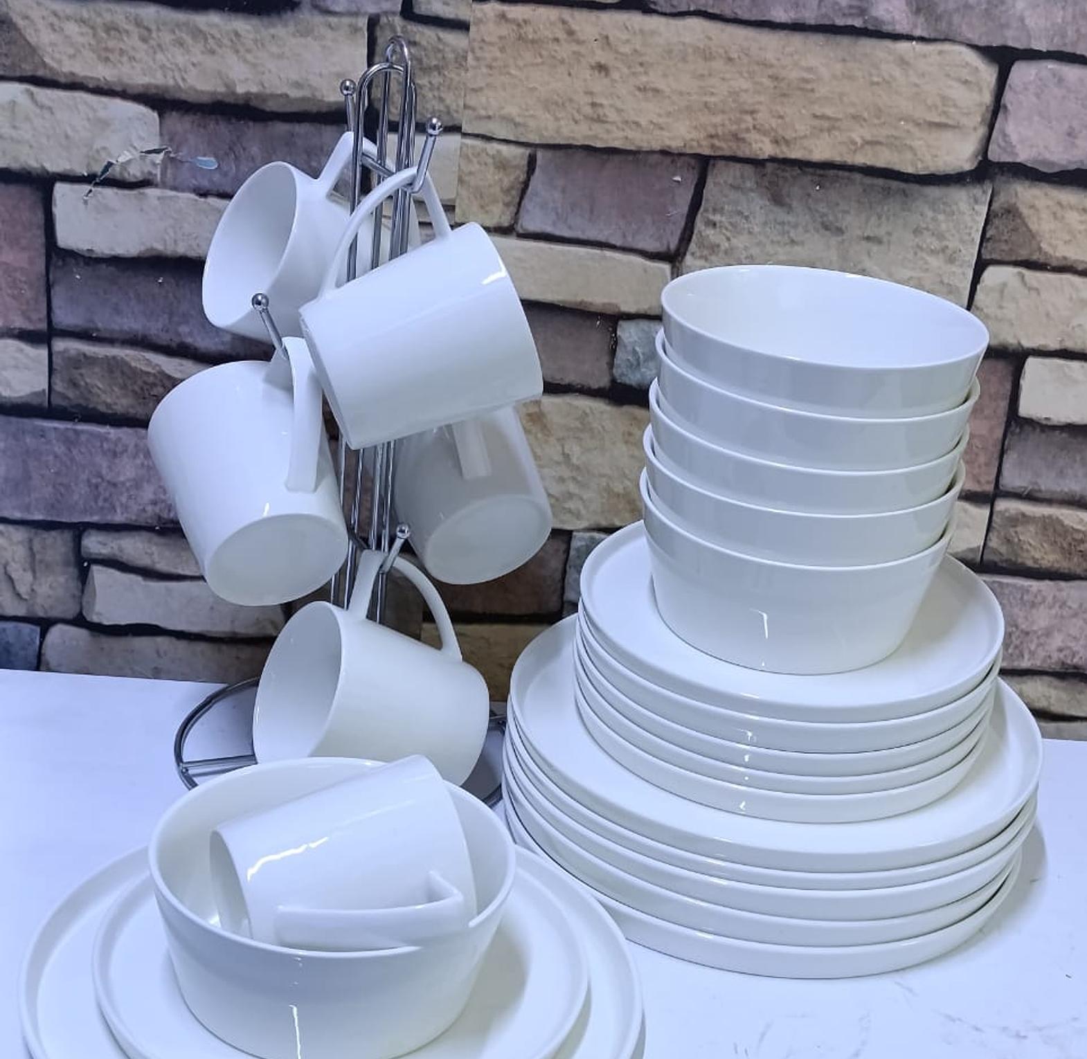 Dishwasher, microwave and freezer safe. Quality high fired ceramic provides stain resistant and easy cleaning. Package Contents: 6 X DINNER PLATES 6X SALAD PLATES 6X CEREAL/SOUP BOWLS 6X CUPS