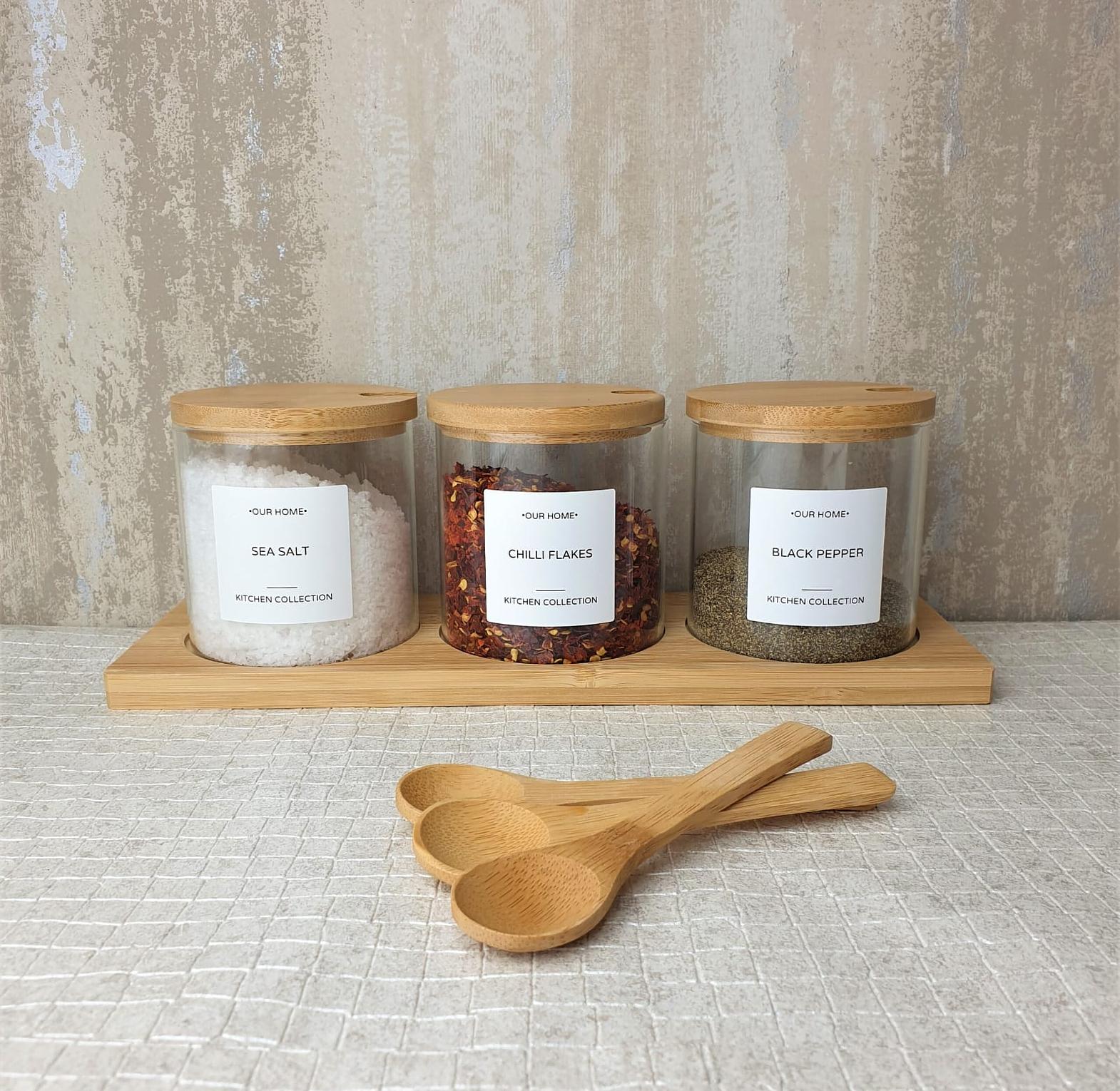 Quality Materials: Condiment container box is made of high borosilicate glass, more durable and easier to clean. A transparent bottle surface makes it easy to distinguish the types of seasoning. The tray, lid, and spoon are made of natural bamboo and wood, adding a classy look to your kitchen, café, buffet, etc. Exquisite Details: A notch design on lid to nicely store the spoon so that you can pick and place the right amount of spice at any time; the semi-sealed lid is helpful in preservation from dust and moist. Sturdy bamboo base has three crafted non-slip slotted spaces to hold condiment canisters, keeping kitchen always in tidy. For Storage & Displays: Delicate life begins from condiment, and our condiment jar can help in nice preservation, storing salt, pepper, chili, sauces, sugar, spice, beans, millet, and other condiment you have, at the same time it is a classy decorative displays set, being an elegant existence in life.