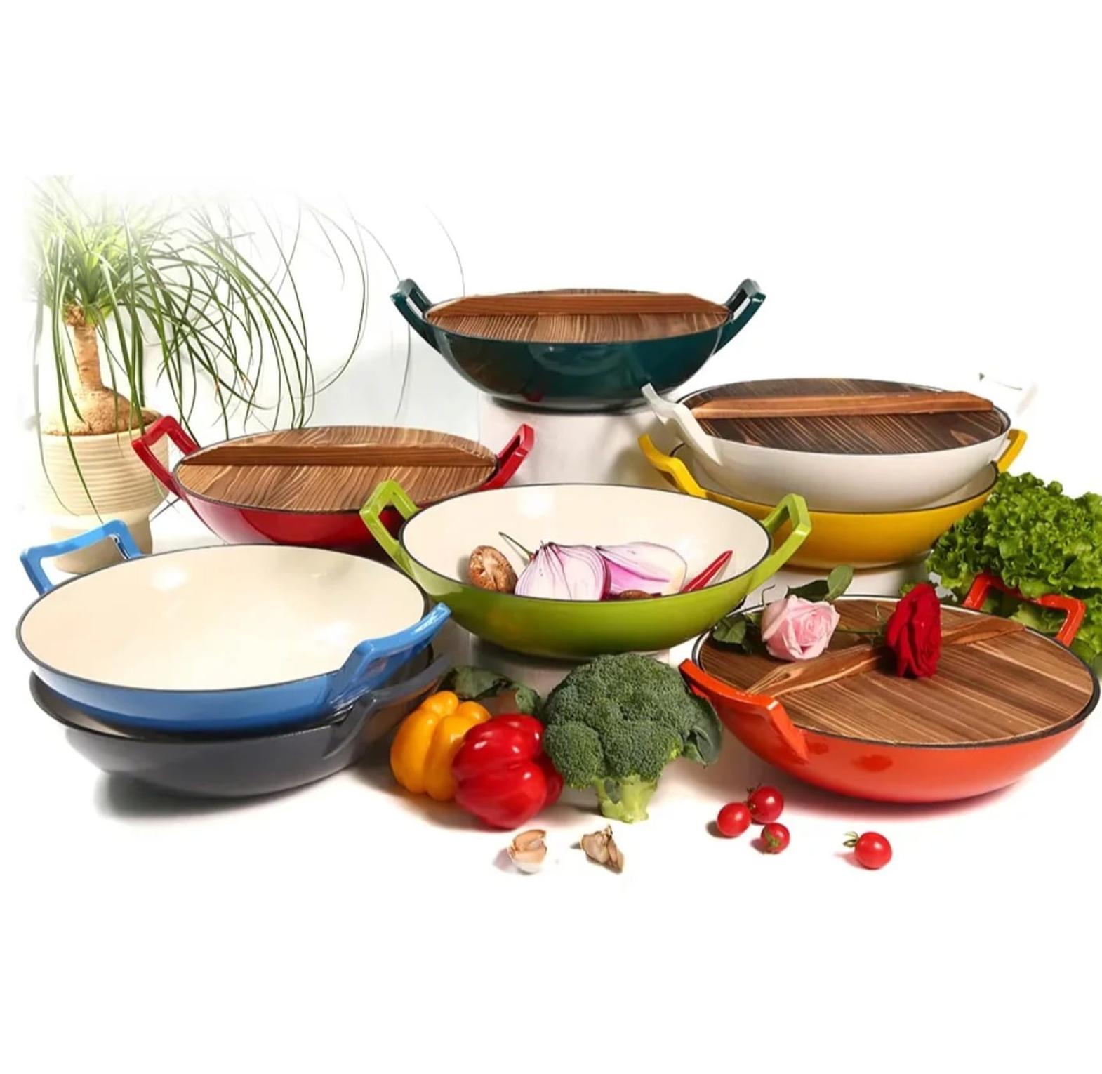 36cm Non-stick Enameled Cast iron Wok pan with wooden lid. ✴️A wok pan is a versatile cooking vessel for designed for Stir-Frying braising steaming Deep frying etc.. ✴️Available in 3 Colours Red, White & Orange.