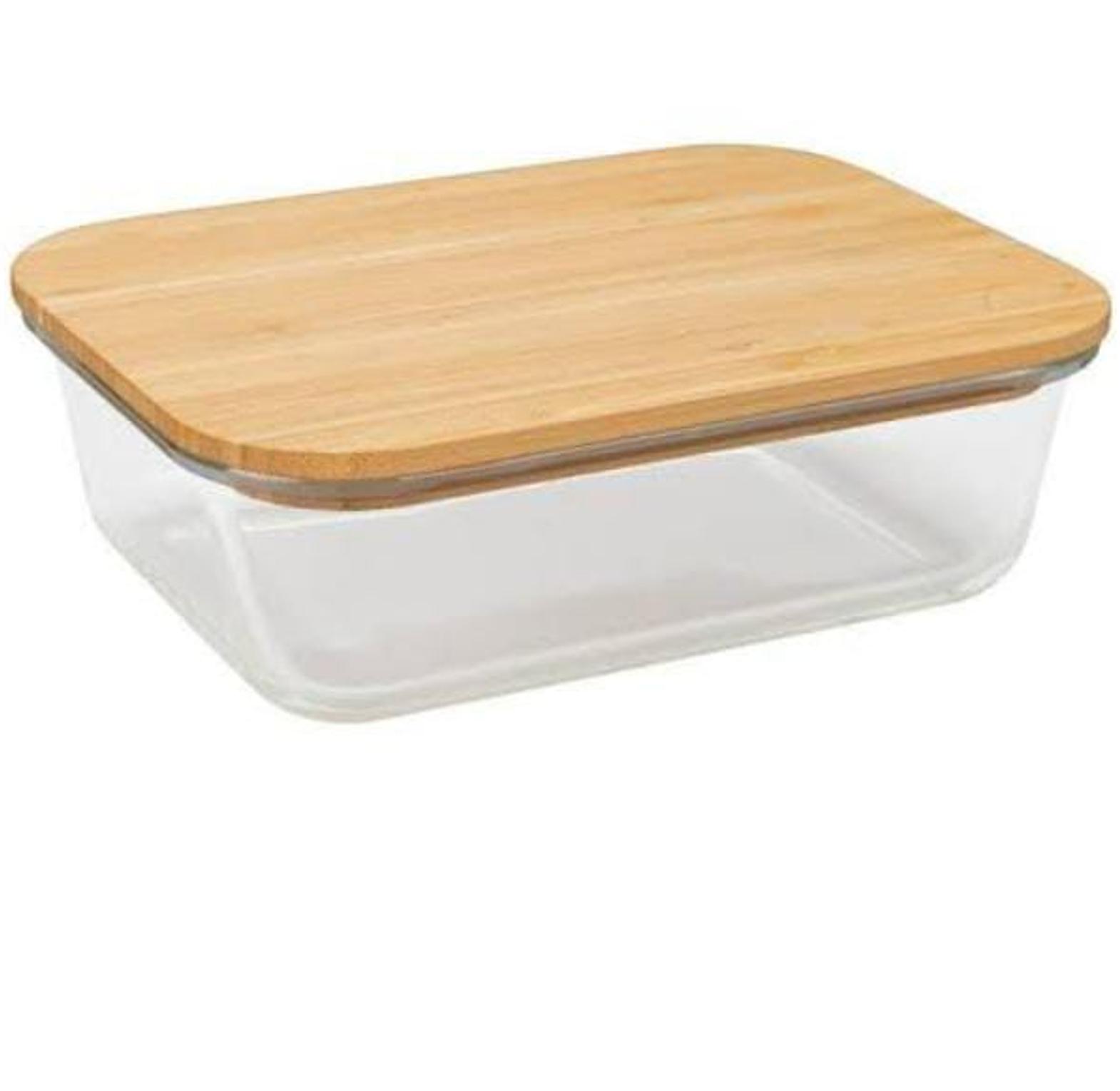 Borosilicate food container with bamboo cover Weight 1060g. This food storage container made of heat-resistant borosilicate glass is used to keep food organized. The food storage containers, they stay fresh for longer, preserve the taste and there are no unpleasant odors.