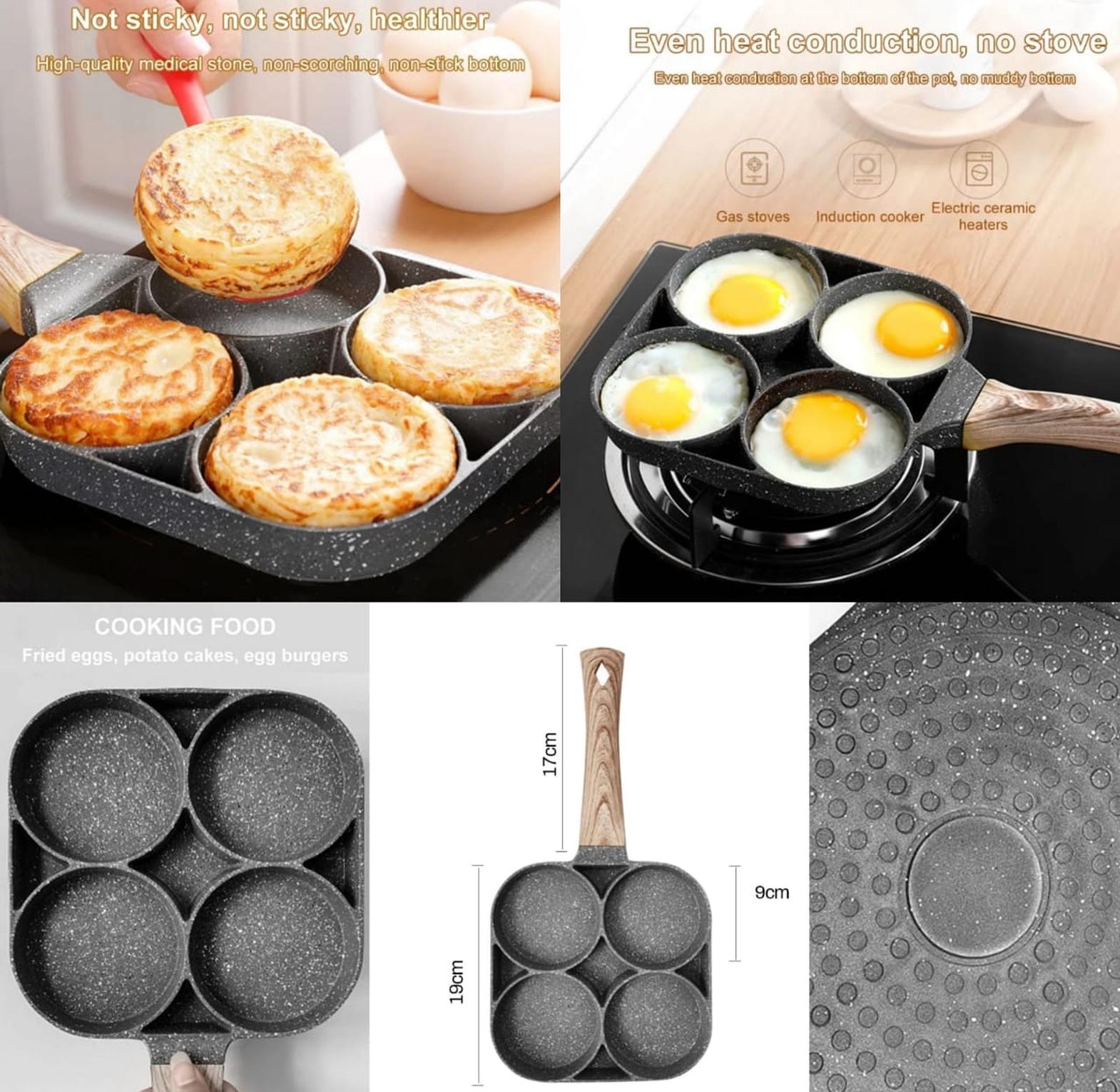 Four-Hole Frying Pot Pan ➖Material: Aluminum alloy + bakelite ➖Measurements: 19 × 17 × 9cm ➖single hole size: 🕳 9cm diameter and 2.2cm depth ➖Uses: fried eggs, burgers, thickened Omelets ➖Marble Non-Stick properties ➖Application: Induction cooker, stove, gas cooker, electric cooker