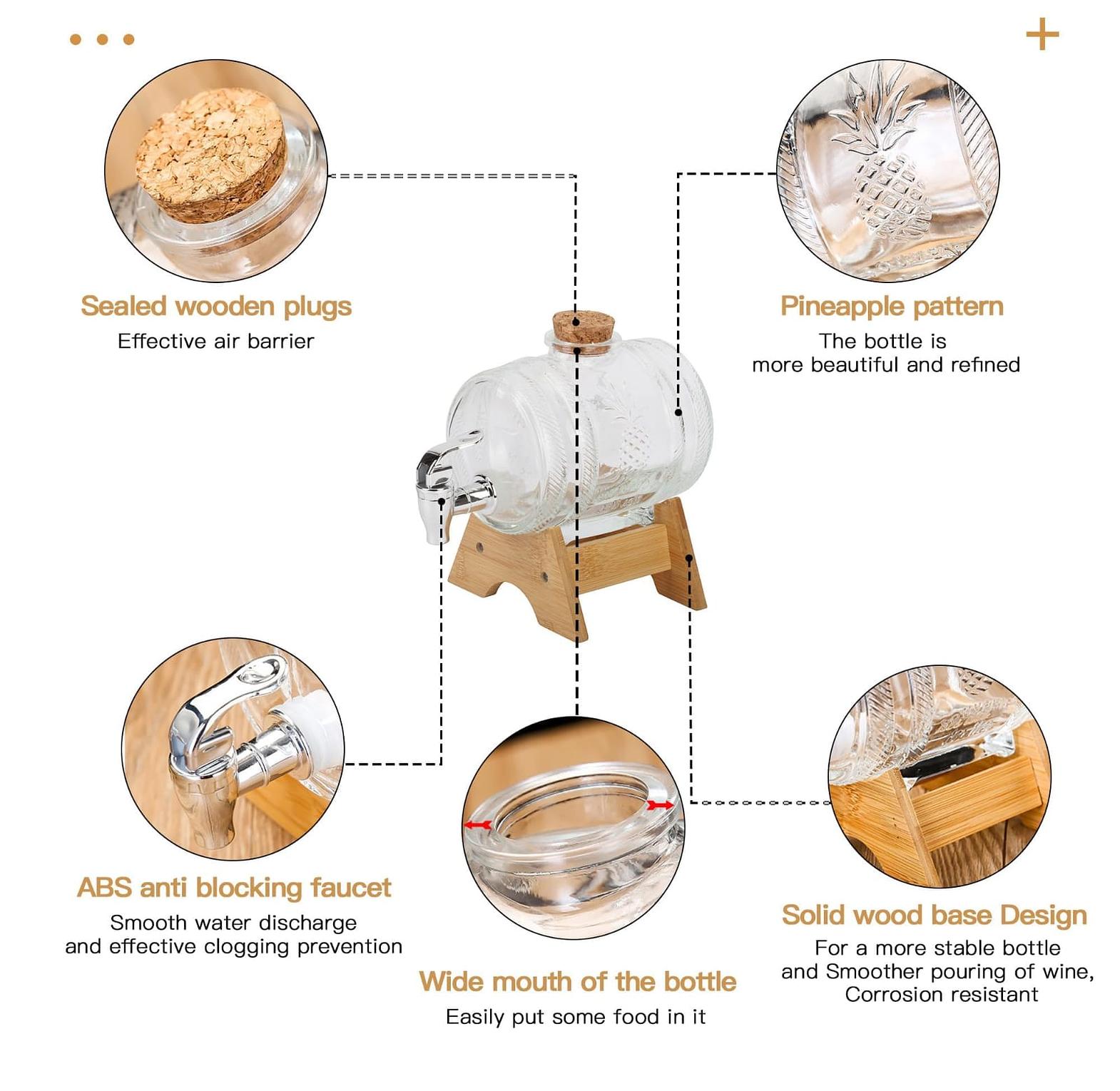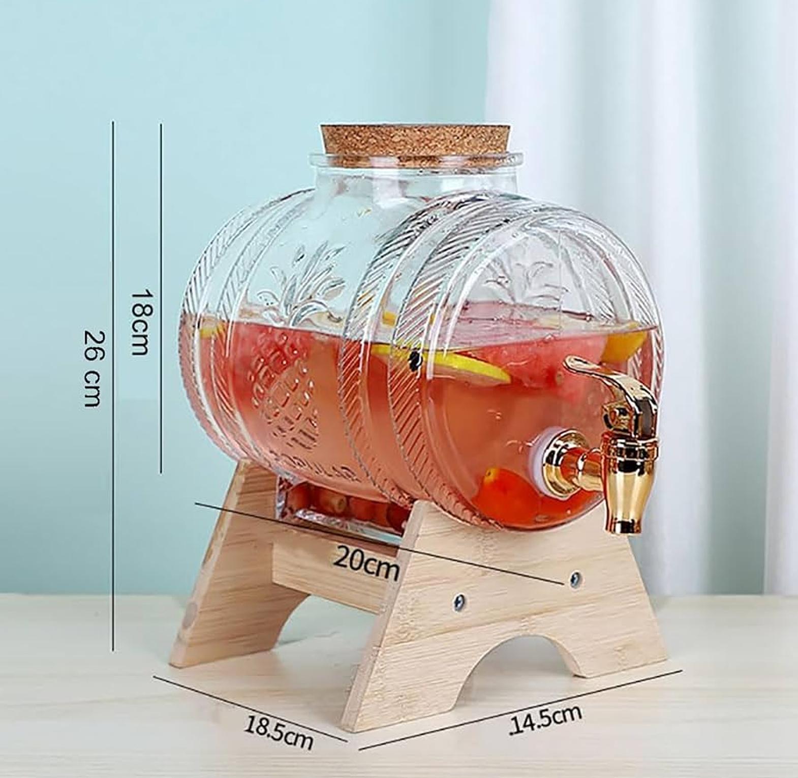 Wine barrel/dispenser perfect for use as a wine/juice or water dispenser. Glass material. Comes with a Wooden stand and lid Has a silver tap