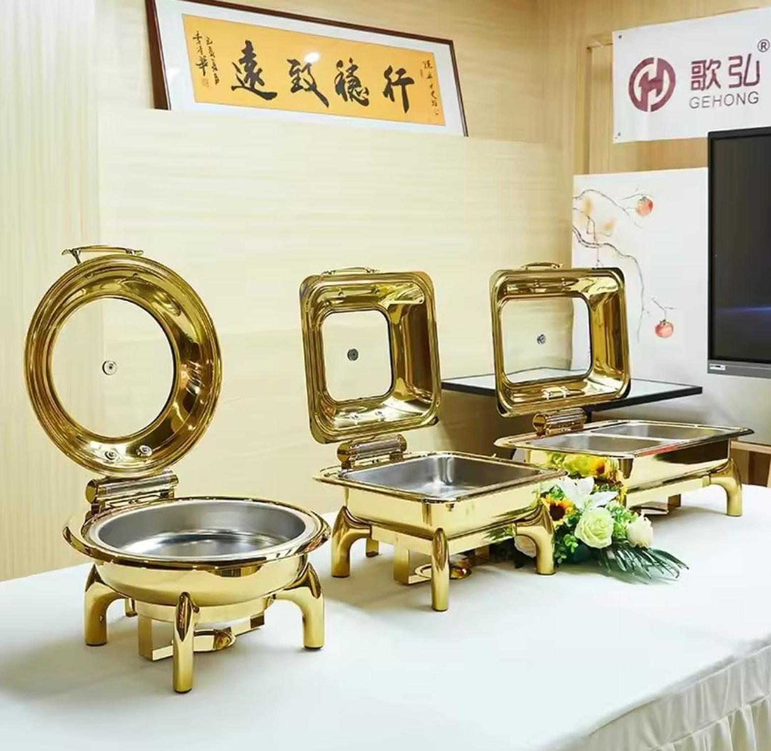 Made of food-grade stainless steel, it features safety and durability. Rust-proof and heat or cold resistant features allow longer service life. Besides, stainless steel construction is easy for cleaning with dish washing liquid and dried with a soft towel.The food pan, water pan and cover are dishwasher safe. 【Gold Design 】Features with gold design create a textured metal sense, elegantly display catering food straight from the oven onto the buffet table. Perfect for restaurant or hotel commercial use .