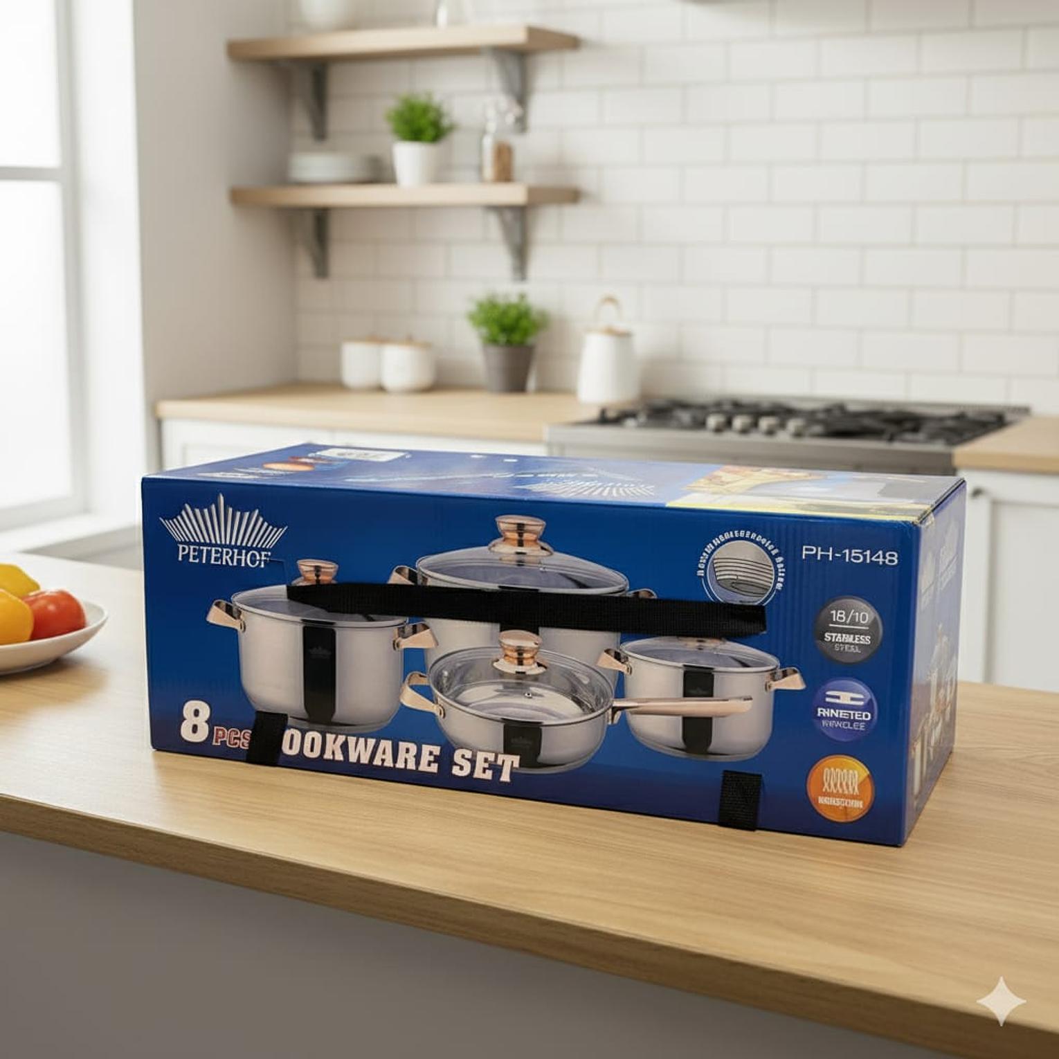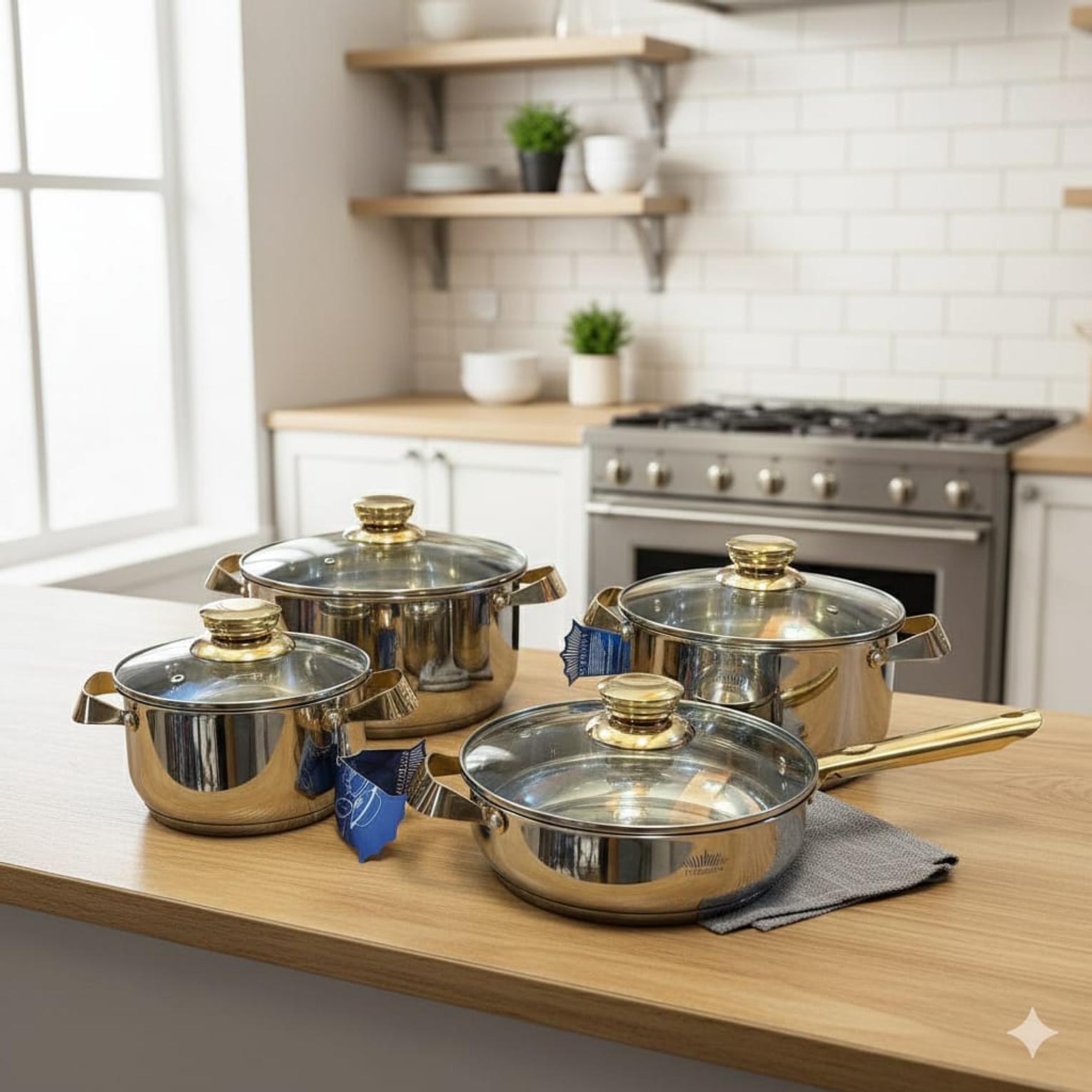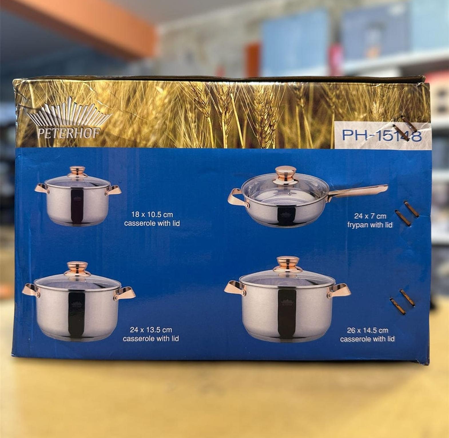8pc Peterhof stainless steel cookware Size:18cm*10.5cm :24cm*7cm :24cm*14.5cm :26cm*14.5cm Comes with a gold handle