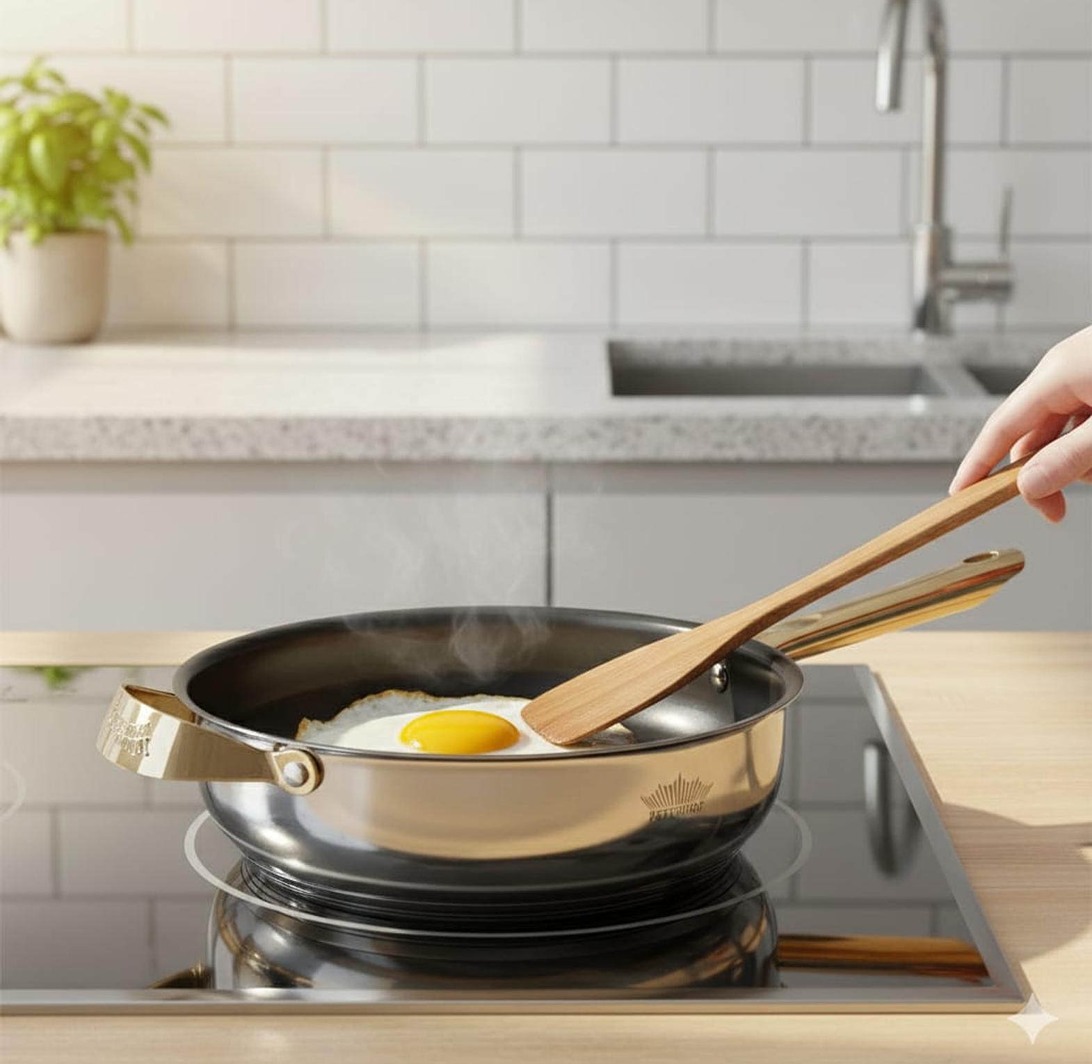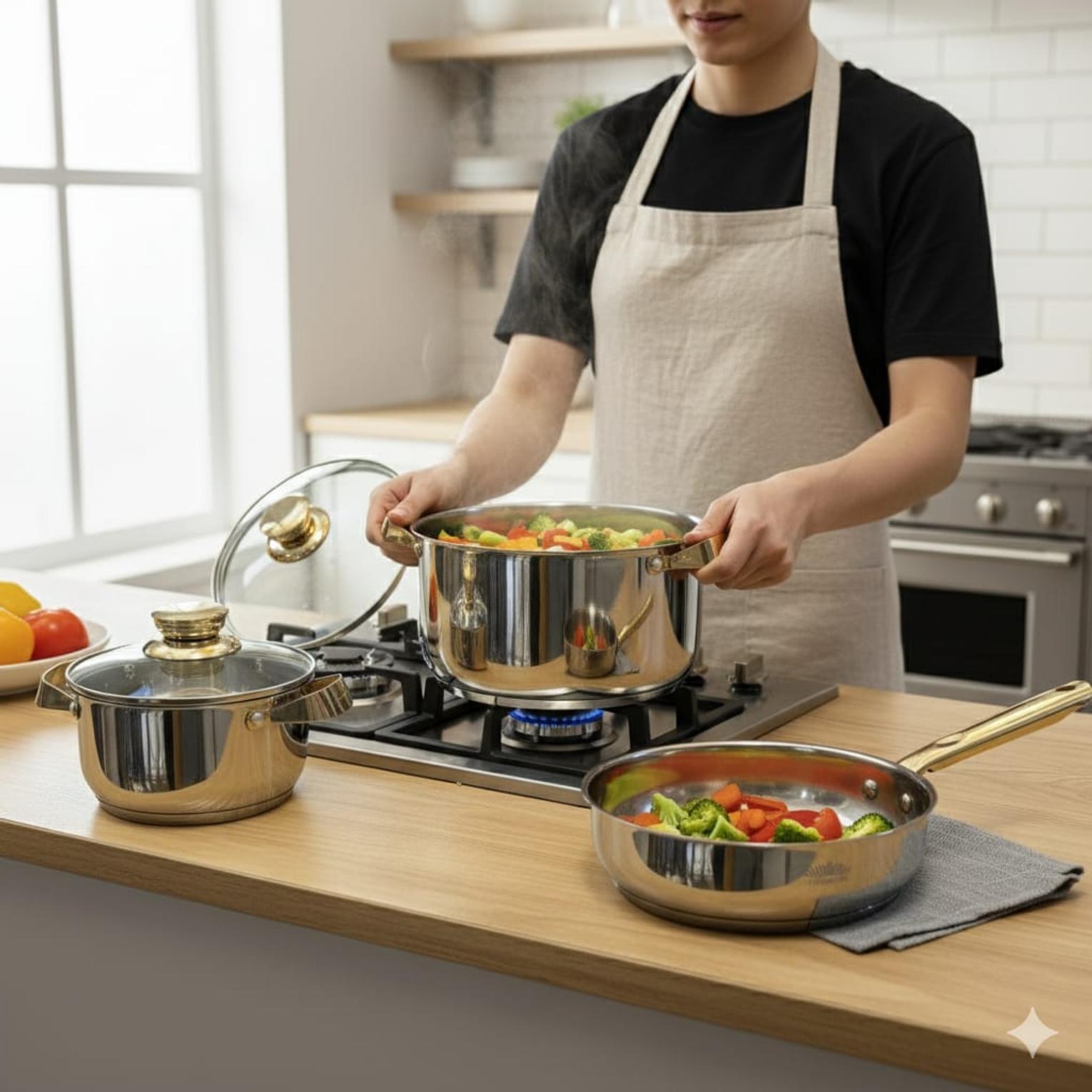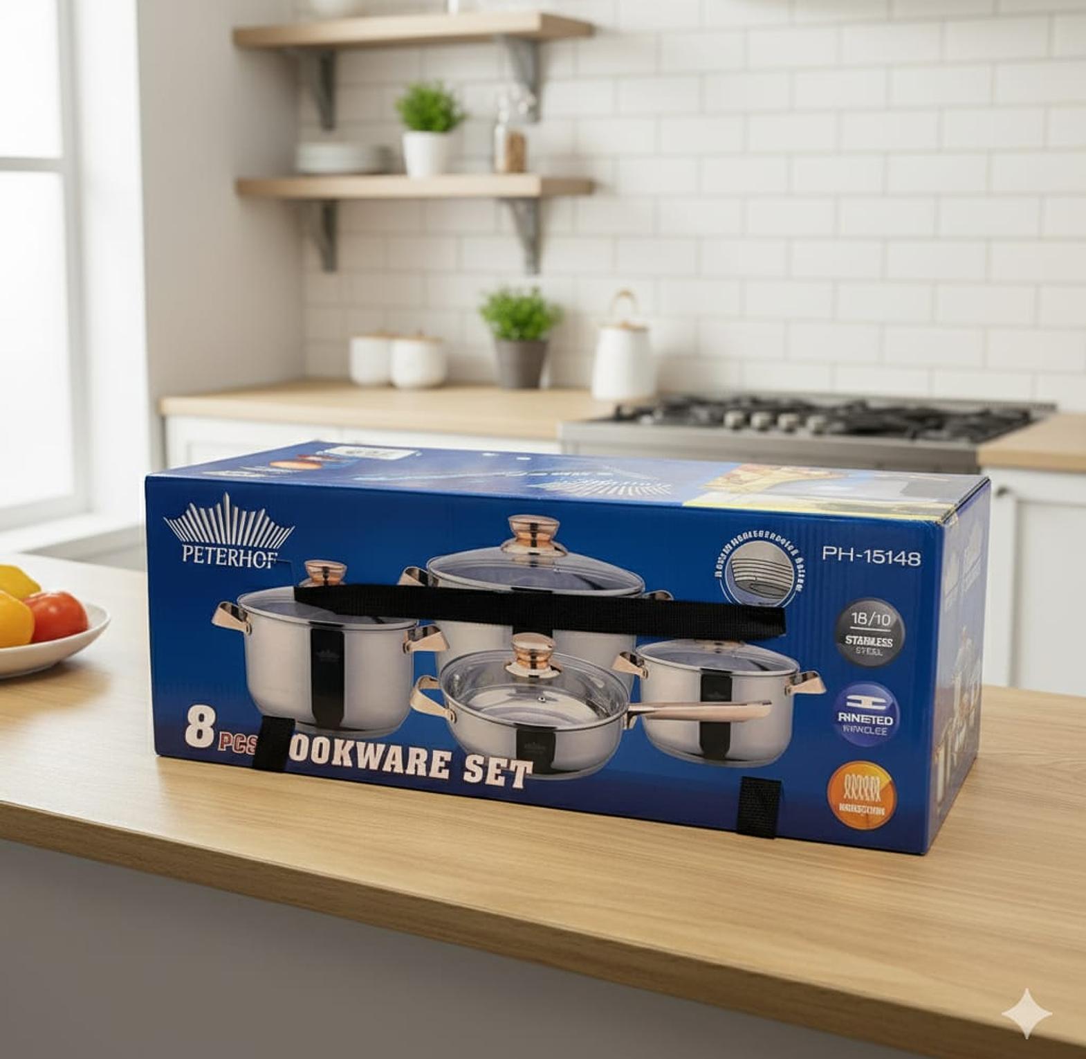 8pc Peterhof stainless steel cookware Size:18cm*10.5cm :24cm*7cm :24cm*14.5cm :26cm*14.5cm Comes with a gold handle