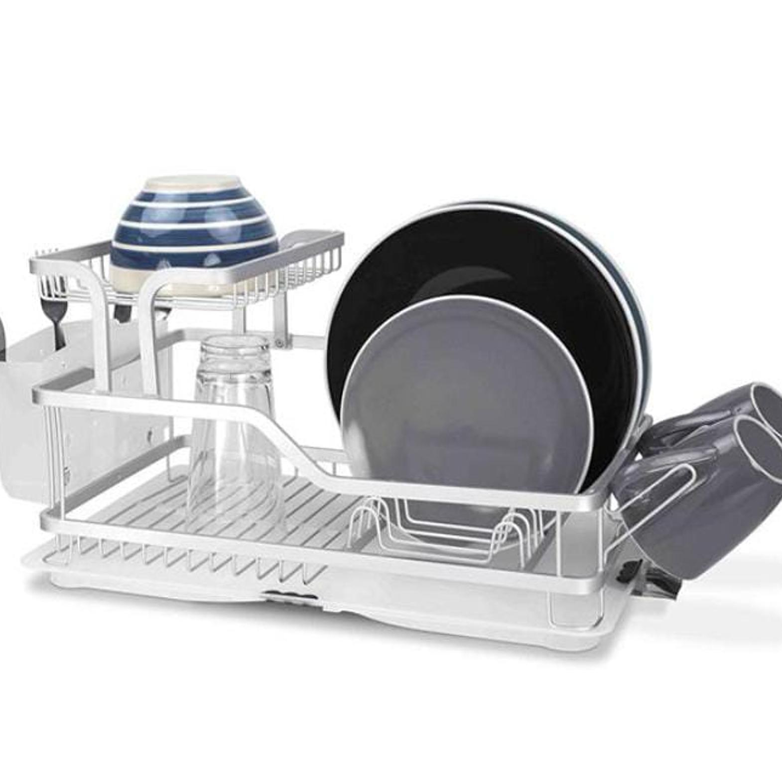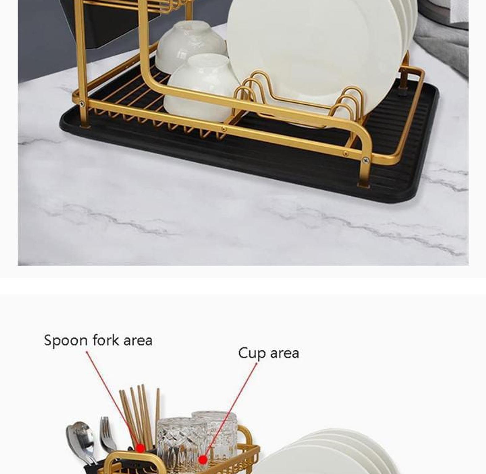 Has a Multifunctional drain rack: thickened material, anti-fall material: thick aluminum alloy and PP material, durable, that not rust, can be used with confidence Has a Water tray to Collect the water drained from the cutlery. Keep the kitchen countertops dry