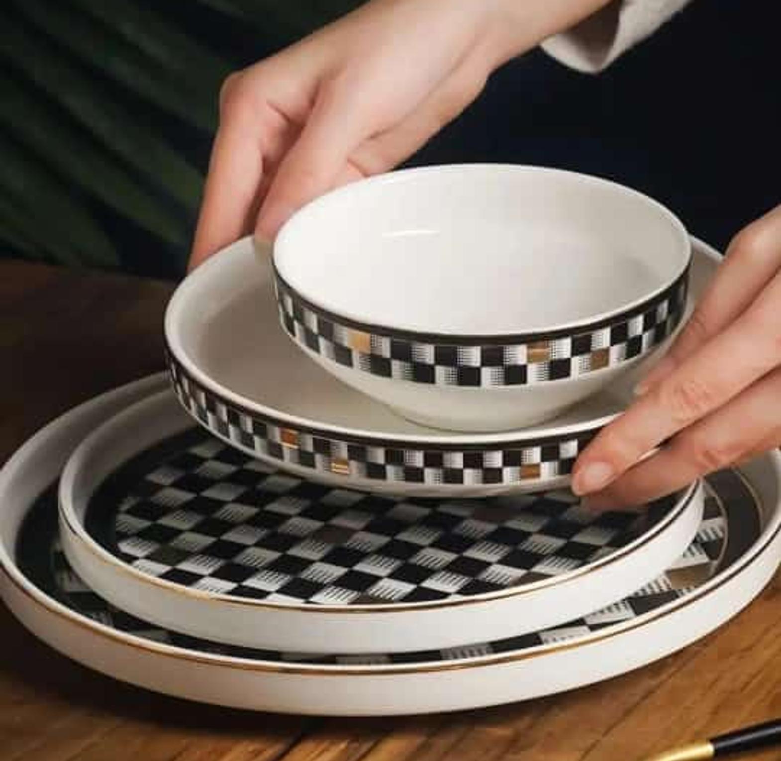 the dinner set is well design with a clear gold edges, its round in shapes and its fine porcelain. it easy to wash it has a black white and gold patterns,