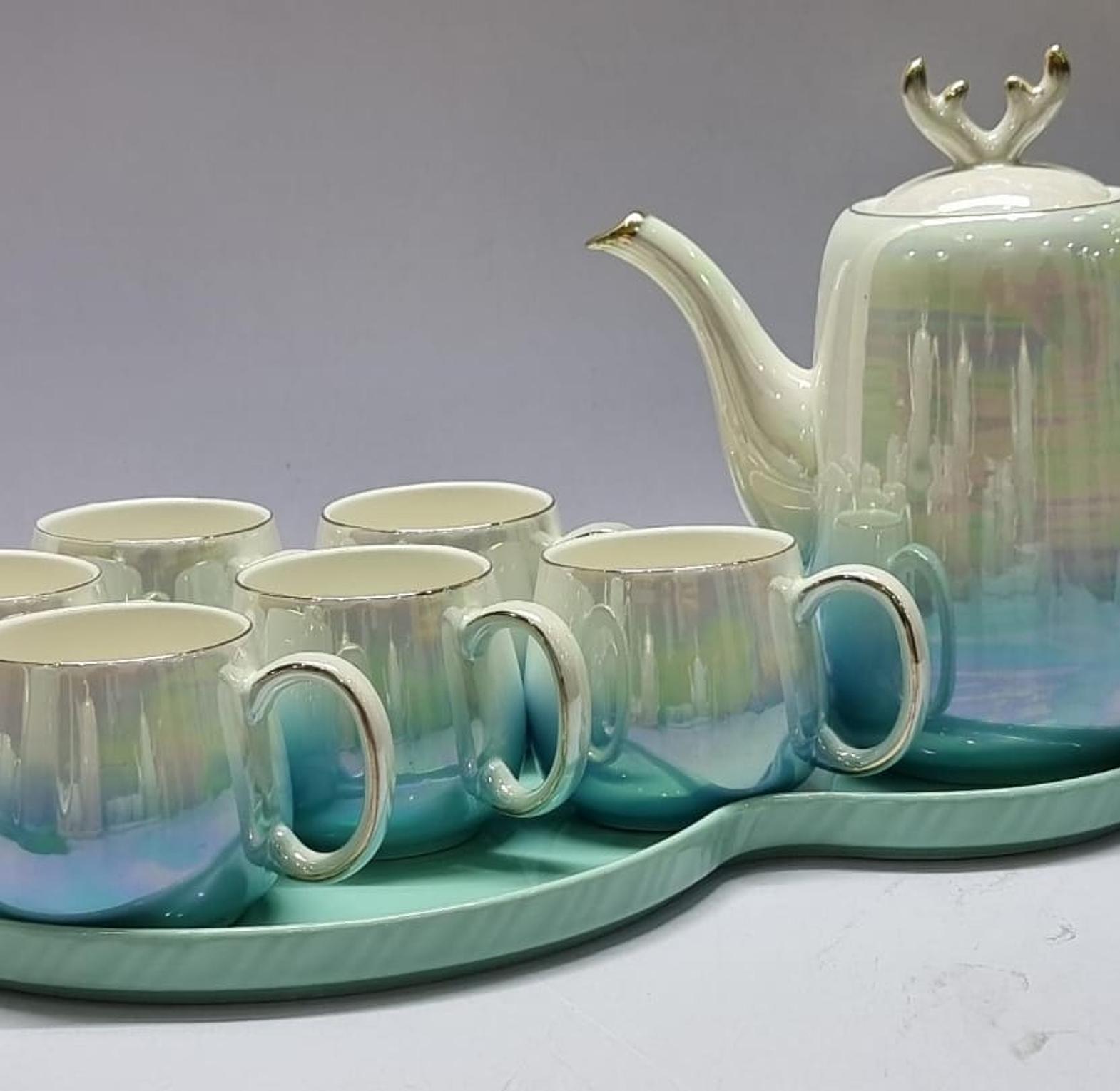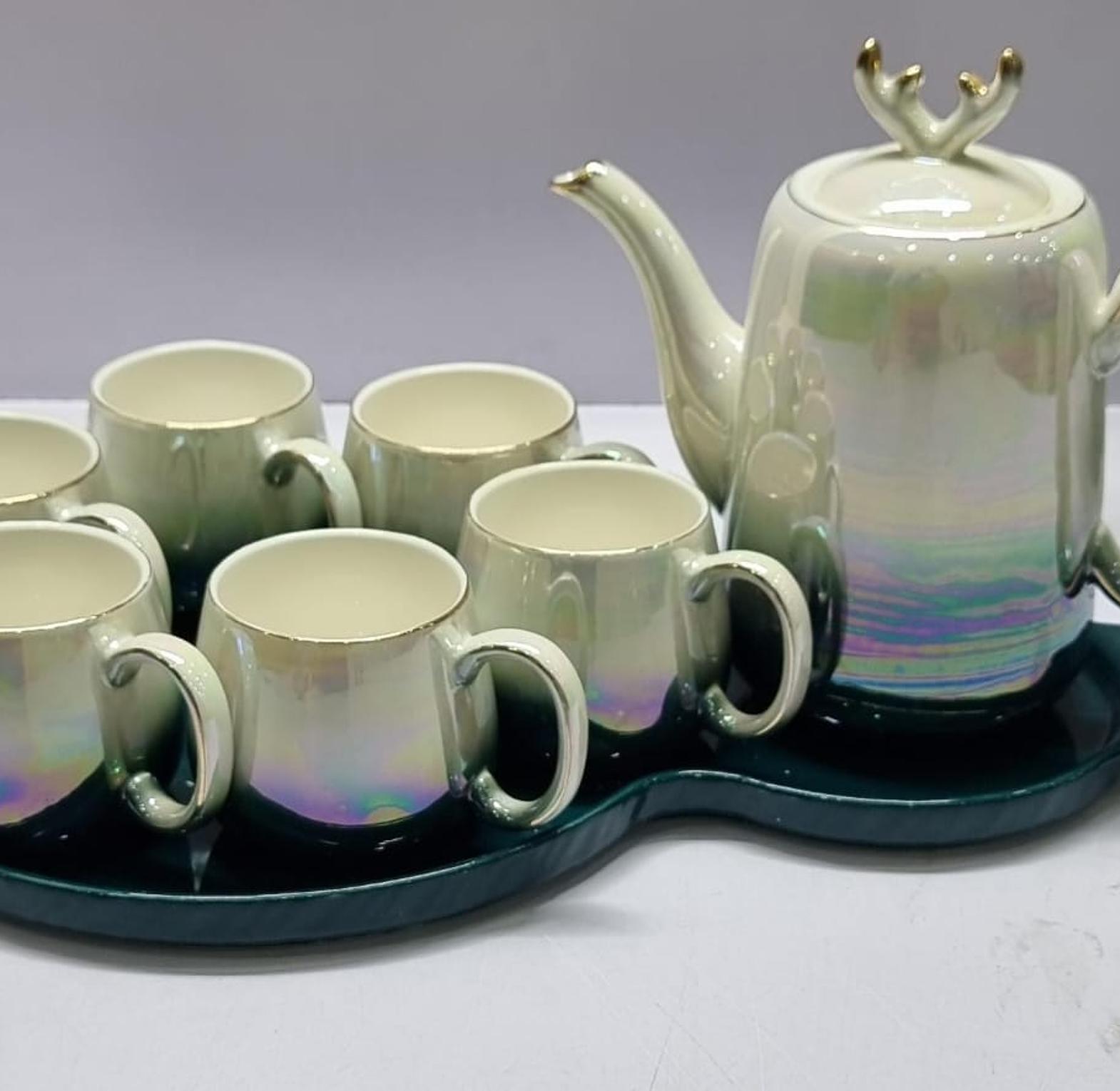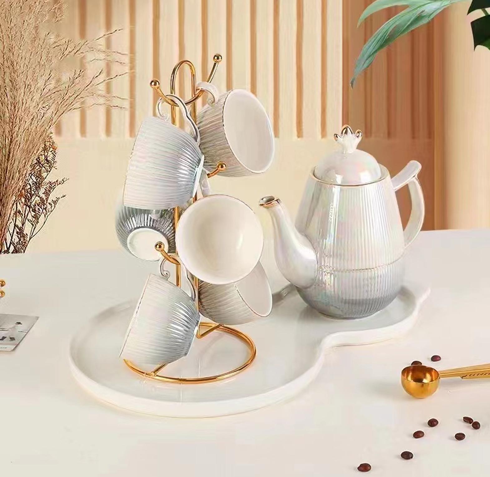 6 teacups, , 1 teapot, teapot capacity 220ml . Exquisite Set; different color with gold rim design teapot and teacups, stylish and elegant. Exquisite glaze is perfect for daily use, easy to clean manually, durable will not discolor.