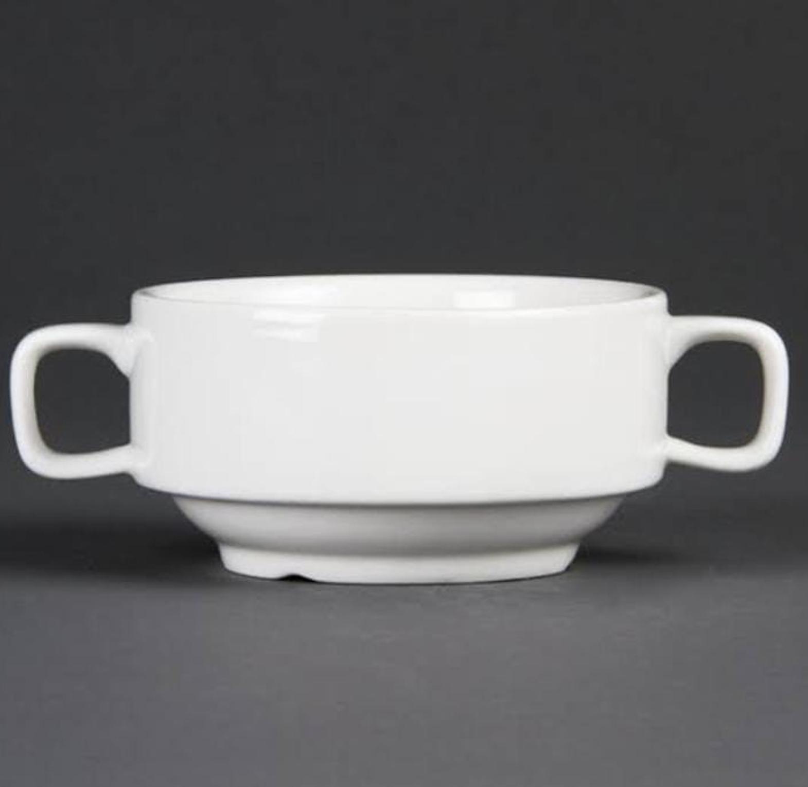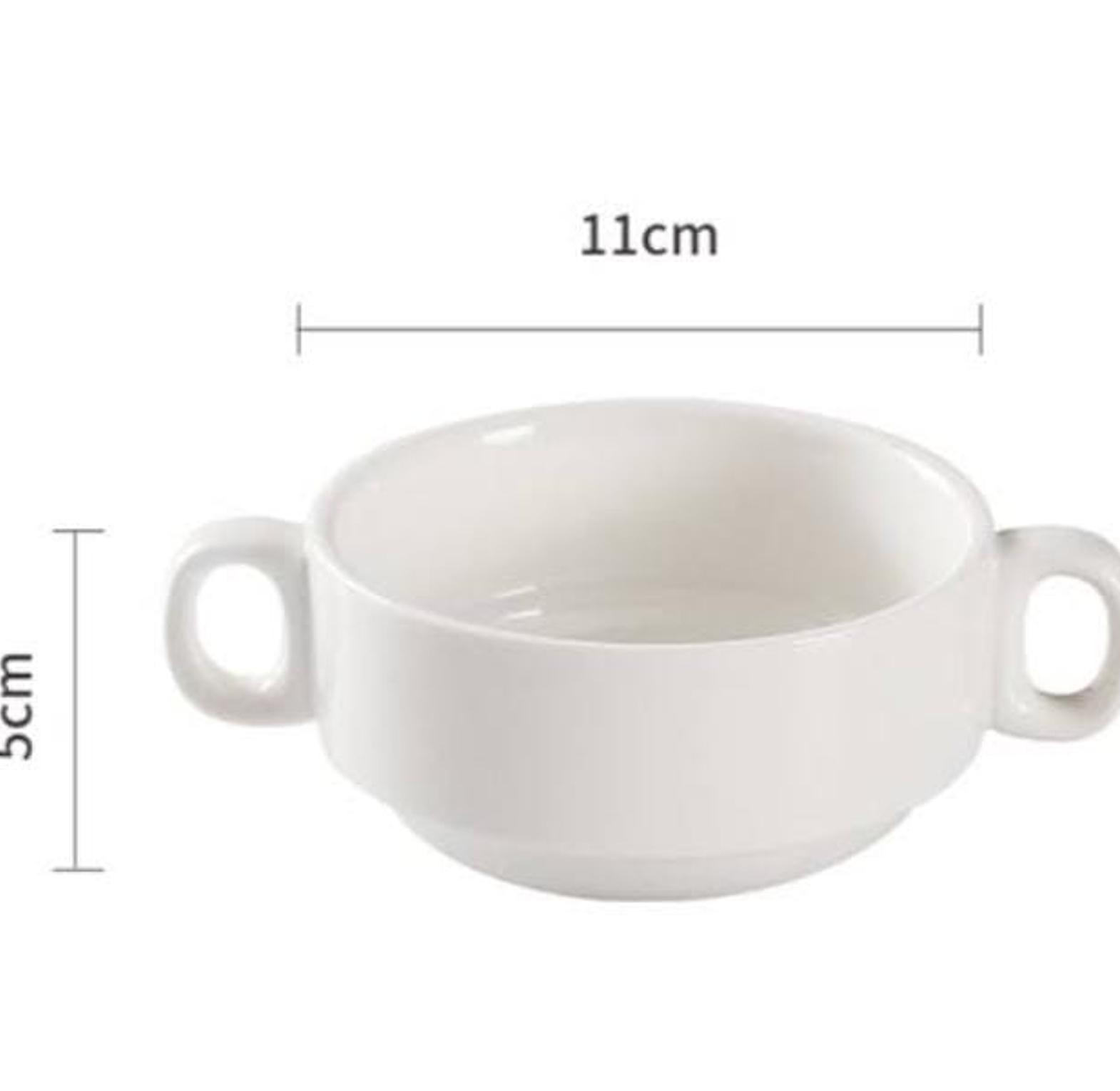The whie ceramic bowls are used to serve soup ,the have strong stackable handles,they are microwave and oven safe