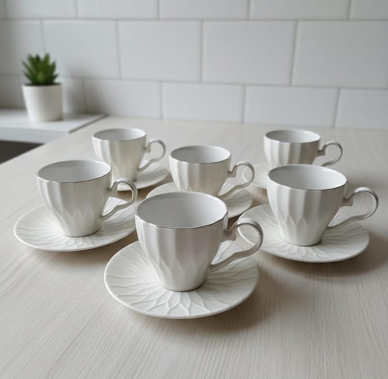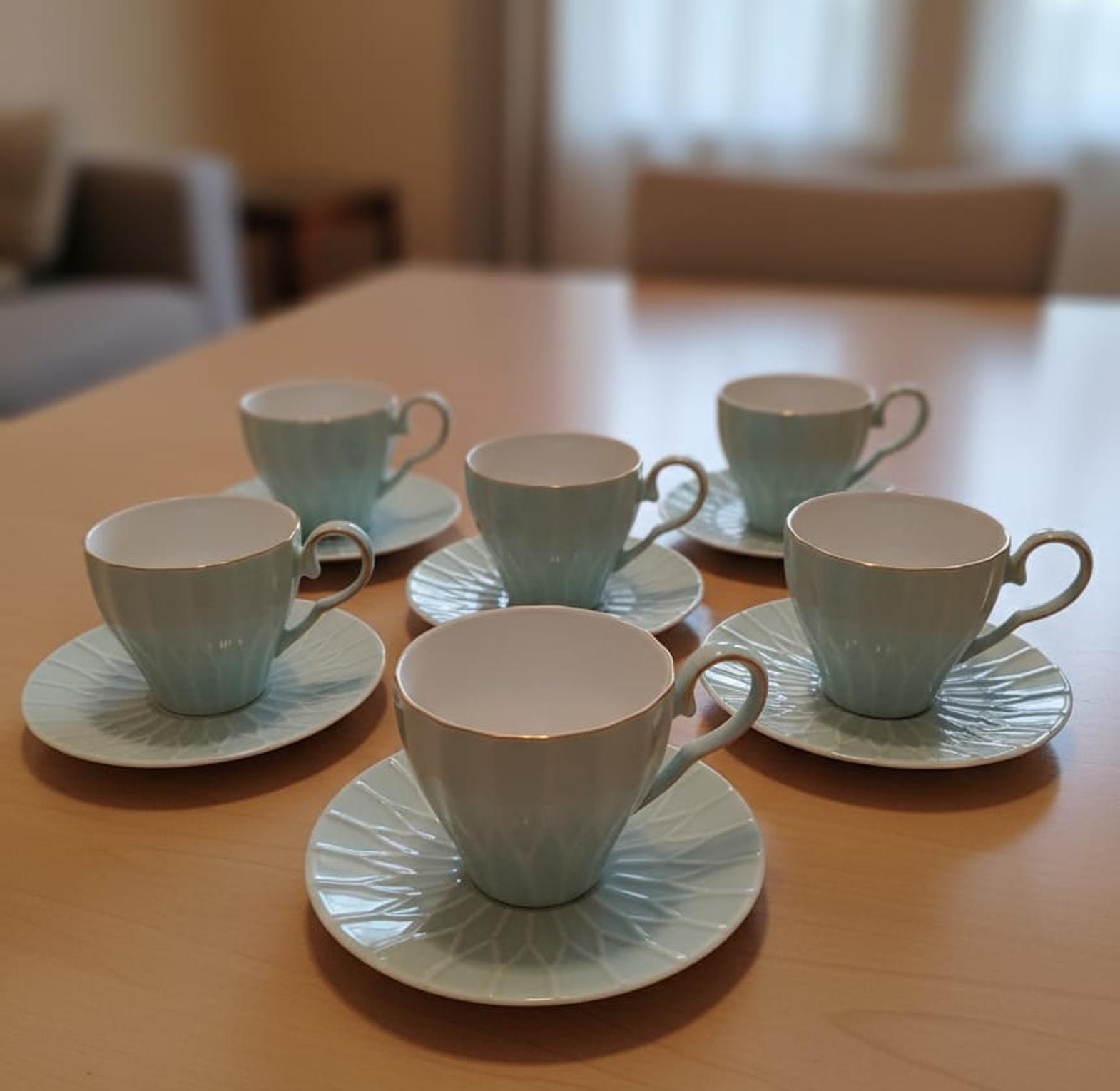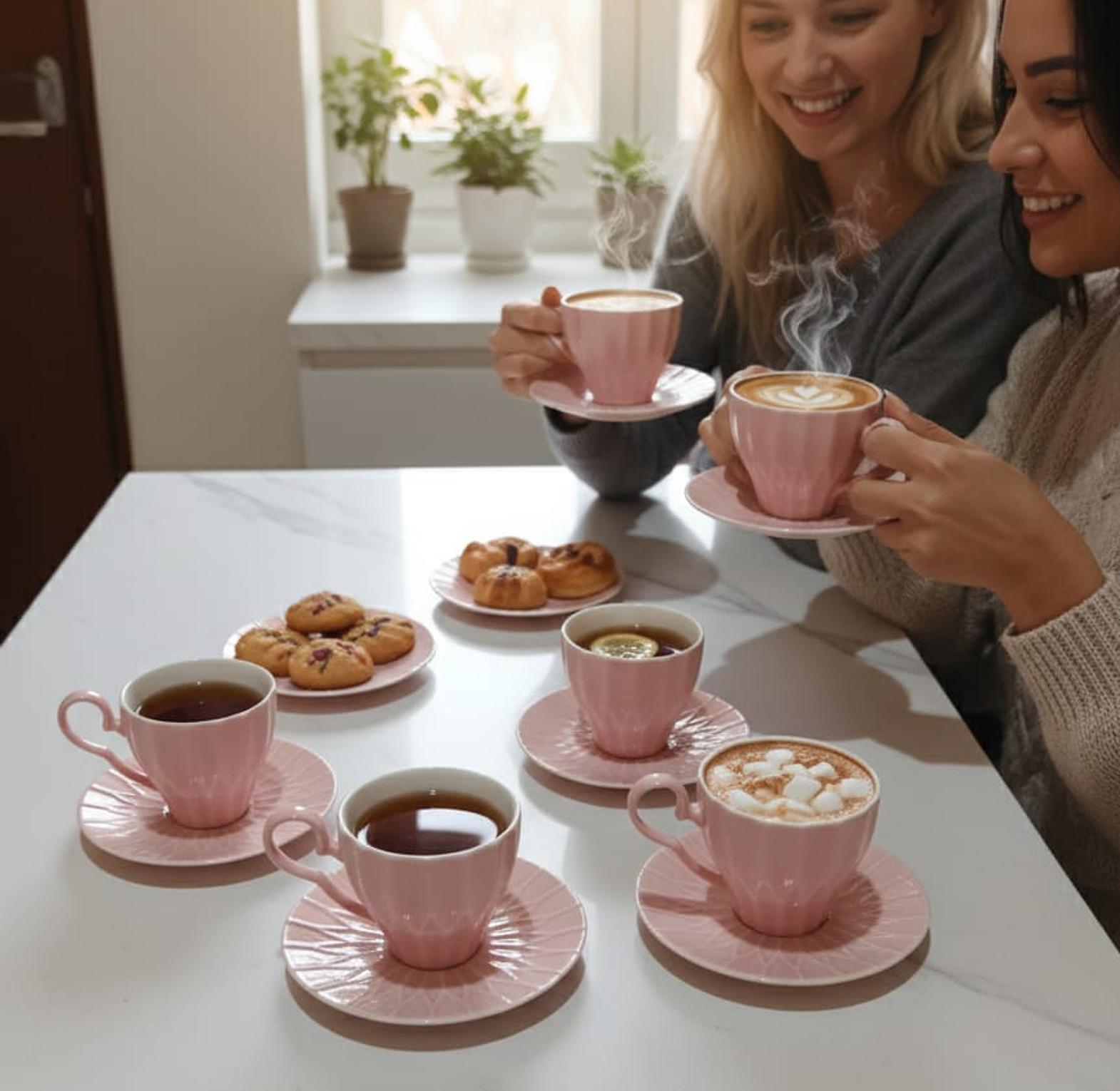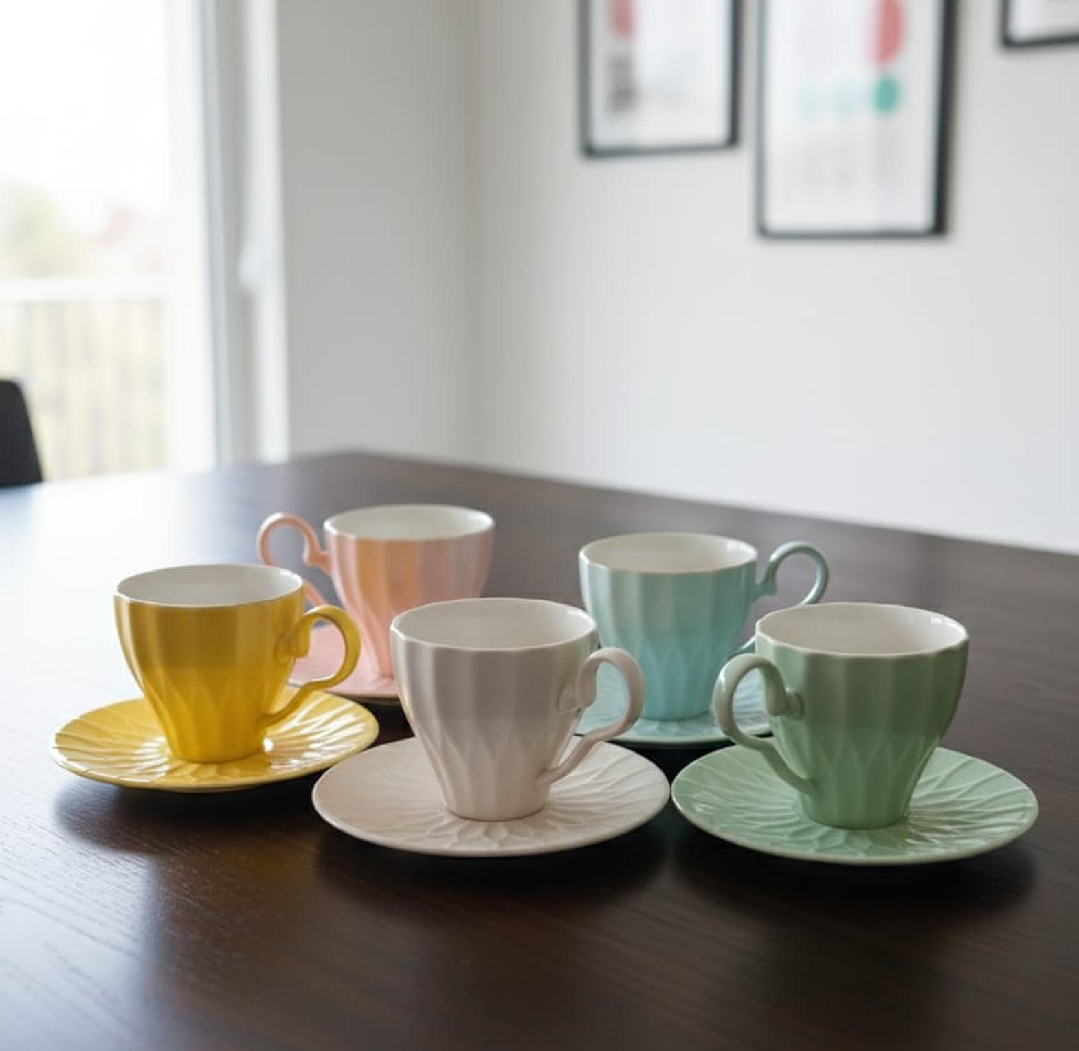 cup and saucer coloured ✅Material; ceramic ✅Color; white, pink and yellow and green ✅capacity: 170ml *✅Size; ☘️cup:8cm*8cm*4cm ☘️soucer: 14cm