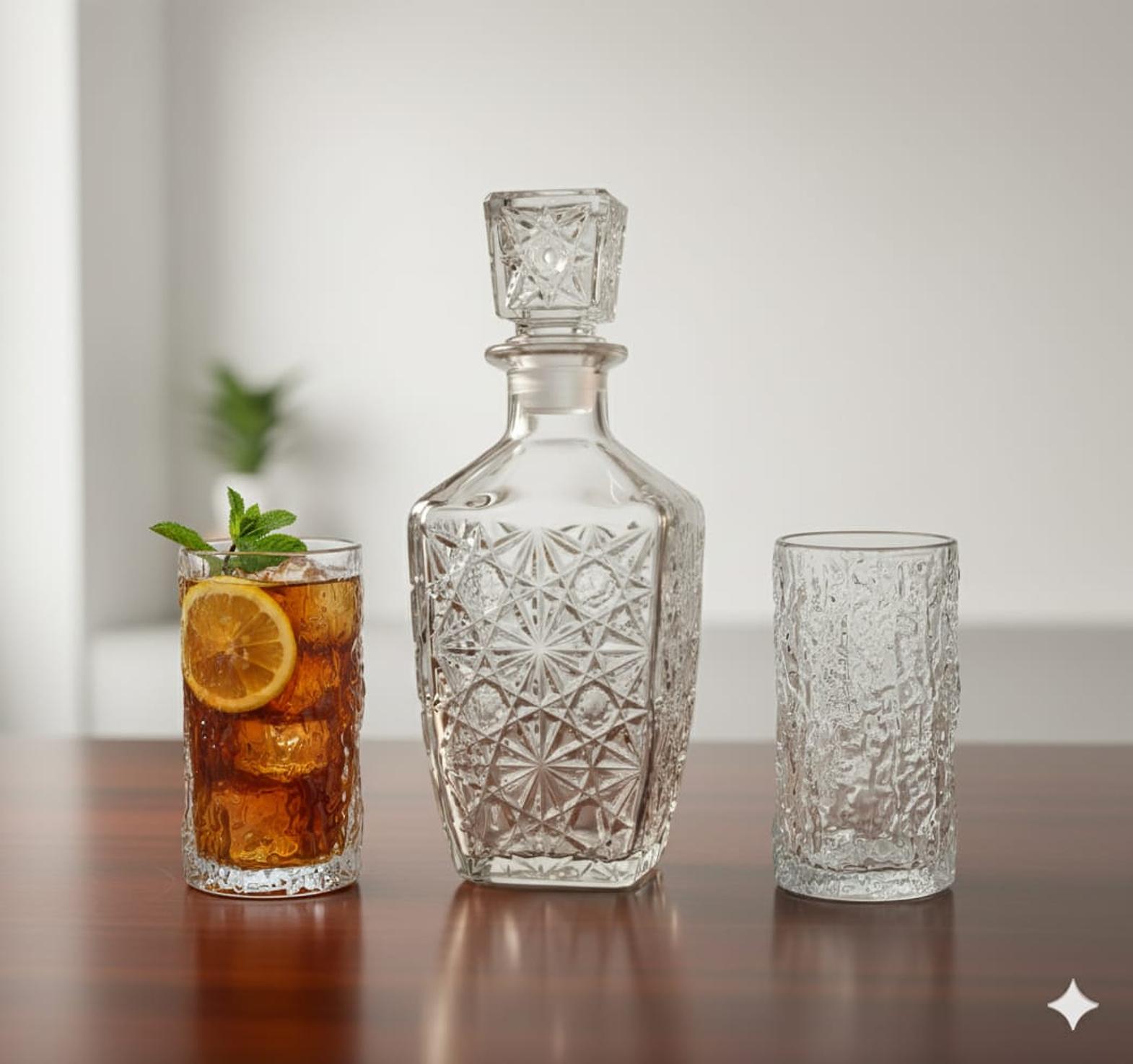 Decanter square big+2pc ice texture glasses Material:glass Capacity for decanter 850ml Capacity for glass 350ml Colour:clear