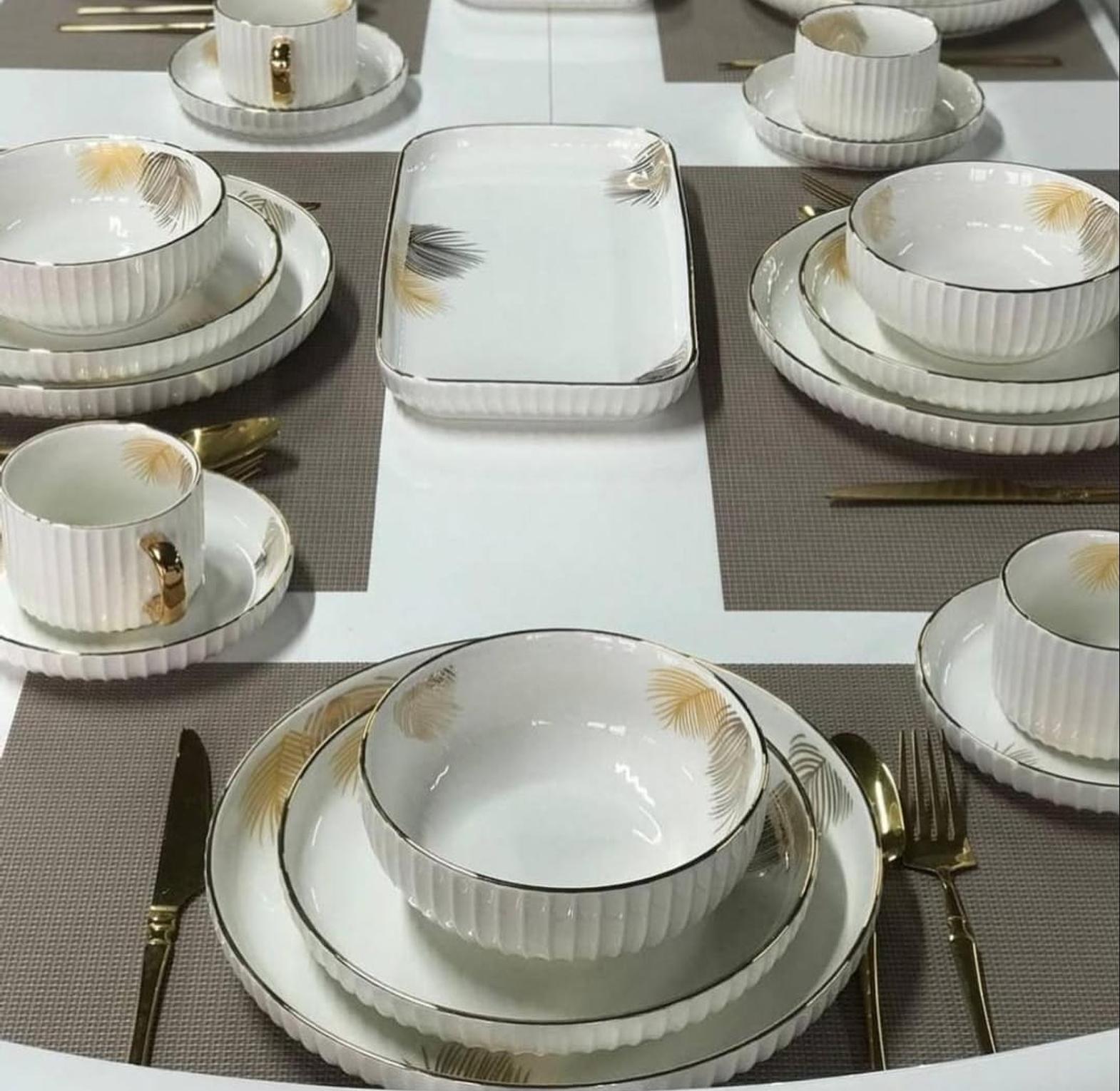6pcs dinner plates 10'inch ♦️6pcs side plate 8' inch ♦️6pcs soup bowls 6' inch ♦️6pcs mugs 220ml ♦️6pcs cup saucers ♦️Platter ×2 (Rectangular)