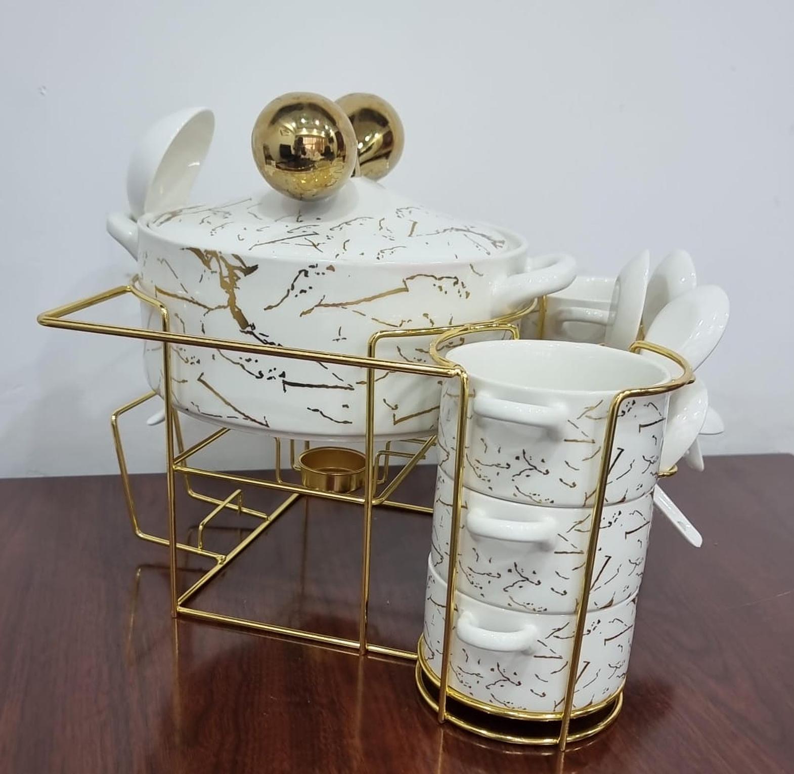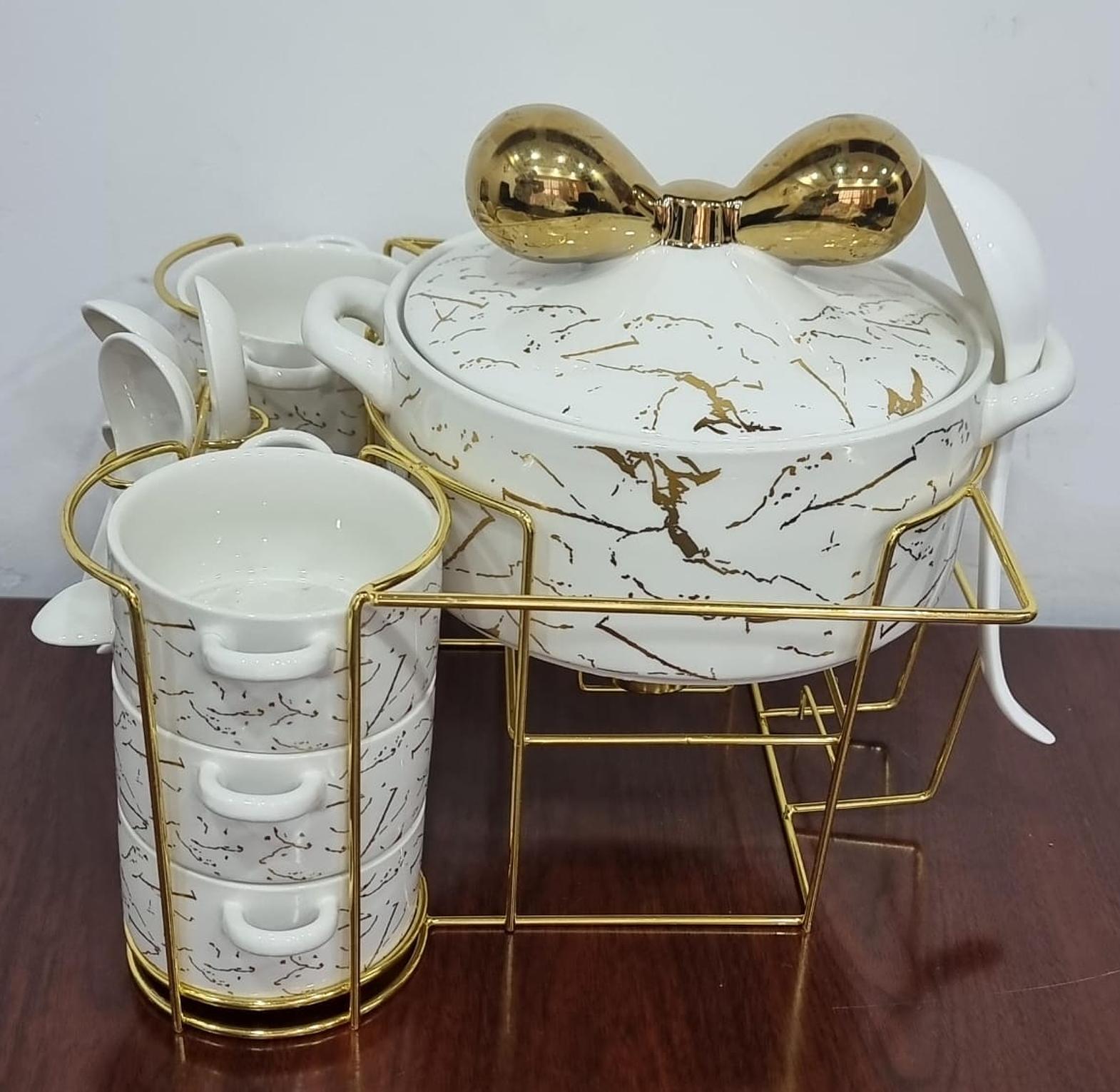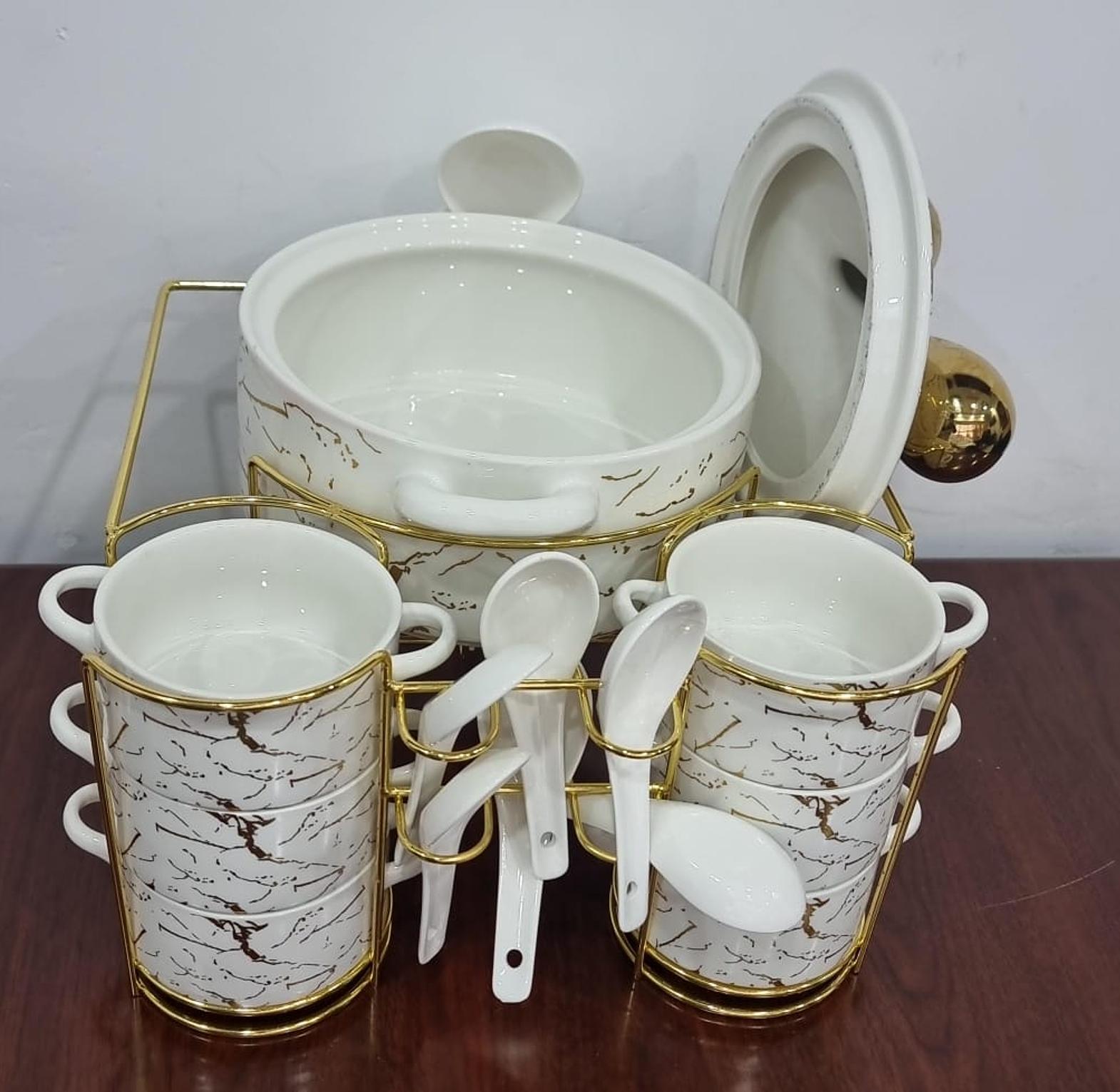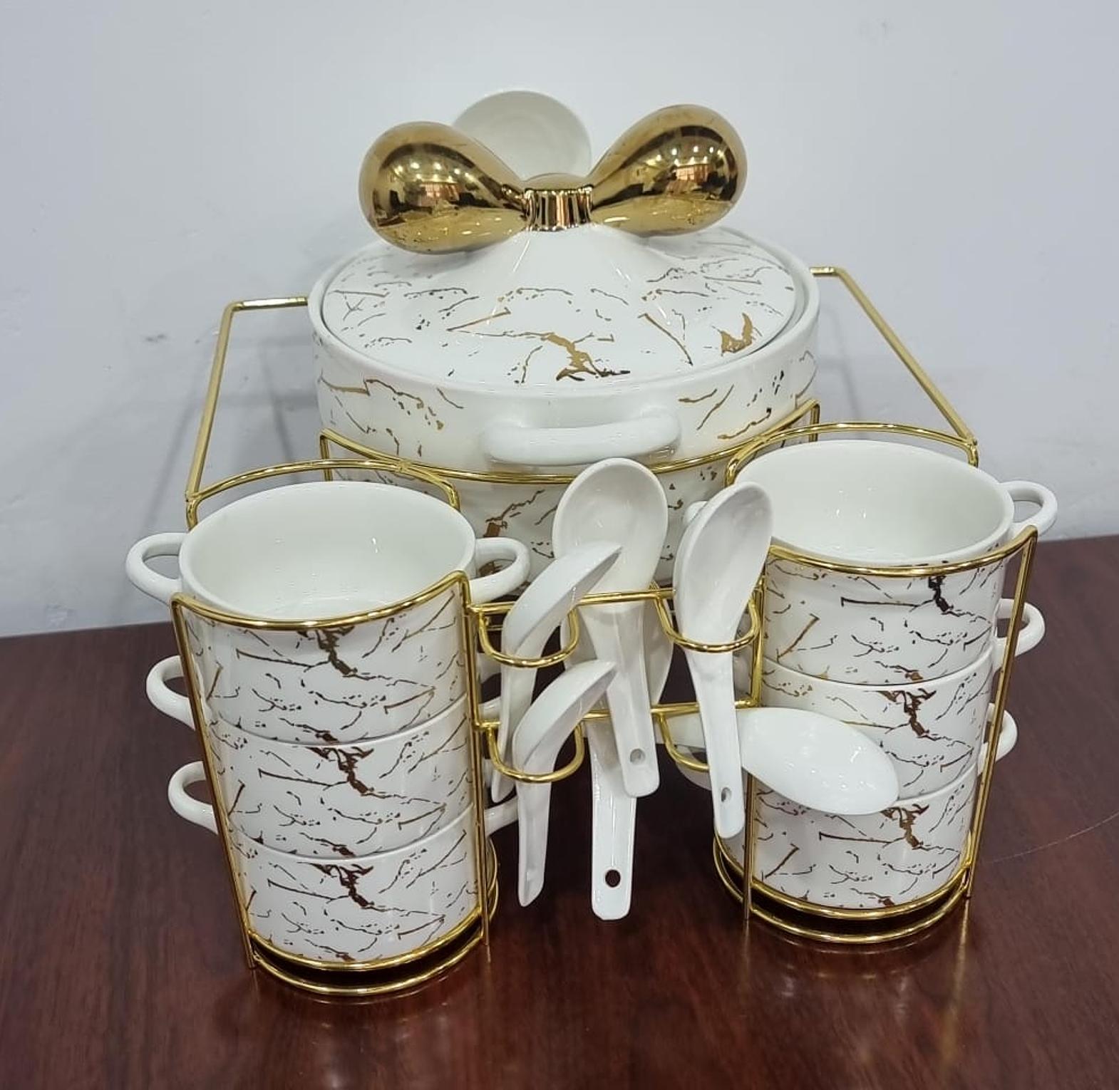ELEGANT AND UNIQUE- Table Fashion Essentials fancy ceramic soup bowls set is made with exquisite style and design. The set is crafted with detail to make a glossy smooth finish. Gold color is inlaid into the top of the bowls to give it the luxurious special look. The tureen bowl has a fancy crown shaped handle on the lid to complete the elegant look.
