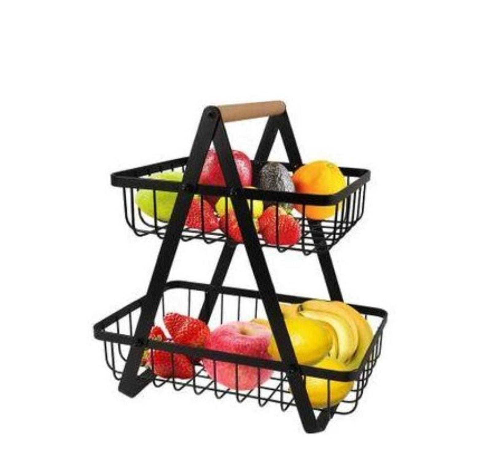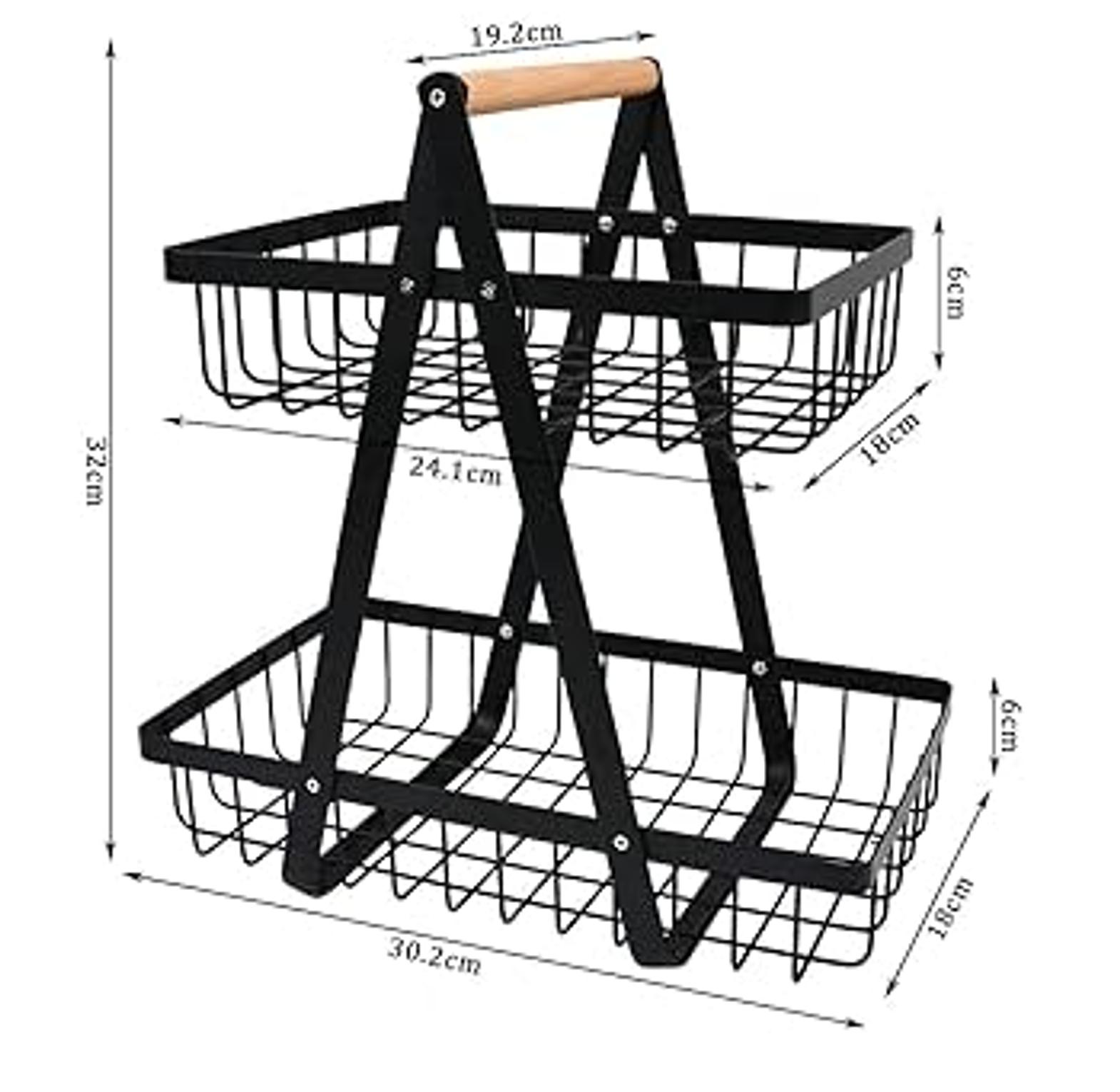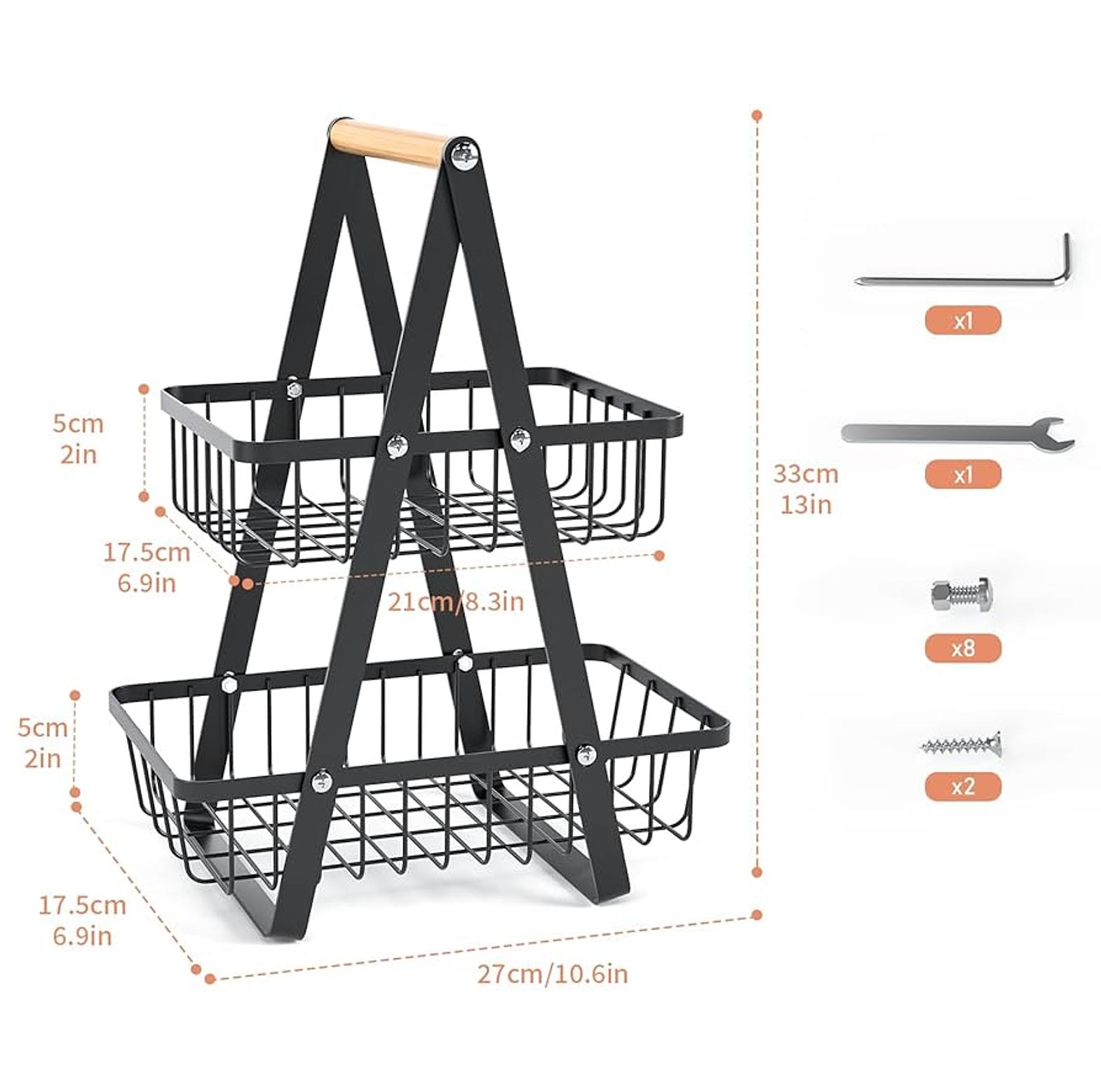 Two-layer metal fruit storage basket Space-saving with large capacity Sturdy and rustproof construction Easy to assemble and stylish design Handmade with wrought iron for durability Versatile use for kitchen counters