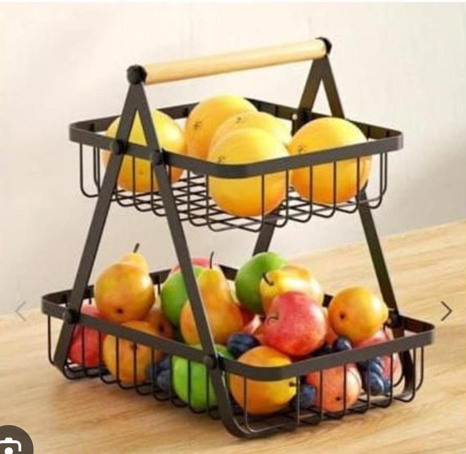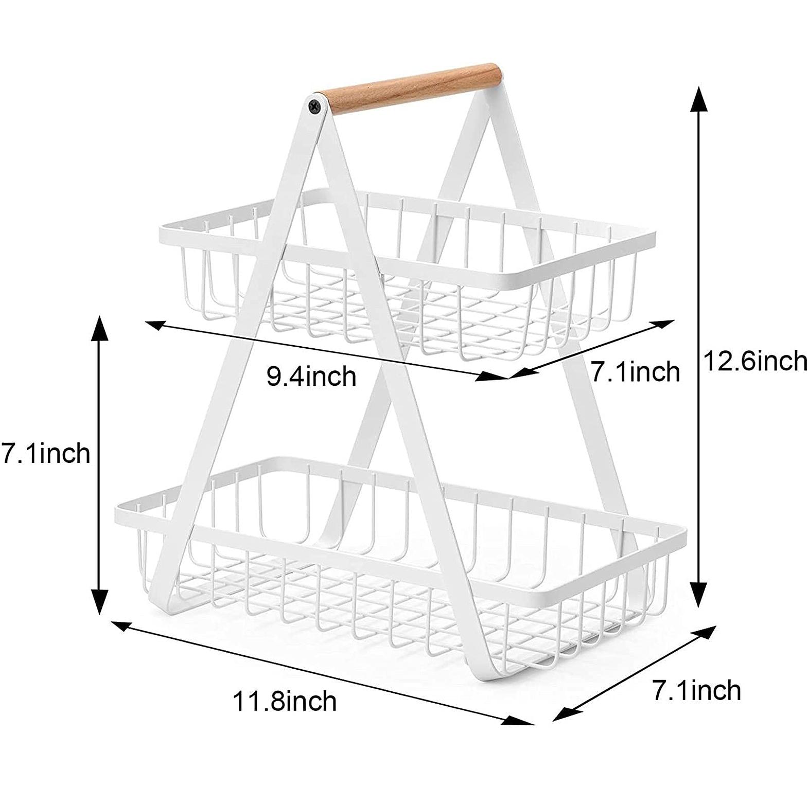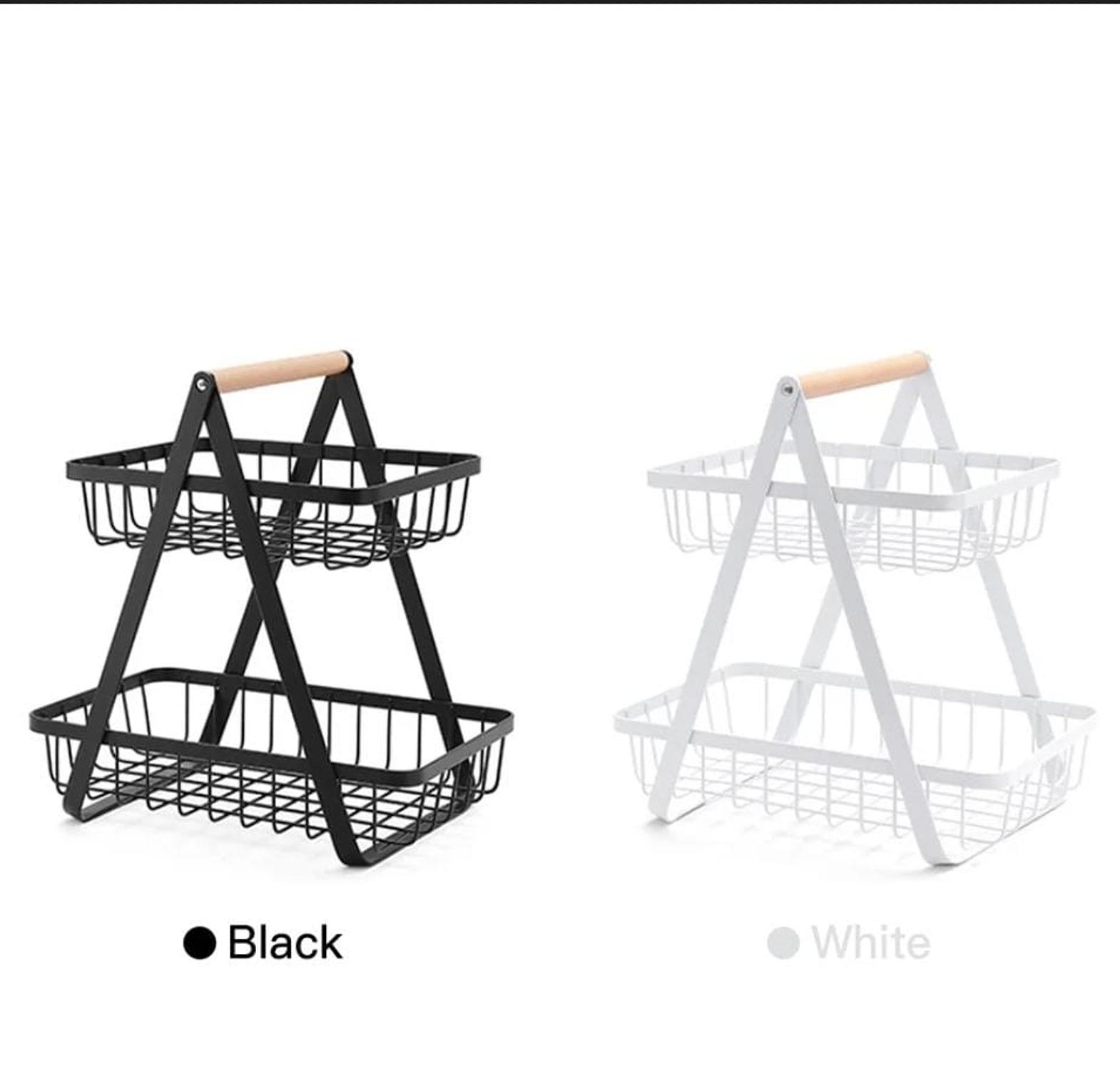 Two-layer metal fruit storage basket Space-saving with large capacity Sturdy and rustproof construction Easy to assemble and stylish design Handmade with wrought iron for durability Versatile use for kitchen counters