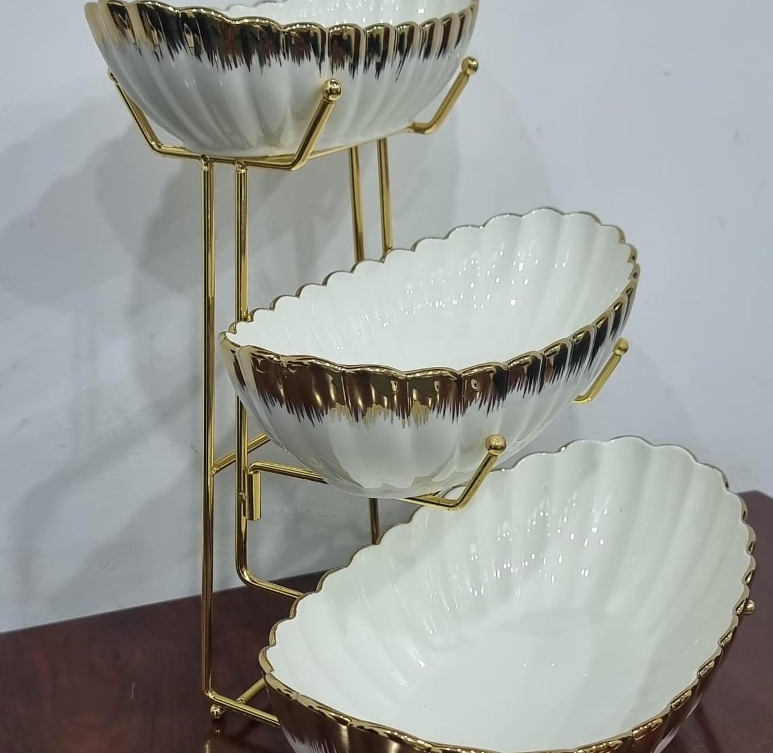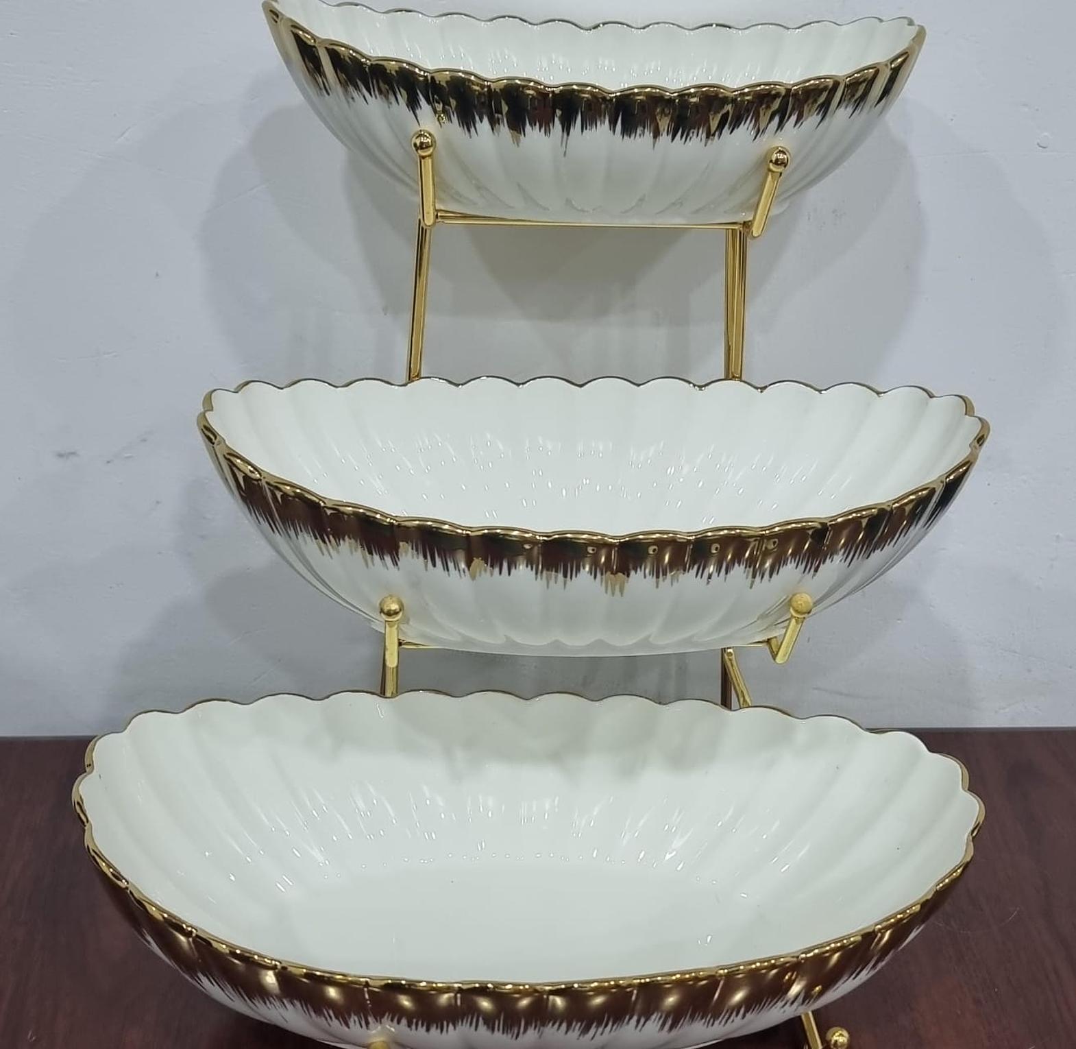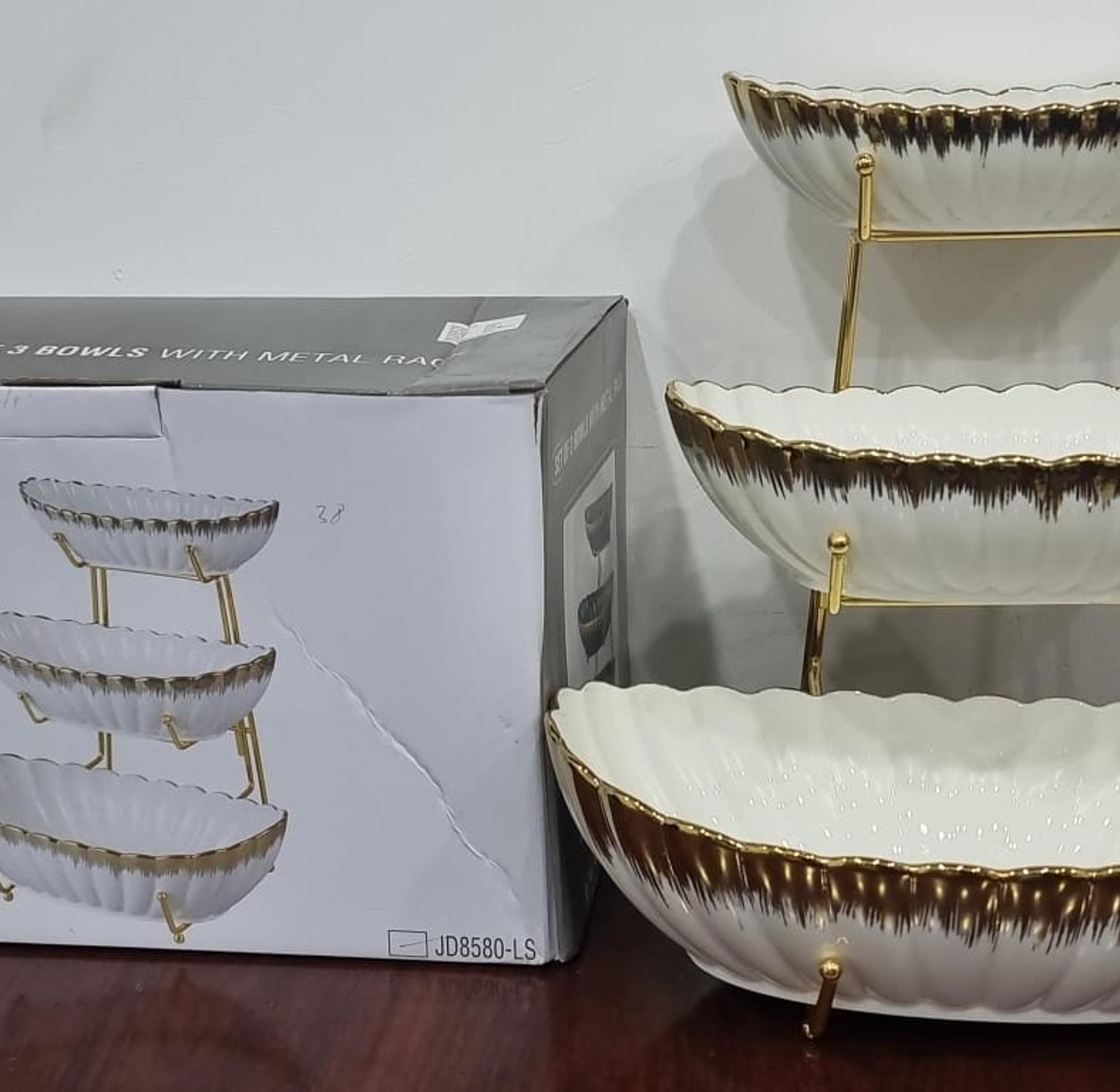 Set of 3 ceramic fruit bowls on gold metal rack Bowl sizes: bottom 35x19x10cm mid 29x15x7cm top 25x13x6cm