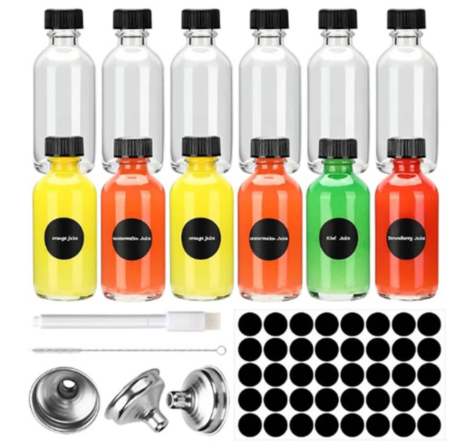Ginger Shots Essential Glass Bottles ✴️Wellness Shot / Immunity Boosting Shots. ❇️Material - Glass Bottles with Air tight plastic lids [ Leak proff ] ❇️Capacity- 60 ML per bottle. A set of 12 contains: ⏺️ 12 Glass Bottles + ⏺️ 3 stainless steel funnels ⏺️1 pen +1 brush ⏺️1 black round sticker. 40 stickers in total