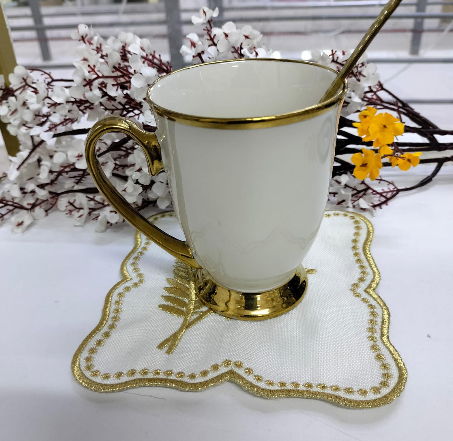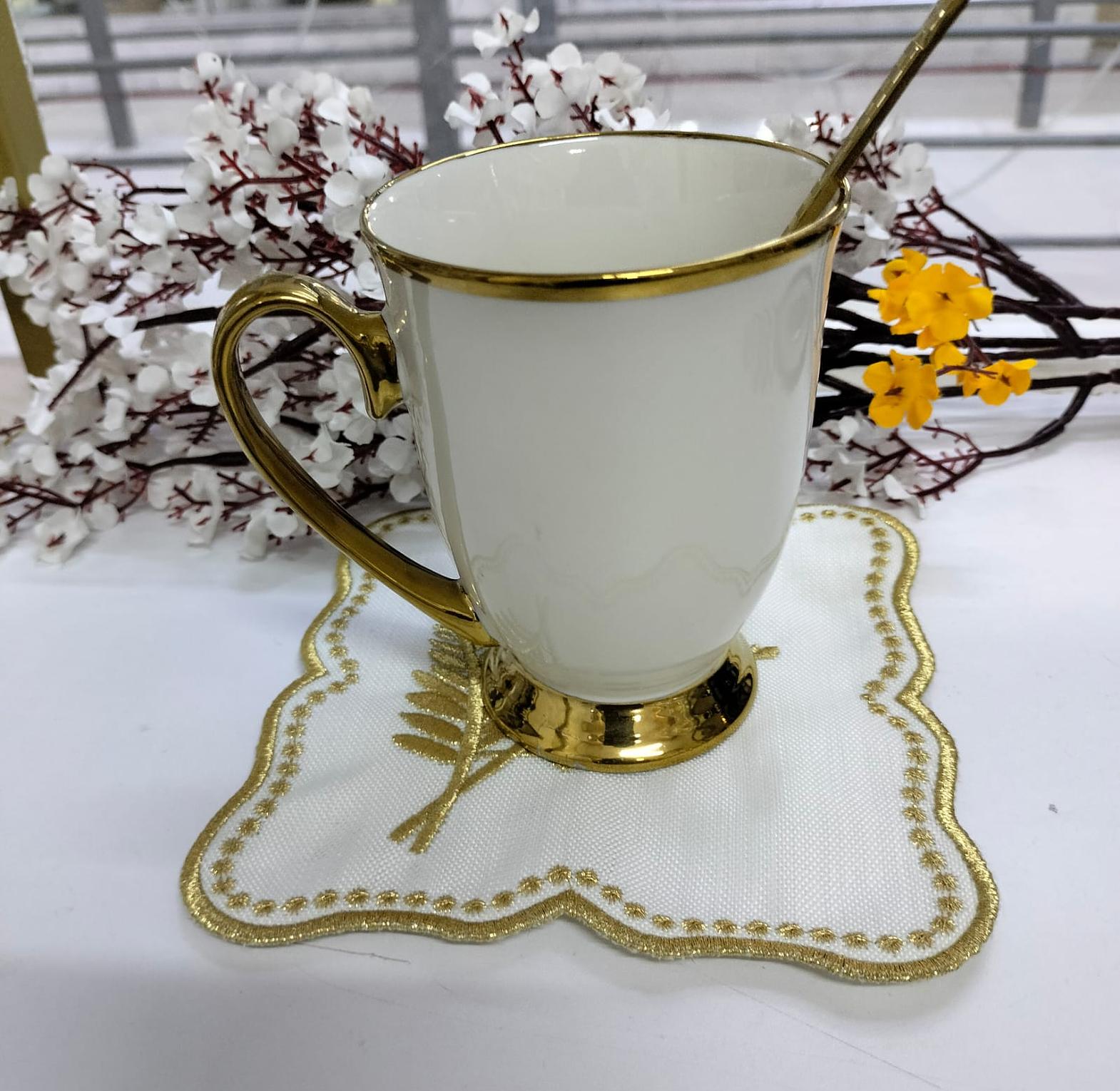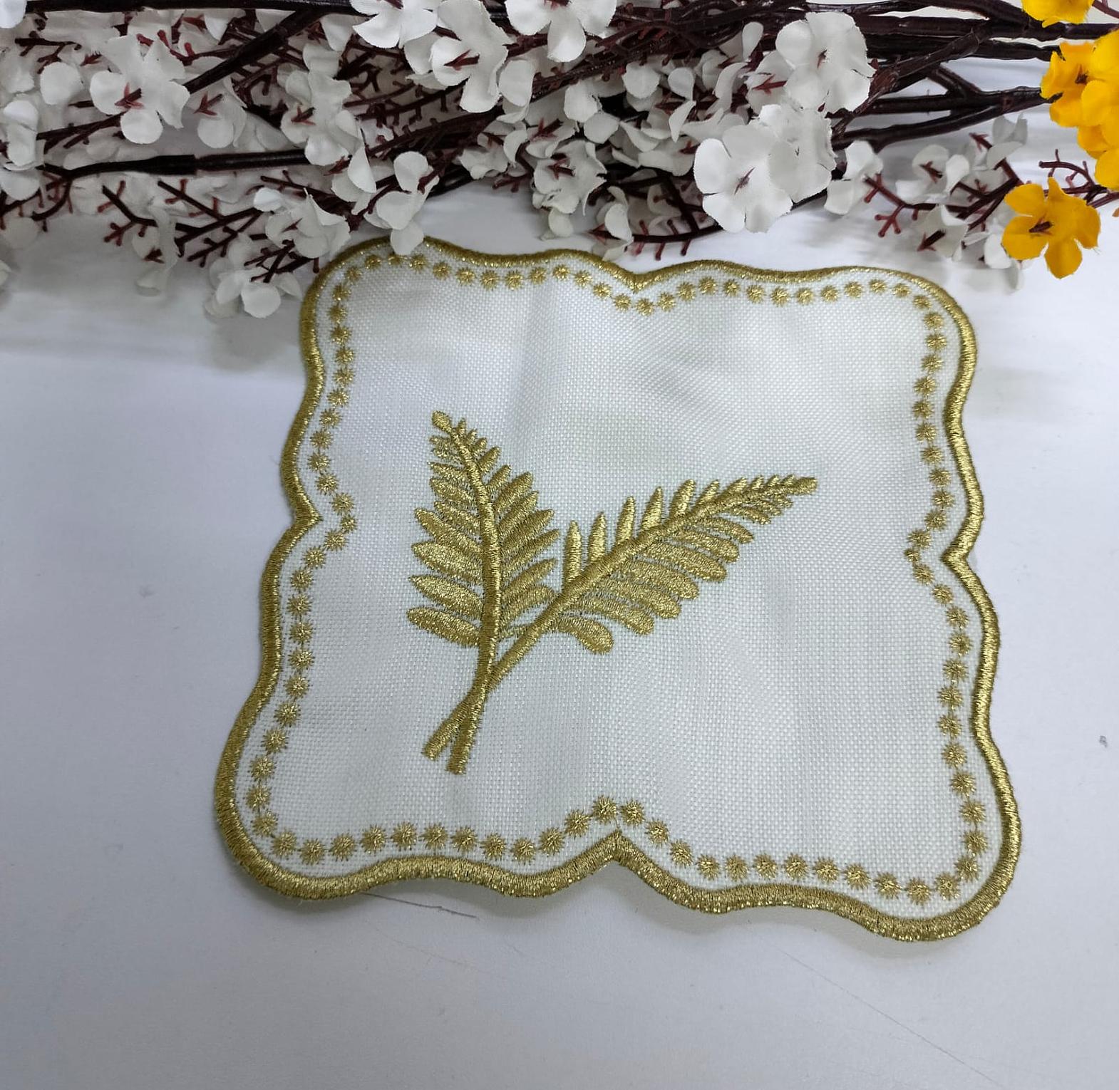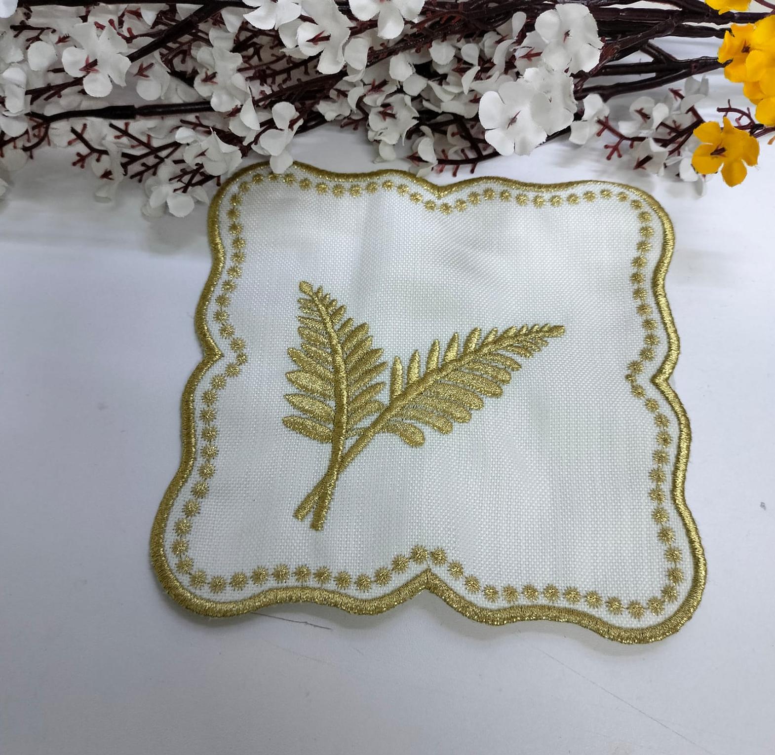 The linen coaster add luxurious design on your table Its made of linens has a gold embroidered Flower Can be used as a saucer to place the cup , a glass