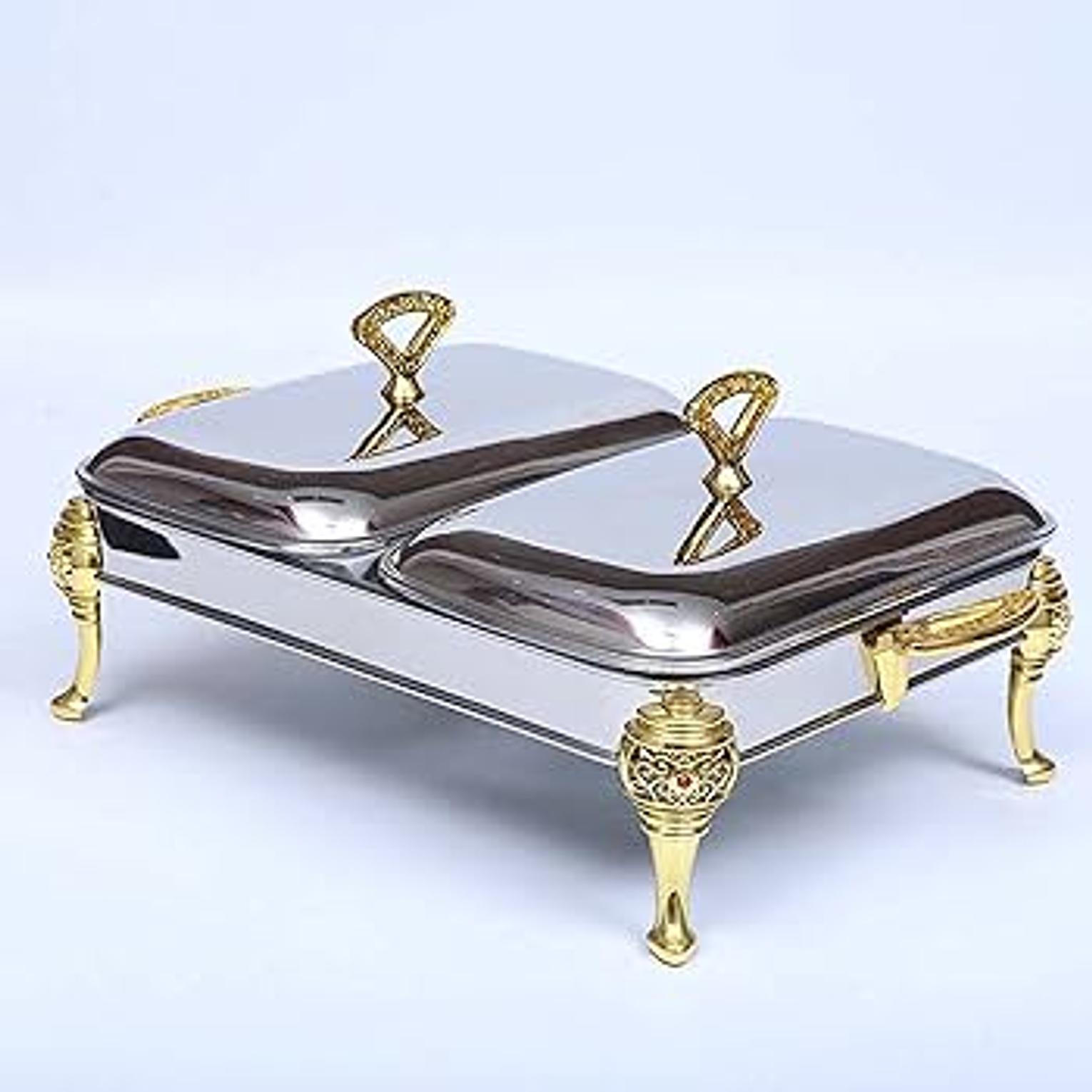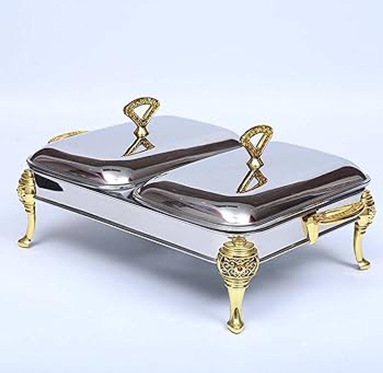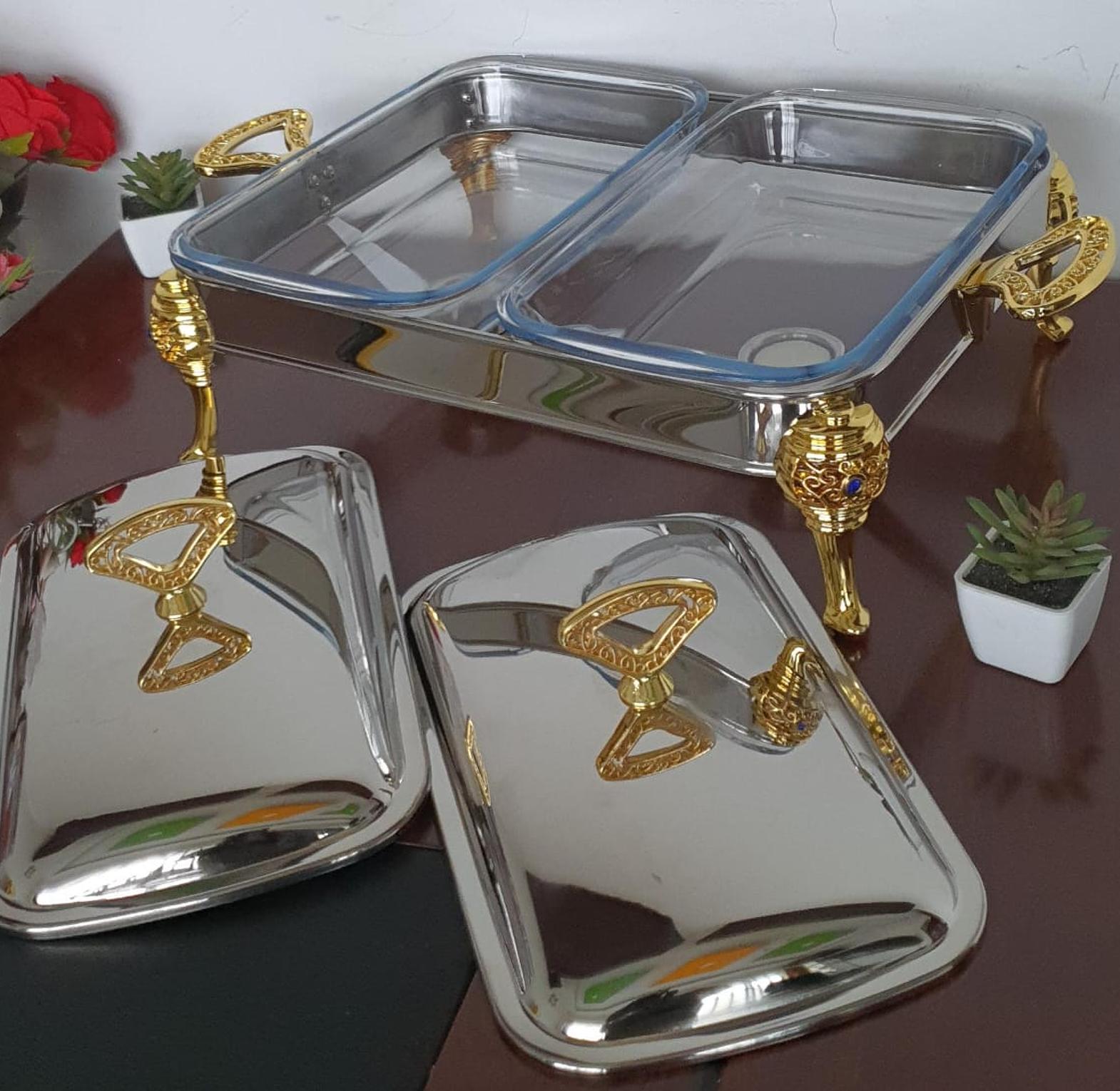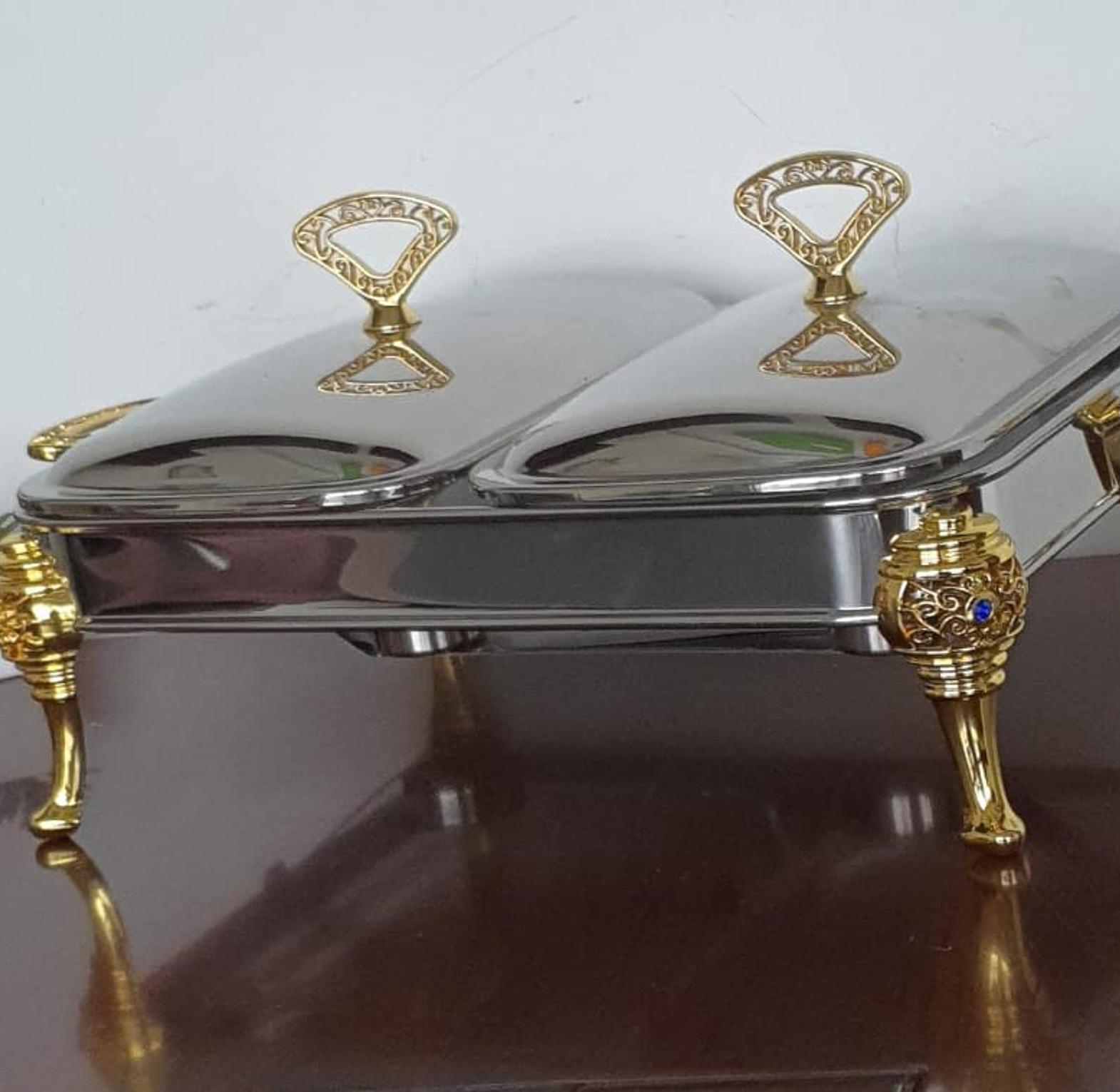 glass bowls; stainless steel cover with golden parts; fixed double burner