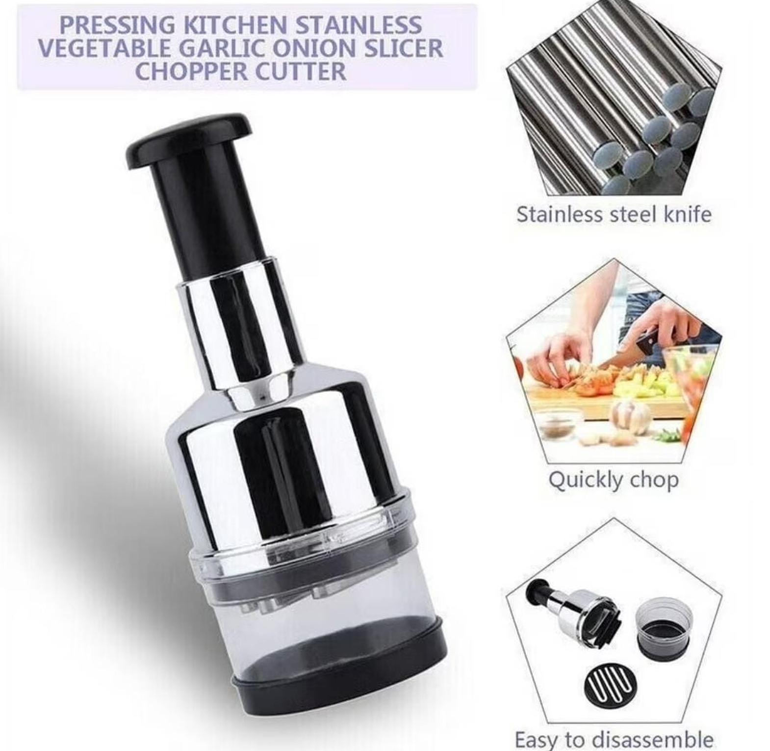 High quality material: Made of stainless steel, non-rust, durable. Wide Application: The chopper dicer is ideal for multi prep food like onions, garlic, nuts, cilantro, vegetables, small salads and more. Easy to Clean: The hand food chopper is easy disassembling for speedy cleanup, simply finish cleaning under running water in 2 minutes, also top dishwasher safe. Simply slap the vegetable chopper to get quickly chopping in the garlic and onions in seconds, no more getting hurt by touching the blades. Save Time: The Food Chopper is equipped with stainless steel blades which make faster chopping, mincing dicing and grinding than a knife. Use the onion chopper directly on your cutting board or included base to get your prep food with less time.