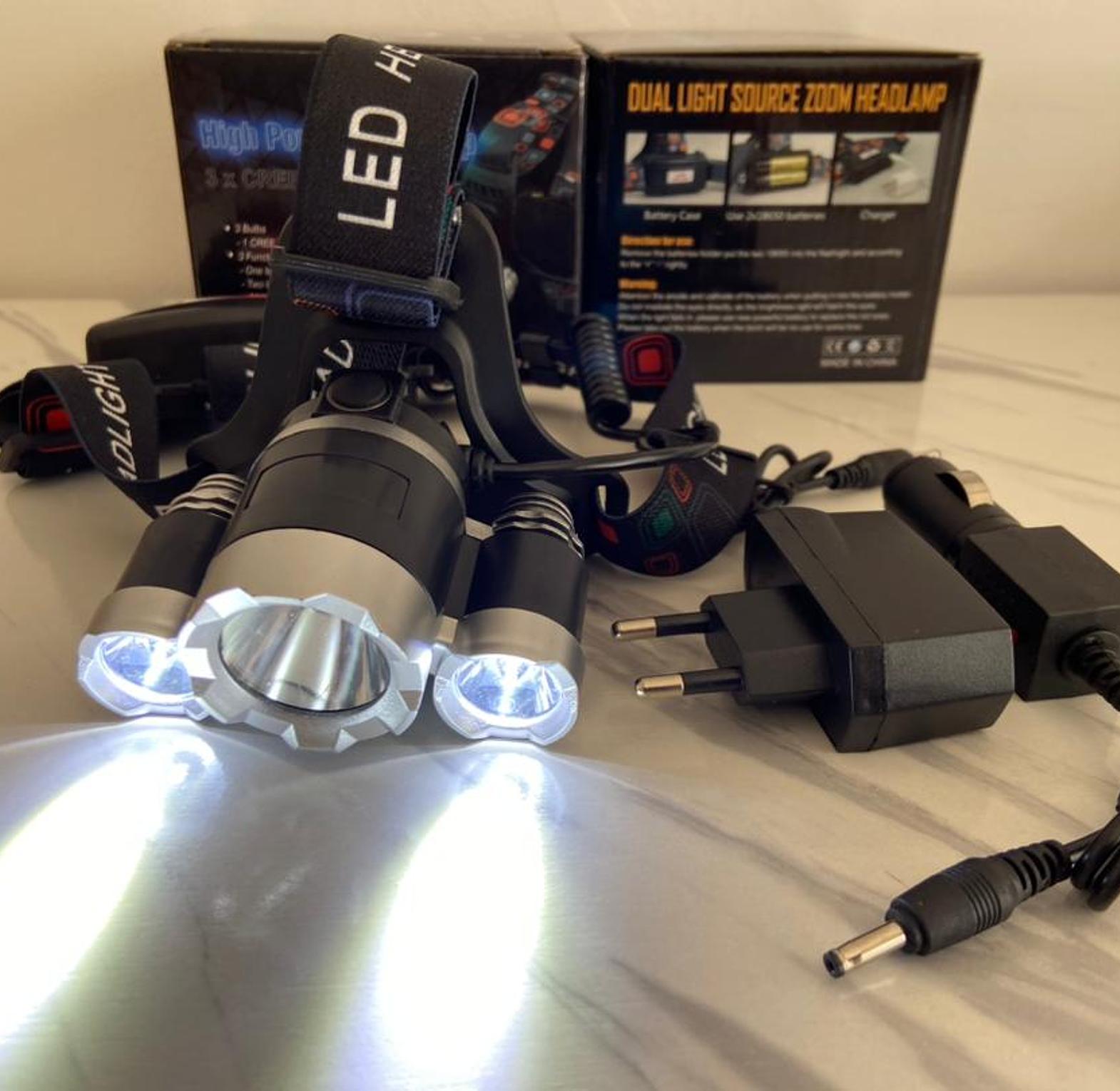 LED headlamp . 3 modes, strobe and waterproof. Comes with 2 batteries,1 AC charger,1 car charger