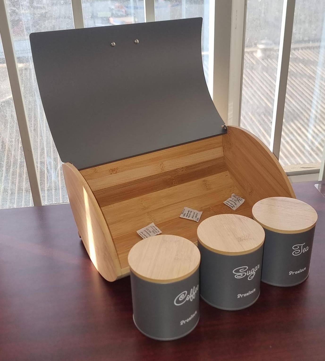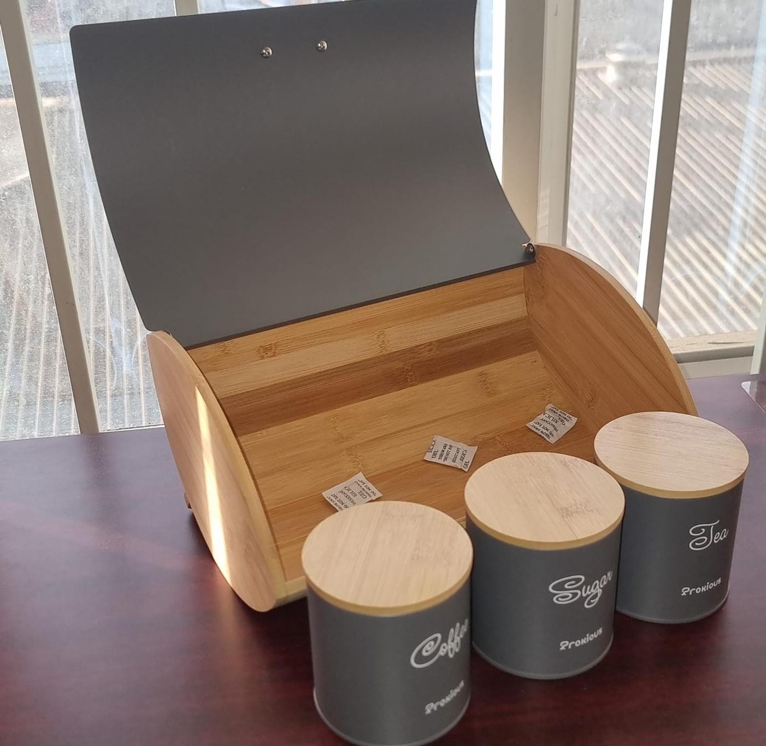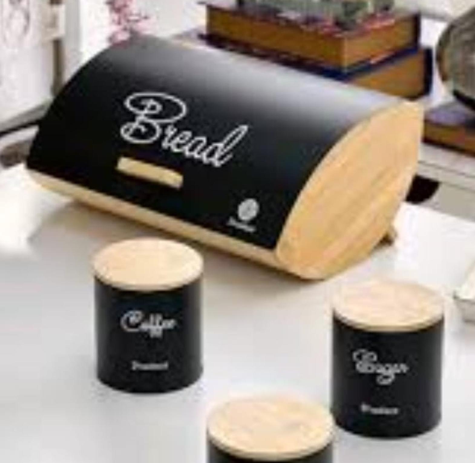 35cmx25cm hemisphere bamboo bread bin plus 3x600ml coffee sugar tea canisters bamboo lid now available in colour black and grey