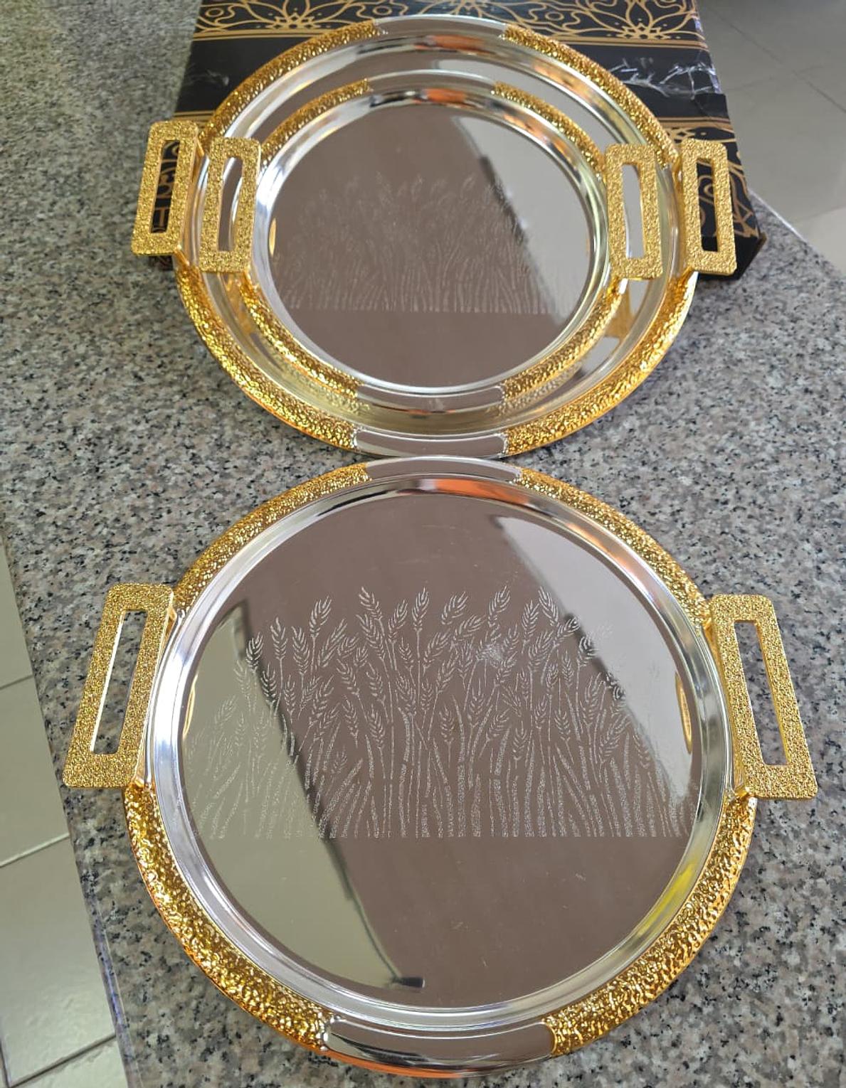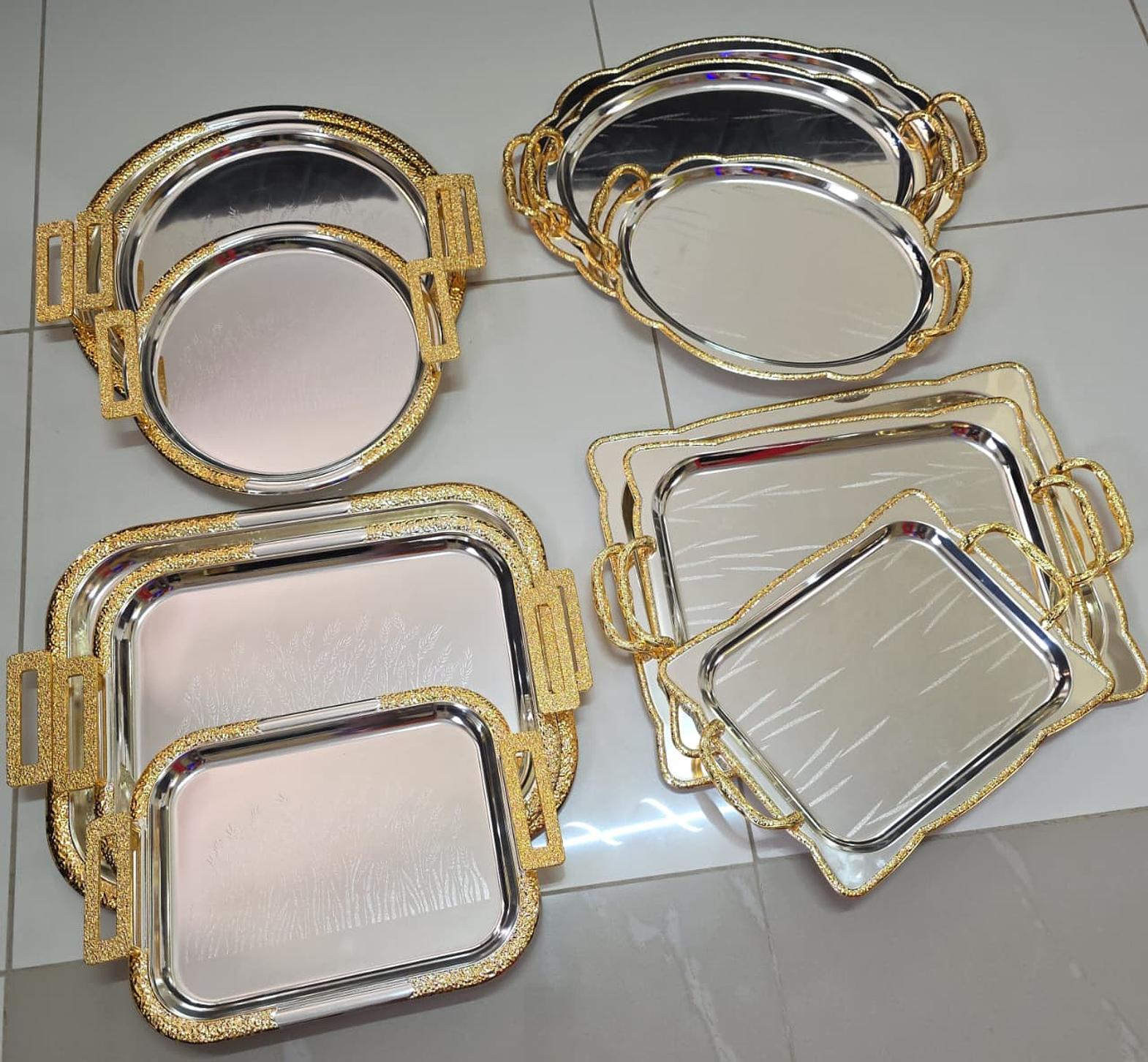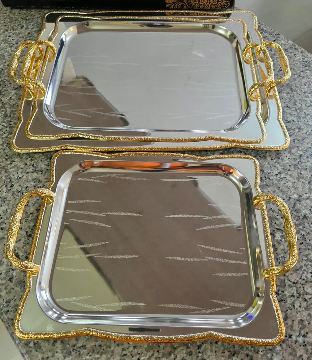 Home Decor Elegant serving Trays. ✴️ High quality 3pcs Customised stainless steel Trays with Gold Handles ✴️Mulit-purpose for Food Fruits & Snacks 💃Serve Every Meal in style.