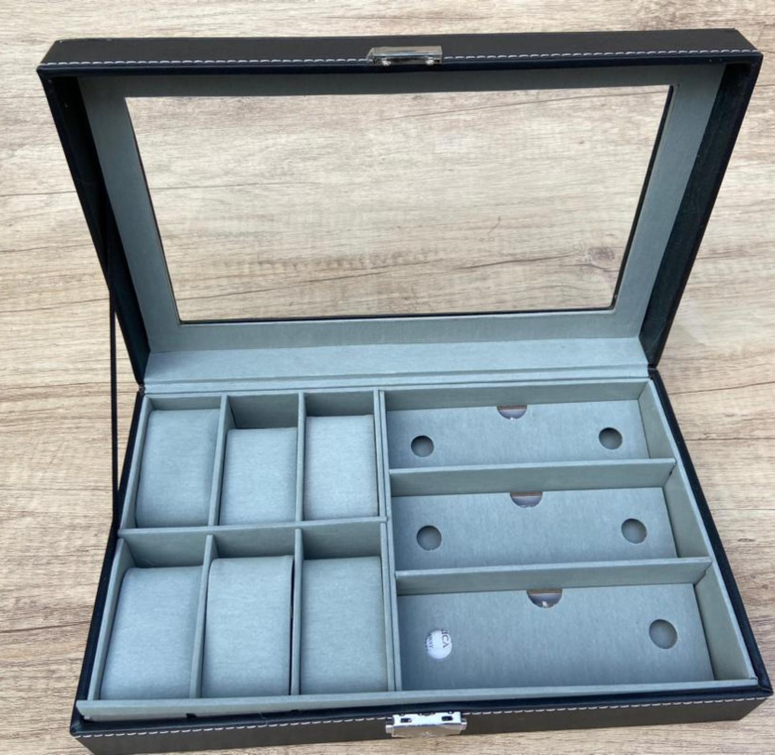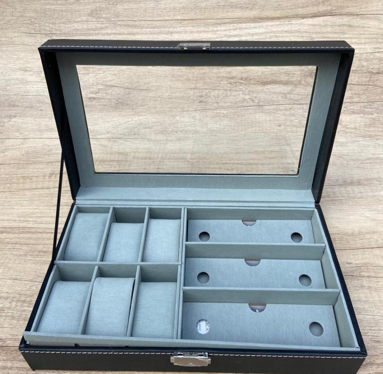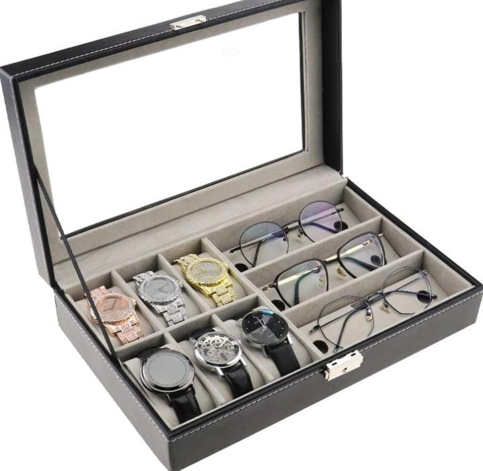 Metal Lock,Black High Grade PU Leather surface,velvet interior and pillows,6 removable velvet pillows,3 pairs of glasses Clear glass top gives you a open view and you can find your favorite treasure in seconds with this unique watch and glasses and jewelry box.Perfect for home and business use, and a wonderful gift idea Suits for storing watches,glasses,jewelry,cuff links,spare links,rings,earrings,bracelets and necklaces