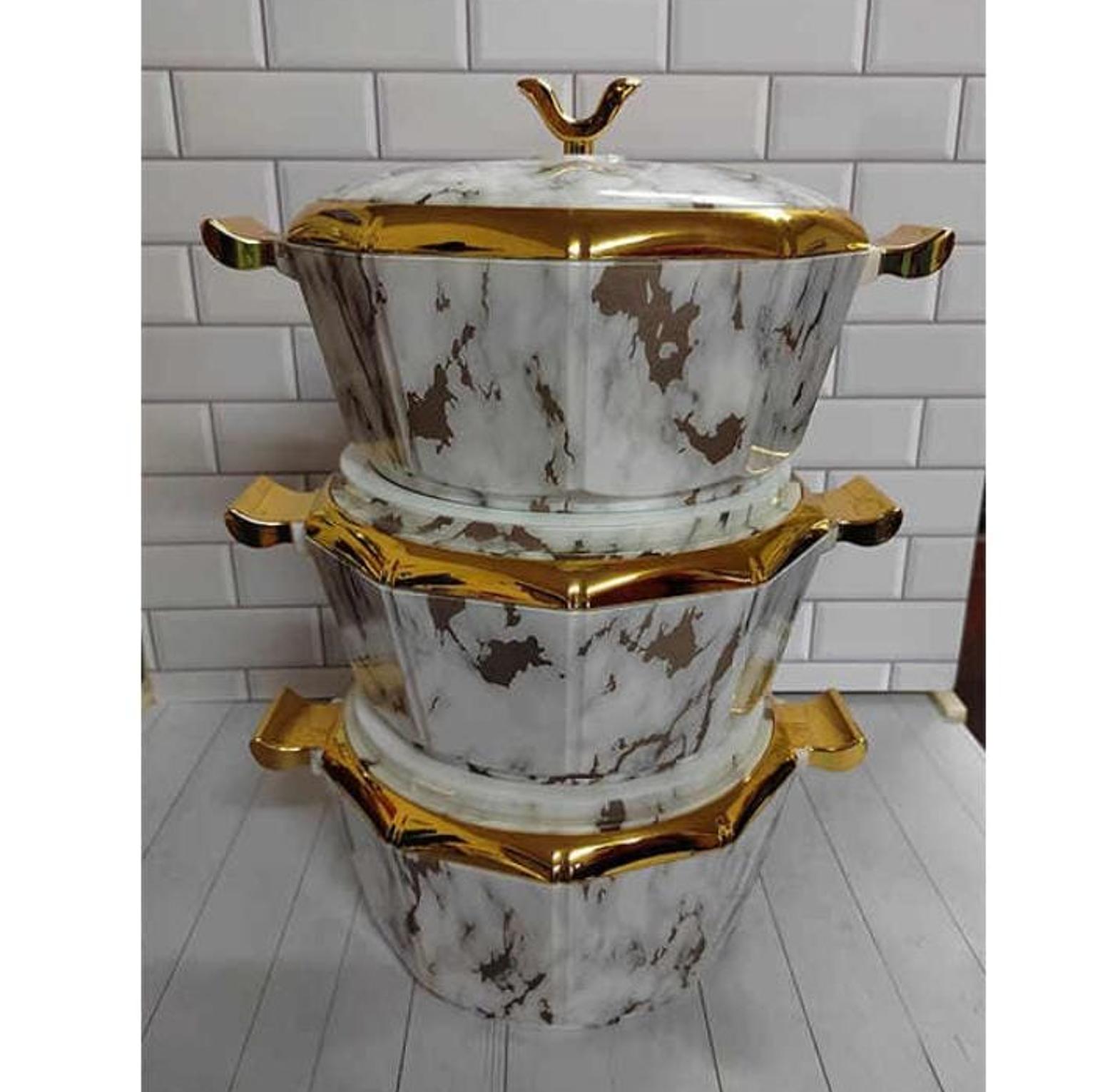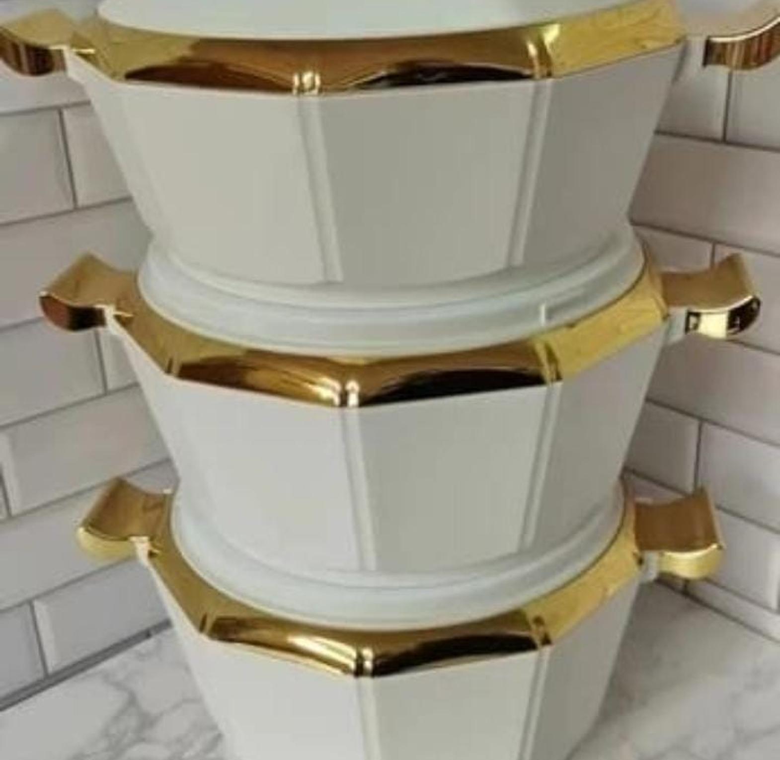 LASTING INSULATION EFFECT – Keep food warm for up to 4 hours and cold for up to 6 hours. Preserve delicious flavors without needing to reheat or cool entrées repeatedly. EASY TO CLEAN & USE – Store and serve food with our lightweight, easy-to-carry food containers that feature easy-to-clean stainless steel inner pots for speedier clean up times while helping to reduce food stains. Each container also comes with an optional lid that can lock and unlock the container to provide a more secure and air-tight fit. TRENDY & ELEGANT DESIGN – Offer a graceful finishing touch for your table during formal and informal occasions with a modern white finish and delicate gold swirl design that’s perfect for any event. STURDY & SAFE – This elegant 3-piece set comes with 2.1 l., 2.6 l., and 3.1 l. containers sizes that are made of strong BPA-free, non-toxic, ABS plastic to help protect your health.