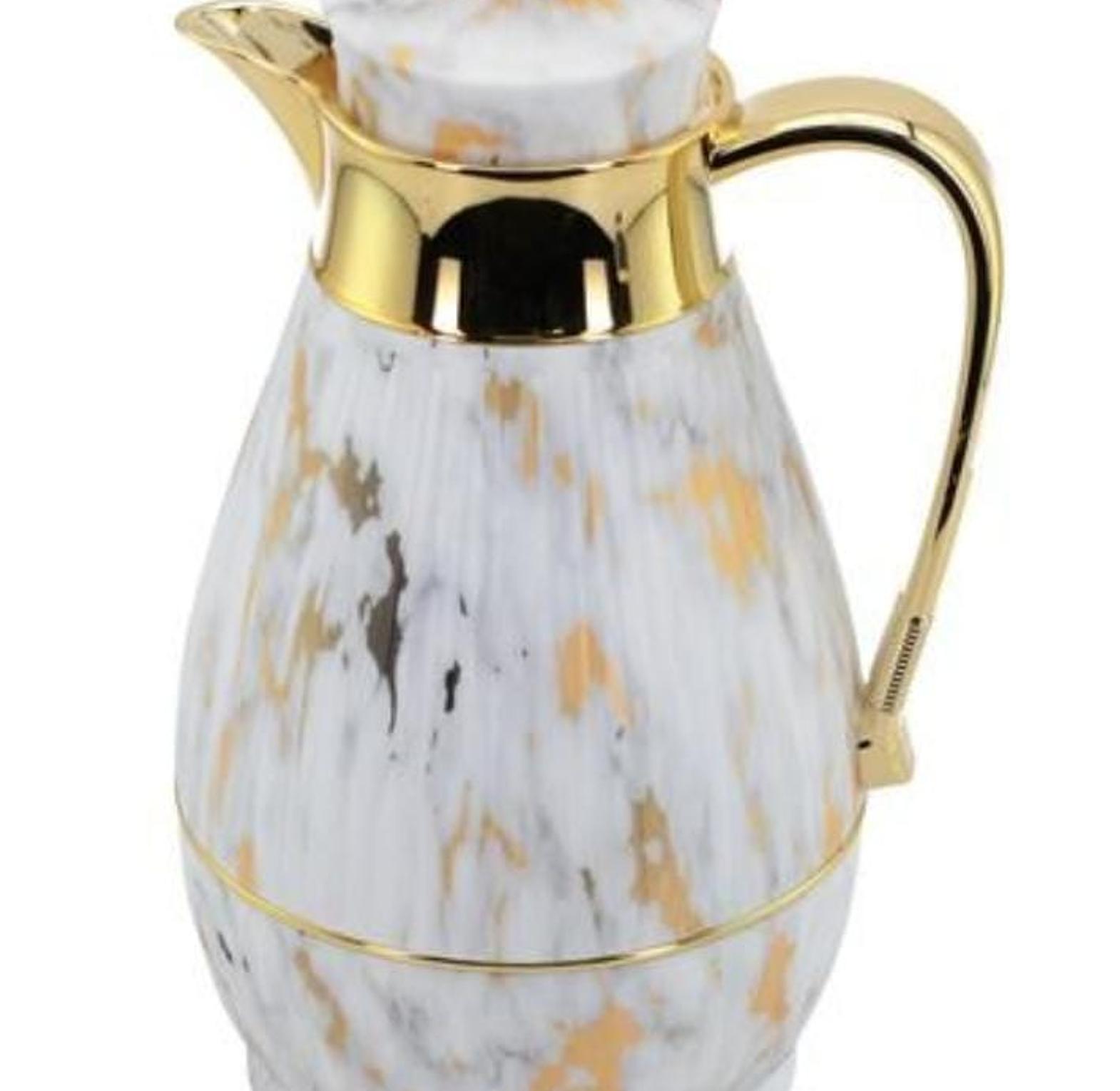 A Better Carafe for a Better Beverage: Elevate any drink with the ZonTraders Moroccan-Inspired Insulated Carafe! Designed to preserve the taste and aroma of coffee, iced tea and more, this coffee thermos carafe will ensure you enjoy every sip. Add Luxury to Your Home: Inspired by exotic, Arabian-style designs, this exquisite water carafe will add luxurious elegance to your home, boutique shop or office. Our coffee pitcher has a gorgeous white body with stunning gold metal accents. Perfect for Any Beverage: This thermal carafe for hot liquids features vacuum insulation technology to keep coffee, tea, water or juice at the perfect temperature. Our insulated pitcher will keep drinks cold for up to 24 hours or hot for up to 12. Craftsmanship for Every Space: With an ABS chrome and gold coating, a pink glass liner, a metal body and food-grade material, this thermal coffee carafe is the ideal way to preserve the freshness of any beverage in your kitchen or hotel.