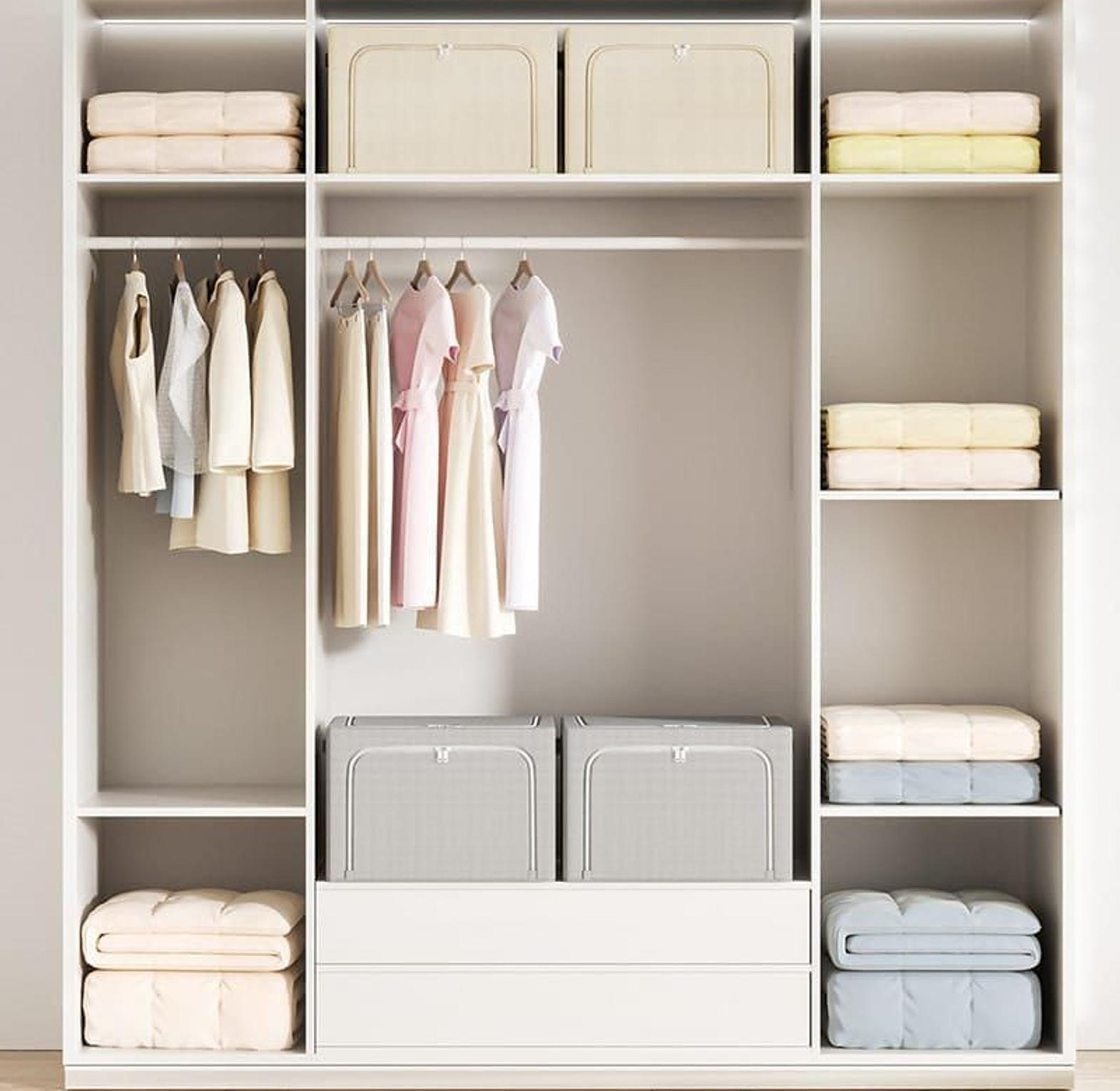 These lidded storage bins are made of thick non-woven fabric with hard cardboard inside for the sides and bottom. The bins with lids won't be deformed even when fully loaded. Sturdy handles on two sides make the fabric storage bins very easy to carry.