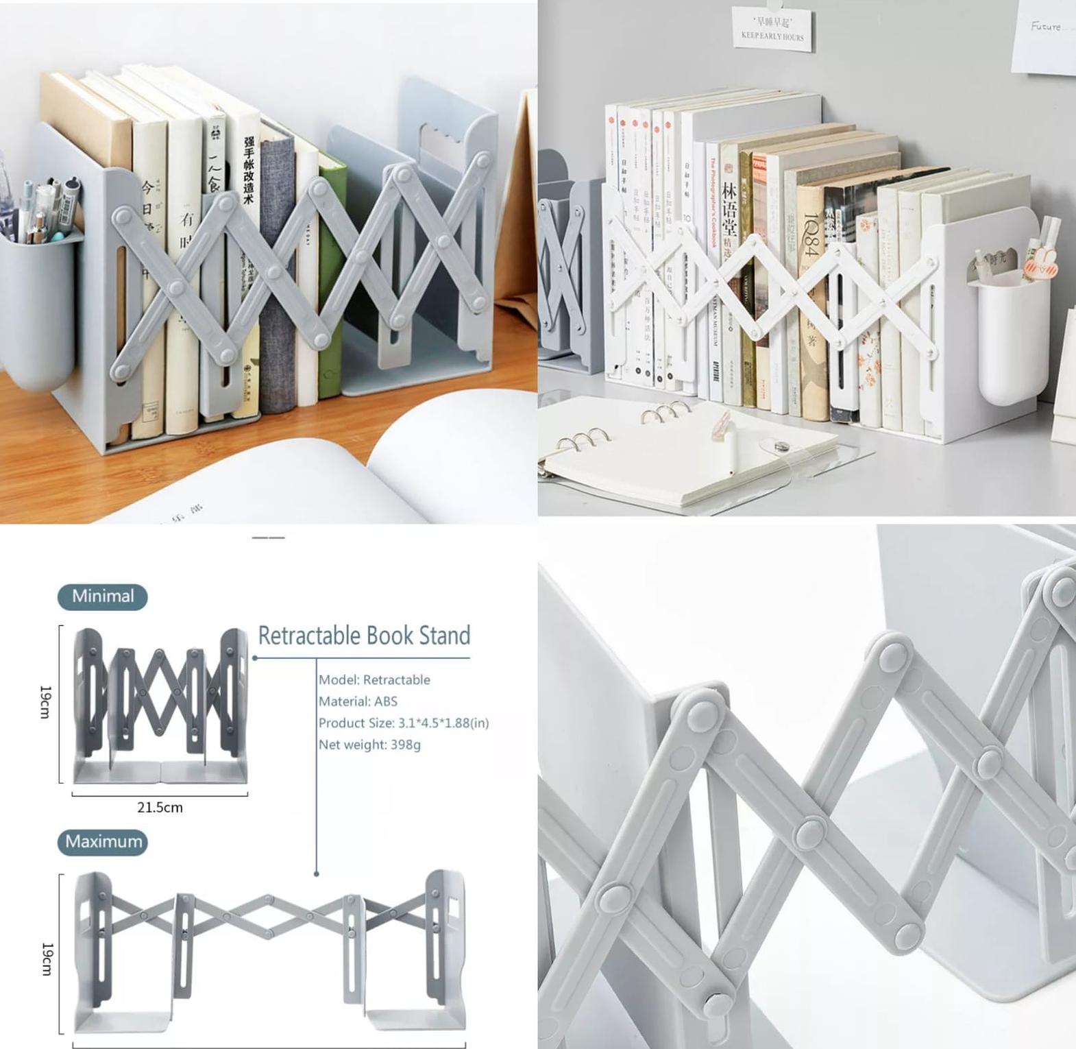Retractable Bookends For Shelves Book Support Stand Set Adjustable Bookshelf With Pen Holder Desk Organizer Office Accessories. Available in white and grey