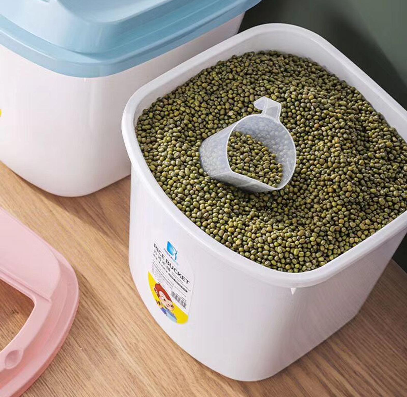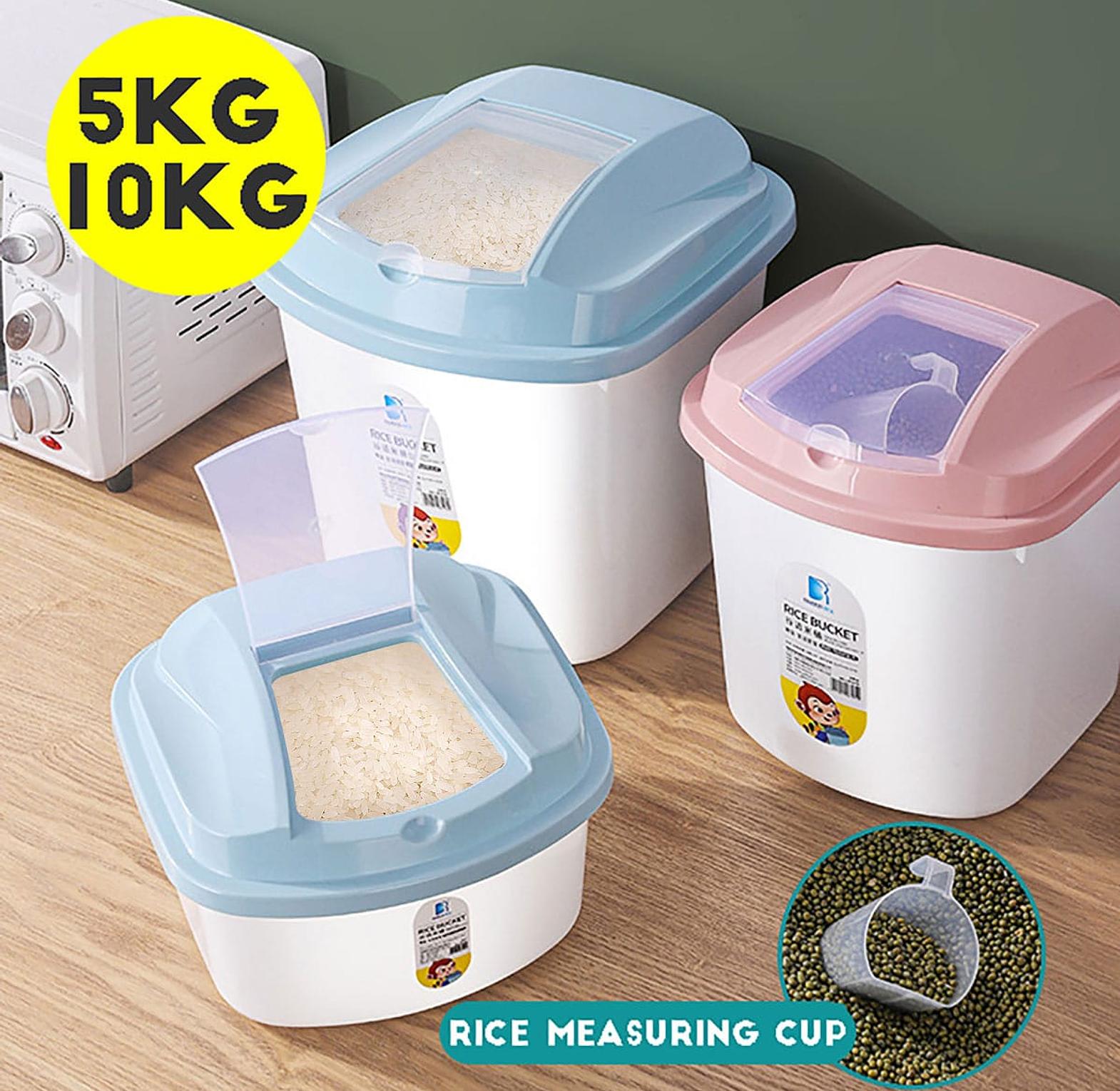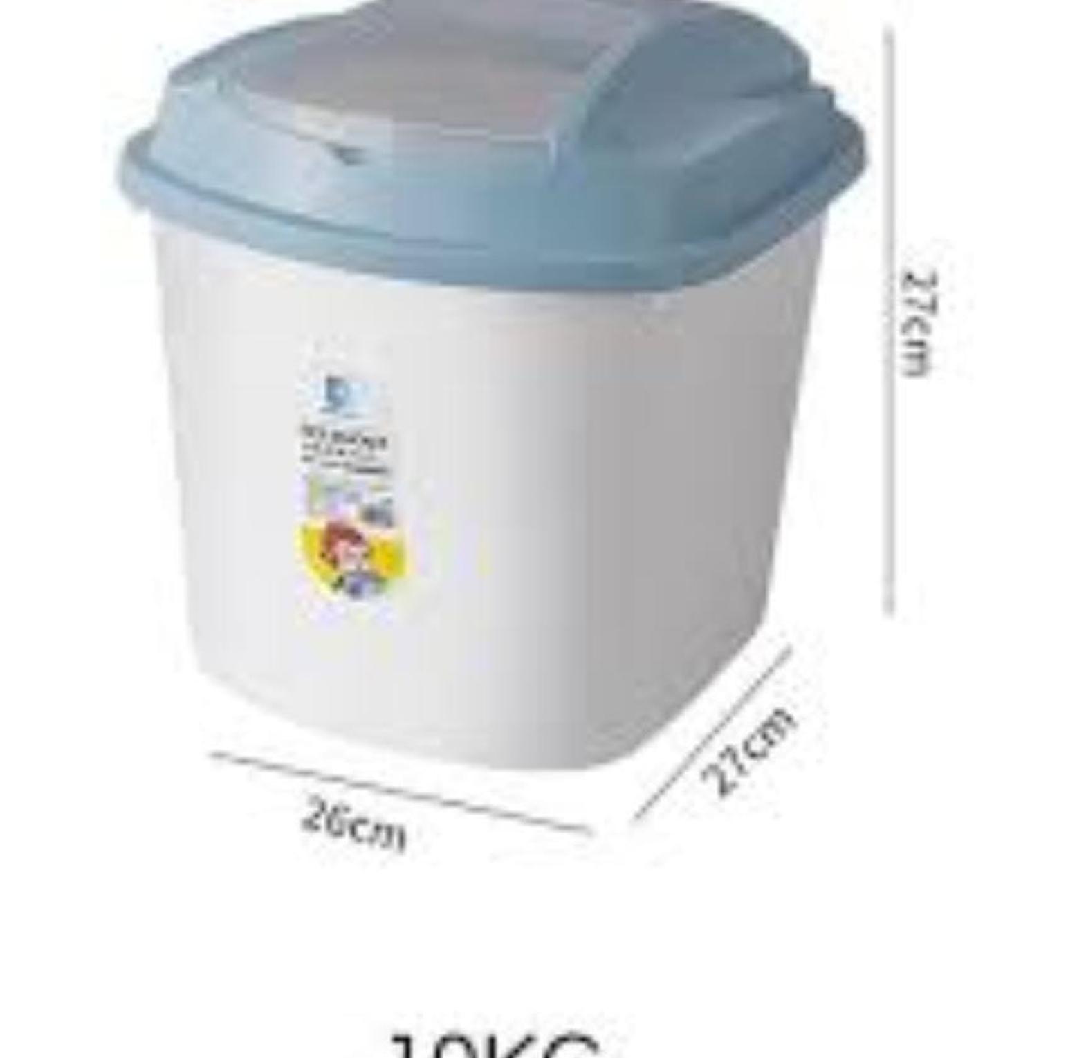 Rice bucket 10kg rice bucket with wheels Comes with a measuring cupMade of hard plastic.Has a pink coverGood for storing cereal and dry food.Labelled in measurement to know which level the rice has reach. Rice bucket 12kg Has wheels With a pink cover Measuring cup Labelled measurements For storing dry food Avoid direct heat Measuring cup Labelled measurements For storing dry food Avoid direct heat
