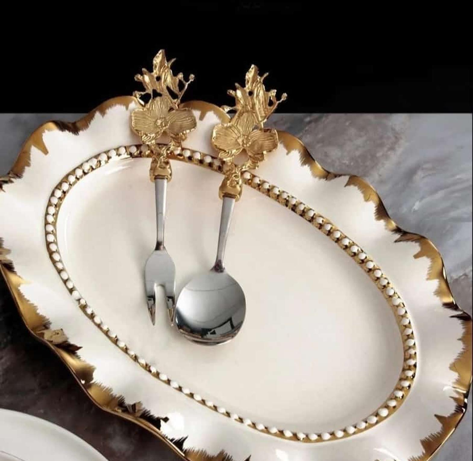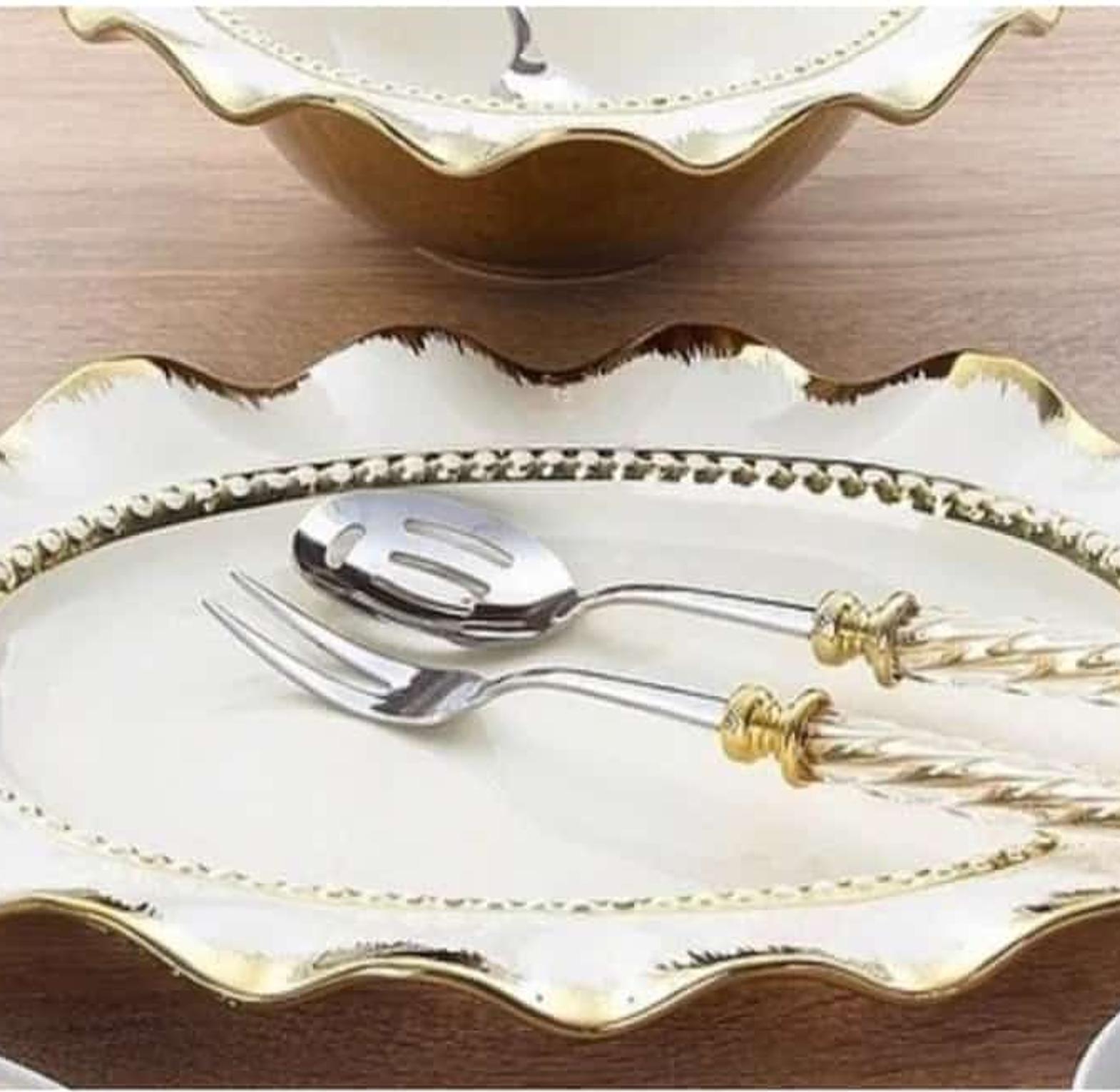 The platter is made of fine porcelain has a wavy gold design it 30m long and 4 cm deep it will help you serve chapati ,salad ,fruits