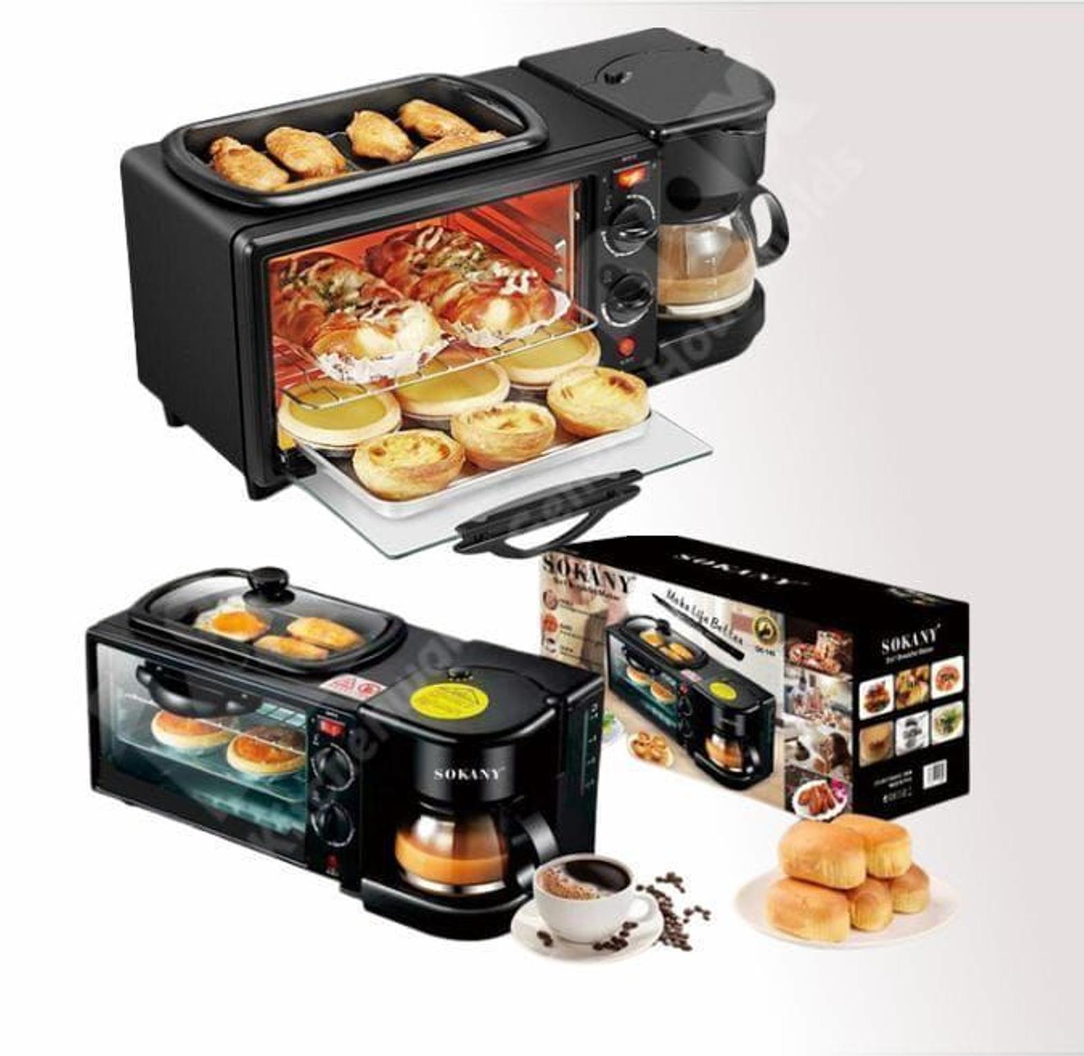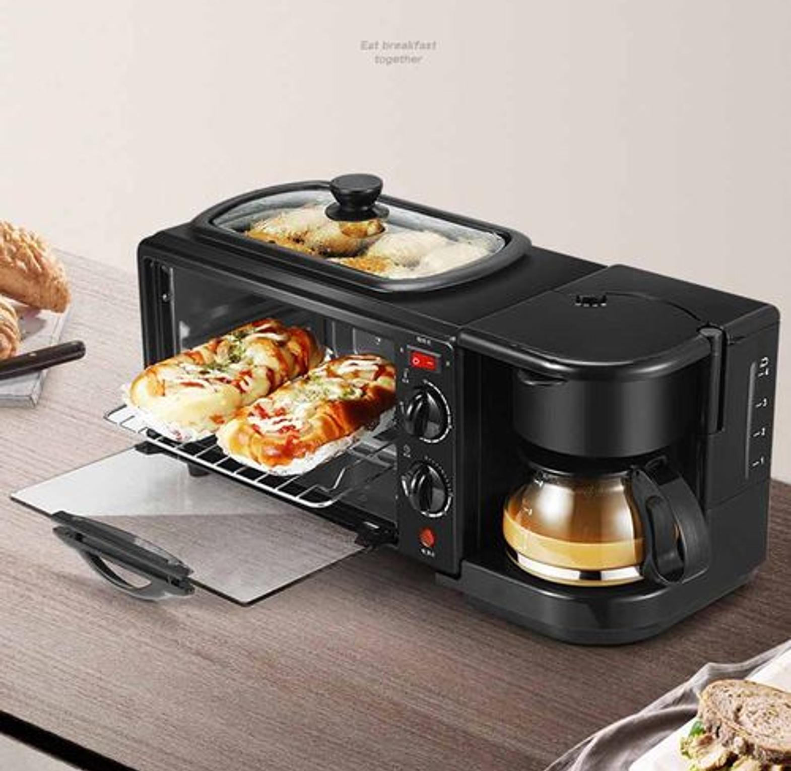 ast breakfast, leisurely afternoon tea, snacks or coffee has never been faster and more convenient to make with this 3-in-1 breakfast maker that features a toaster oven, coffee maker and griddle. (A toaster oven is more energy-efficient than a regular oven, and it can brown and crisp foods in a way a microwave can’t.) You can enjoy coffee or hot chocolate, toast and eggs all prepared by one space saving appliance. The oven has a 60-minute timer, temperature control setting and indicator light. The coffee maker has a four-cup capacity, swing-out filter compartment and pause ‘n’ serve anti-drip feature. The griddle has a 6-inch diameter frying griddle and uses energy and heat from the toaster oven and is perfect for frying eggs and other breakfast foods. With its compact design, stainless steel construction with heat resistant glass that makes it durable, clean up is easy and storage is no-fuss.