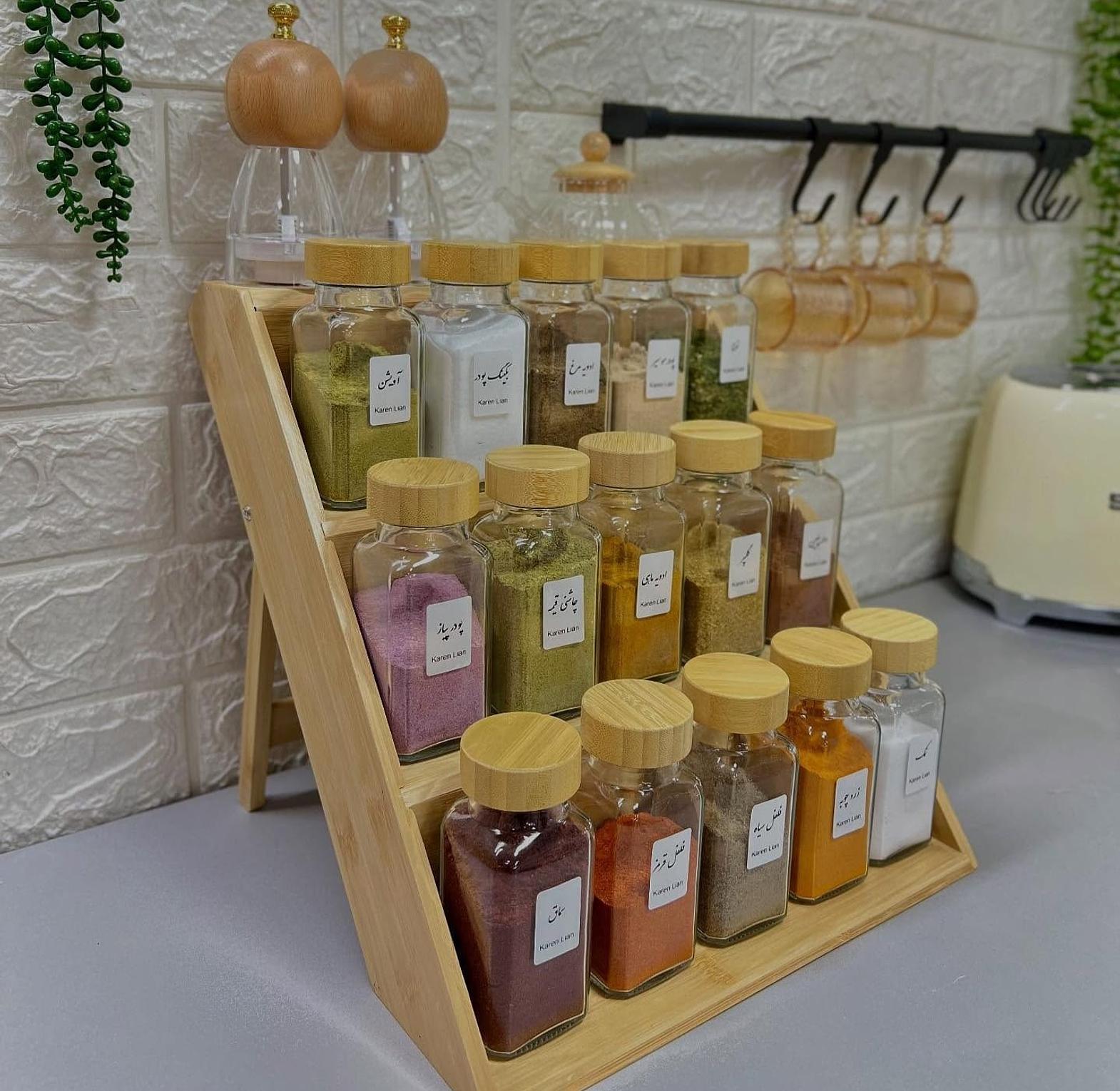 Spice Containers with Bamboo Stand..(Comes with Stickers and Silicon Funnel as well)