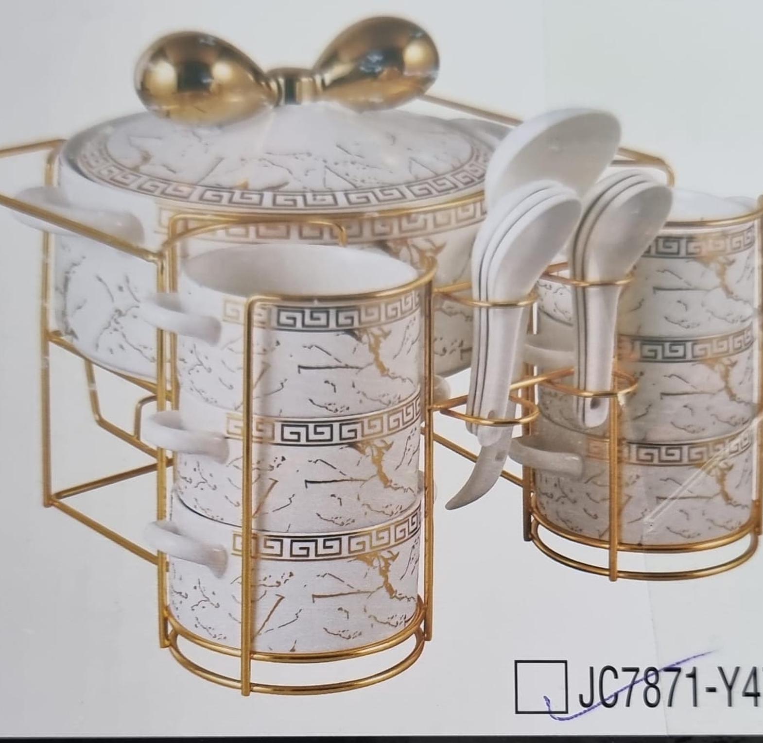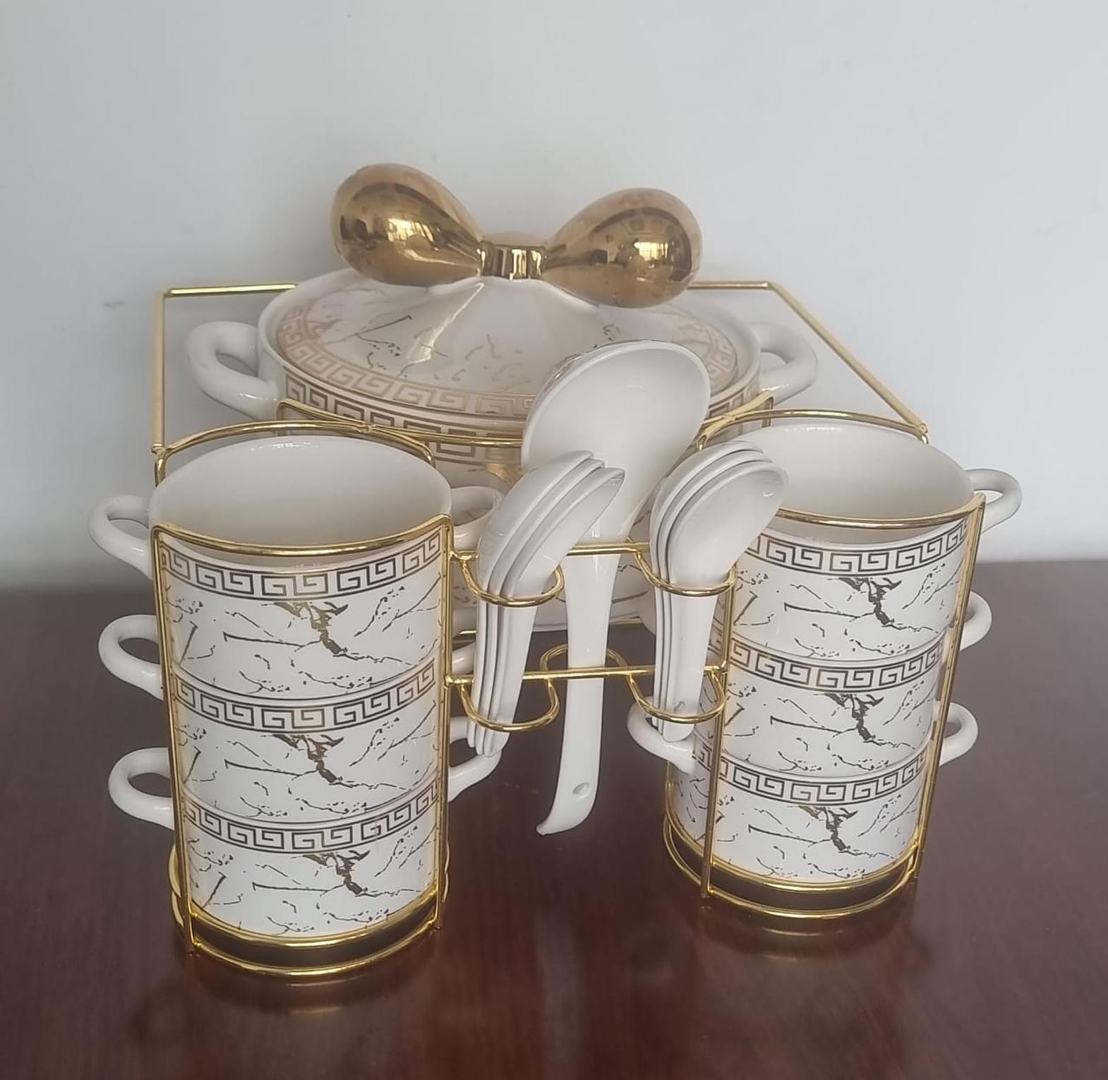 ELEGANT AND UNIQUE- Table Fashion Essentials fancy ceramic soup bowls set is made with exquisite style and design. The set is crafted with detail to make a glossy smooth finish. Gold color is inlaid into the top of the bowls to give it the luxurious special look. The tureen bowl has a fancy crown shaped handle on the lid to complete the elegant look.