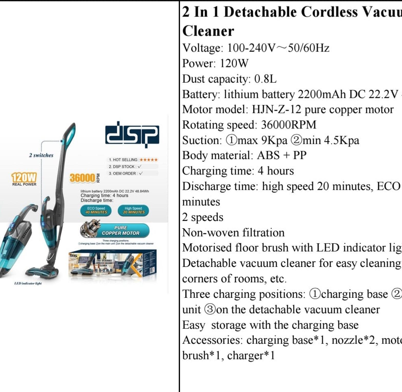 2 in 1 Detachable cordless Vaccum cleaner: Can be used separately after dissasembly. ✴️Easy cleaning of sofas, corners of rooms,etc. ✴️Motorised floor Brush With LED indicator light. ✴️Charging time 4 Hours. ✴️Easy Storage with Charging Base.