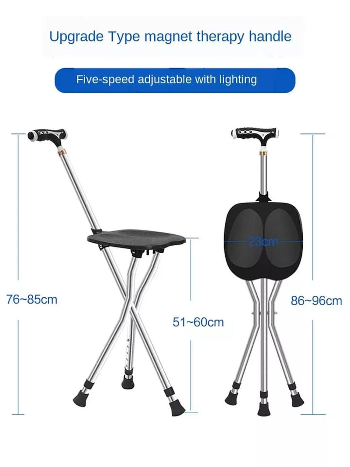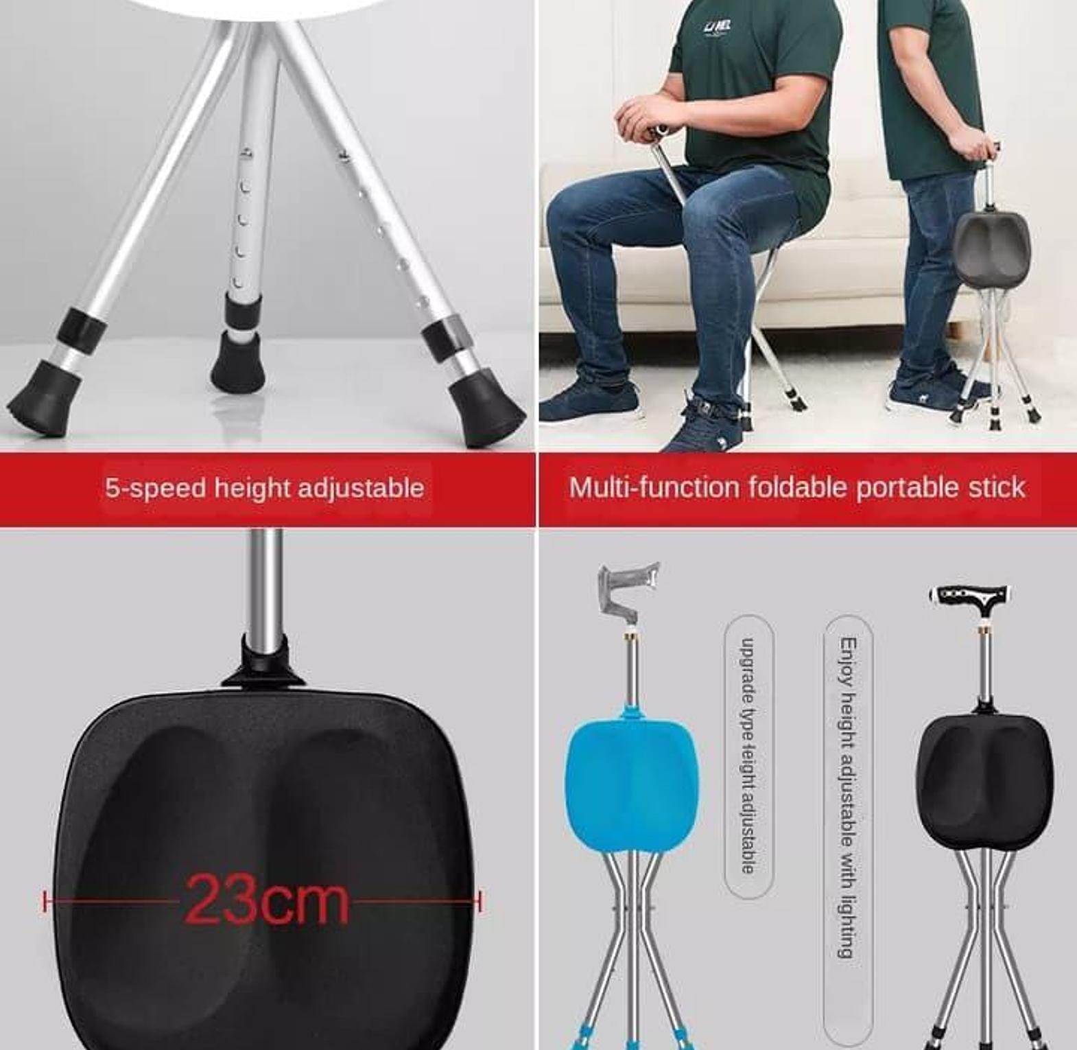 walking stick with an integrated folding seat, often referred to as a "walking stick with seat" or "cane stool". It serves as both a mobility aid for support while walking and a portable seat for resting when needed. It's designed to be lightweight and portable, often featuring a foldable design for easy carrying and storage.