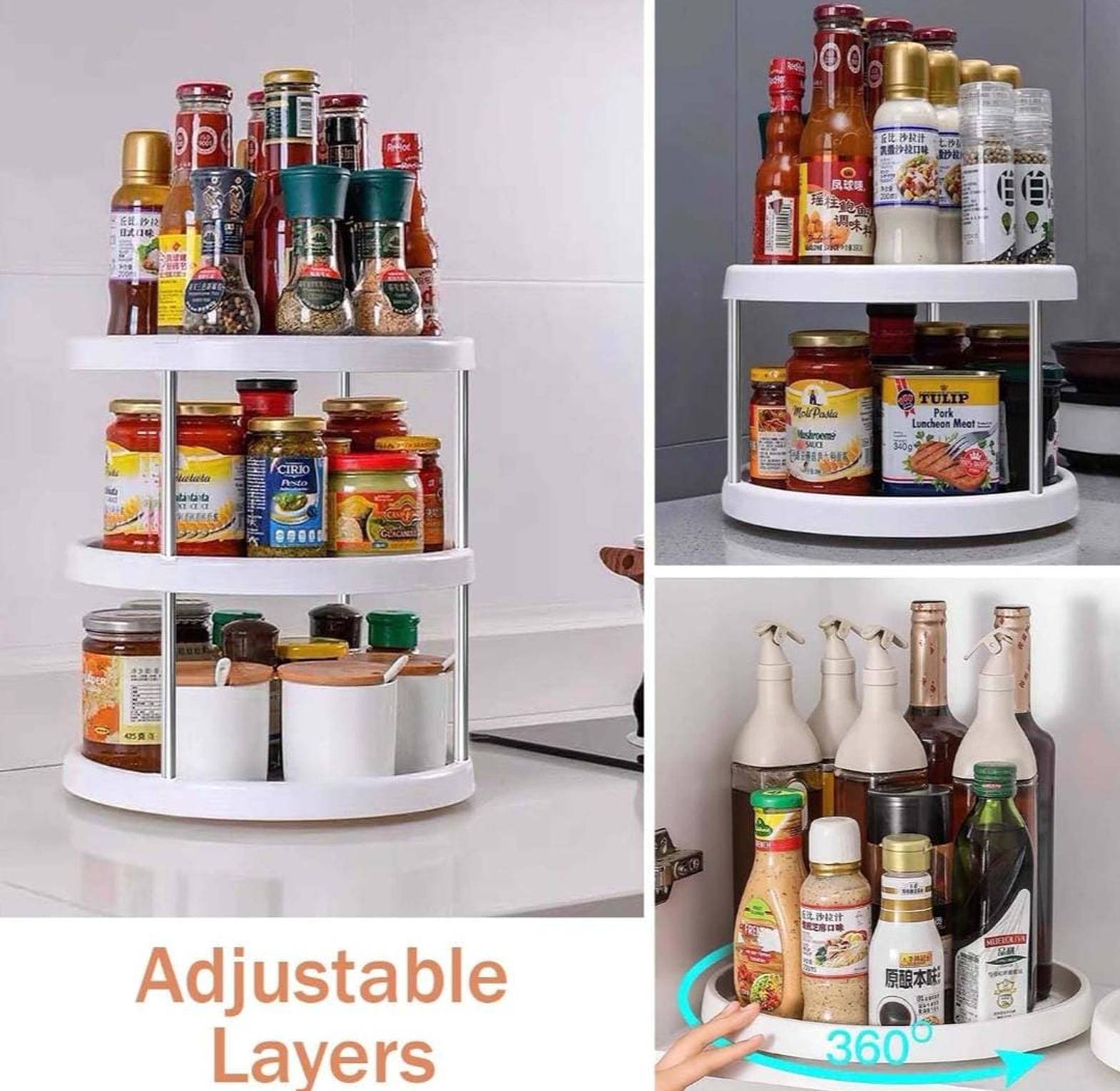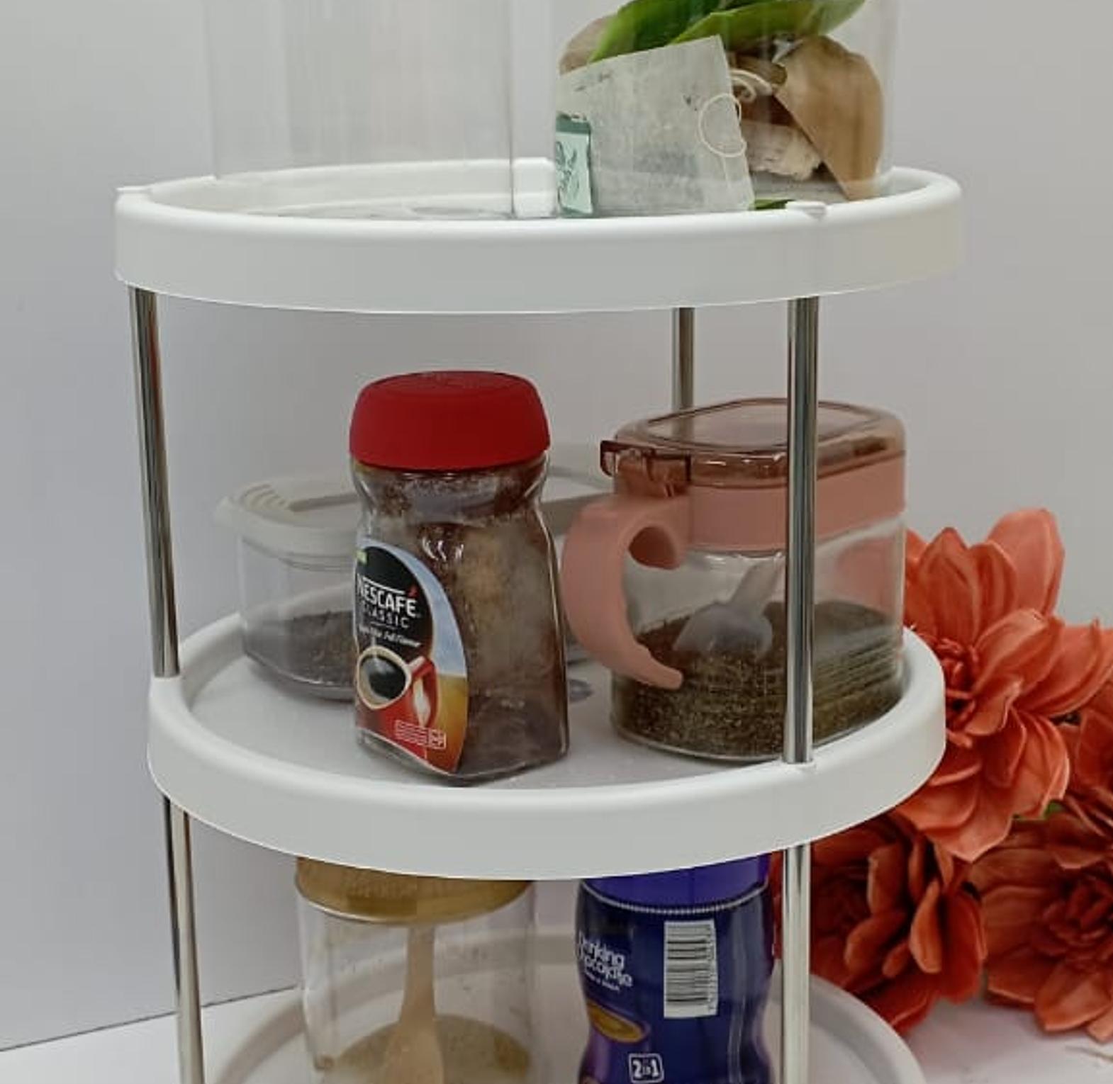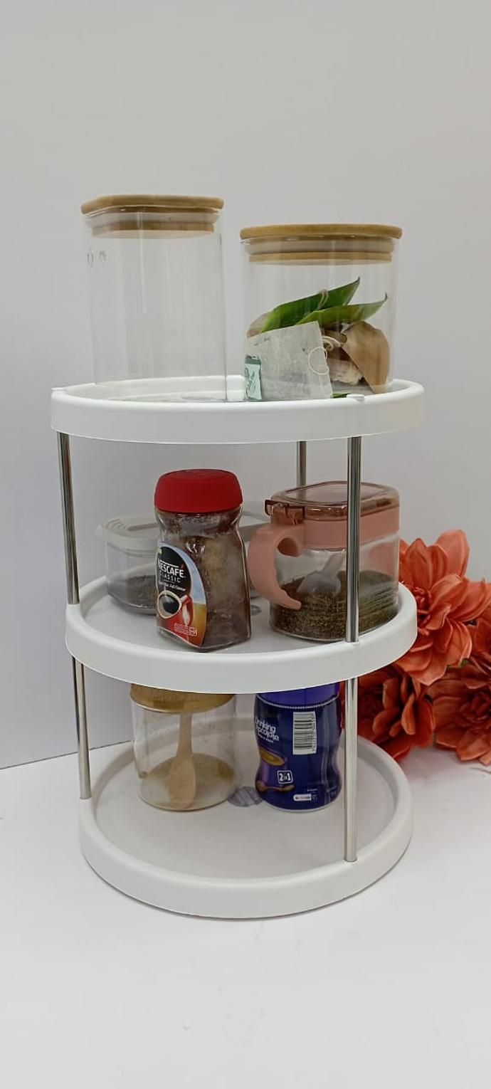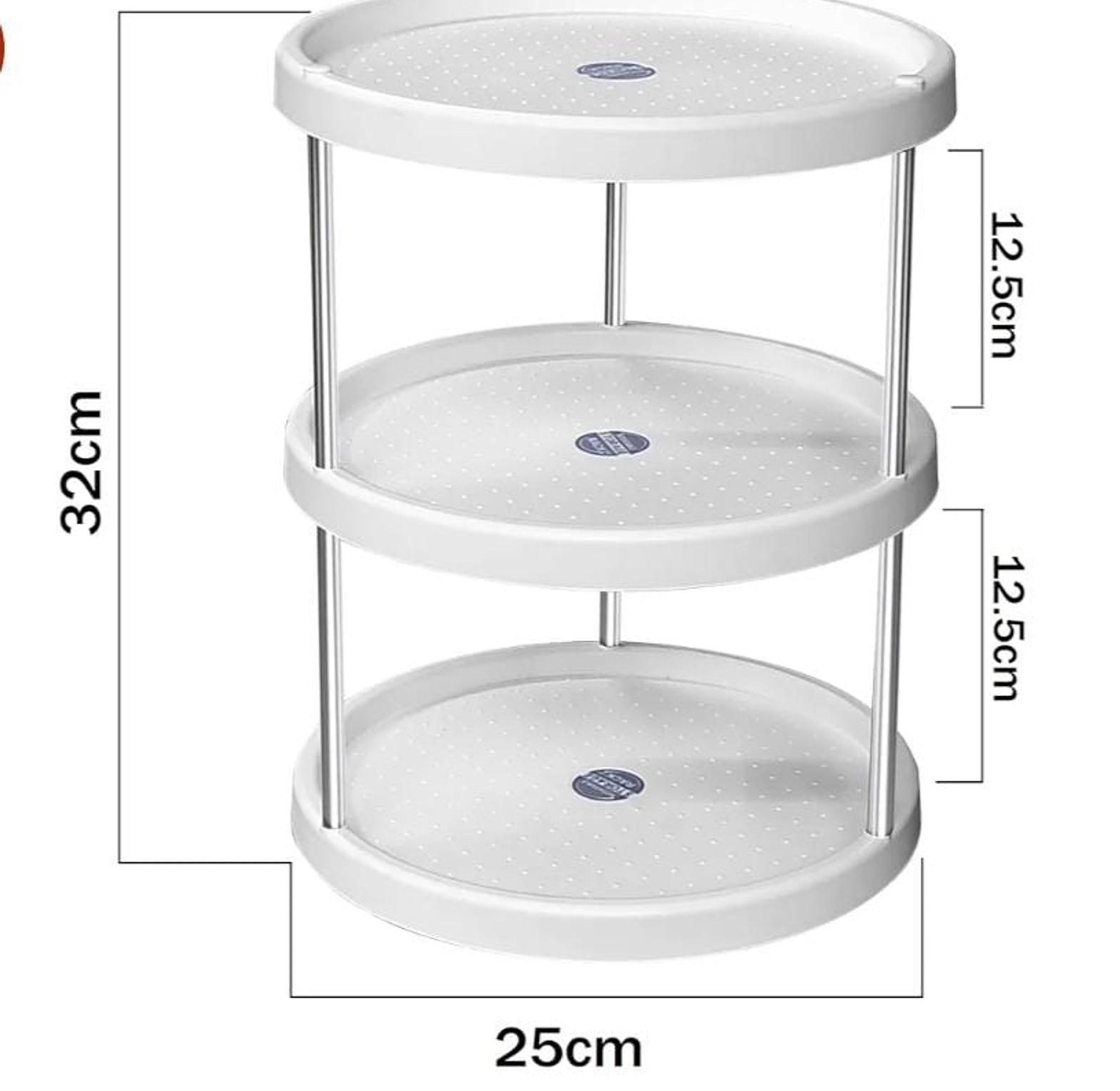 3 tier rotating kitchen storage rack available 🟢 Material: plastic with stainless steel stand 🟢Colours : white available
